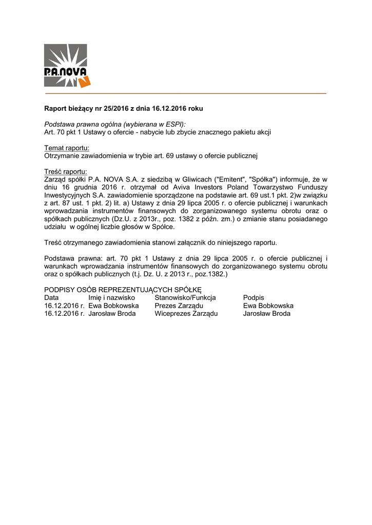 dniu 16 grudnia 2016 r. otrzymał od Aviva Investors Poland Towarzystwo Funduszy