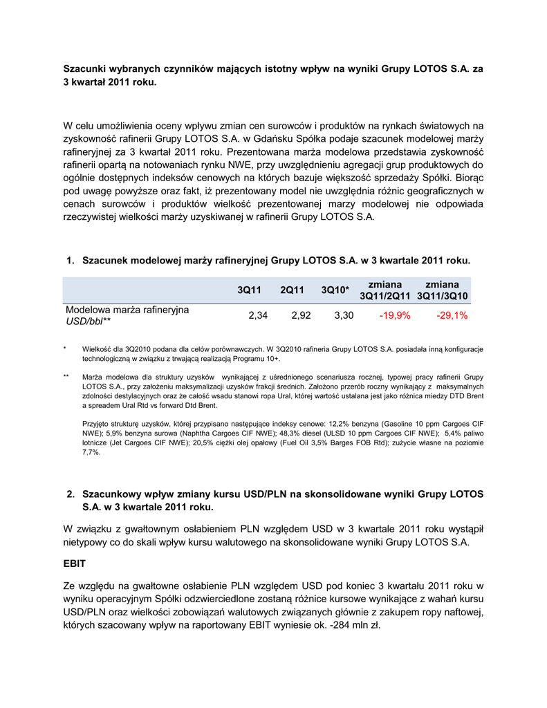 Szacunki wybranych czynników mających istotny wpływ na wyniki Grupy LOTOS S.A. za 3 kwartał 2011 roku. W celu umożliwienia oceny wpływu zmian cen surowców i produktów na rynkach światowych na zyskowność rafinerii Grupy LOTOS S.A. w Gdańsku Spółka podaje szacunek modelowej marży rafineryjnej za 3 kwartał 2011 roku. Prezentowana marża modelowa przedstawia zyskowność rafinerii opartą na notowaniach rynku NWE, przy uwzględnieniu agregacji grup produktowych do ogólnie dostępnych indeksów cenowych na których bazuje większość sprzedaży Spółki. Biorąc pod uwagę powyższe oraz fakt, iż prezentowany model nie uwzględnia różnic geograficznych w cenach surowców i produktów wielkość prezentowanej marzy modelowej nie odpowiada rzeczywistej wielkości marży uzyskiwanej w rafinerii Grupy LOTOS S.A. 1. Szacunek modelowej marży rafineryjnej Grupy LOTOS S.A. w 3 kwartale 2011 roku. 3Q11 Modelowa marża rafineryjna USD/bbl** 2,34 2Q11 2,92 3Q10* 3,30 zmiana zmiana 3Q11/2Q11 3Q11/3Q10 -19,9% -29,1% * Wielkość dla 3Q2010 podana dla celów porównawczych. W 3Q2010 rafineria Grupy LOTOS S.A. posiadała inną konfiguracje technologiczną w związku z trwającą realizacją Programu 10+. ** Marża modelowa dla struktury uzysków wynikającej z uśrednionego scenariusza rocznej, typowej pracy rafinerii Grupy LOTOS S.A., przy założeniu maksymalizacji uzysków frakcji średnich. Założono przerób roczny wynikający z maksymalnych zdolności destylacyjnych oraz że całość wsadu stanowi ropa Ural, której wartość ustalana jest jako różnica miedzy DTD Brent a spreadem Ural Rtd vs forward Dtd Brent. Przyjęto strukturę uzysków, której przypisano następujące indeksy cenowe: 12,2% benzyna (Gasoline 10 ppm Cargoes CIF NWE); 5,9% benzyna surowa (Naphtha Cargoes CIF NWE); 48,3% diesel (ULSD 10 ppm Cargoes CIF NWE); 5,4% paliwo lotnicze (Jet Cargoes CIF NWE); 20,5% ciężki olej opałowy (Fuel Oil 3,5% Barges FOB Rtd); zużycie własne na poziomie 7,7%. 2. Szacunkowy wpływ zmiany kursu USD/PLN na skonsolidowane wyniki Grupy LOTOS S.A. w 3 kwartale 2011 roku. W związku z gwałtownym osłabieniem PLN względem USD w 3 kwartale 2011 roku wystąpił nietypowy co do skali wpływ kursu walutowego na skonsolidowane wyniki Grupy LOTOS S.A. EBIT Ze względu na gwałtowne osłabienie PLN względem USD pod koniec 3 kwartału 2011 roku w wyniku operacyjnym Spółki odzwierciedlone zostaną różnice kursowe wynikające z wahań kursu USD/PLN oraz wielkości zobowiązań walutowych związanych głównie z zakupem ropy naftowej, których szacowany wpływ na raportowany EBIT wyniesie ok. -284 mln zł. Jednocześnie pomimo stabilnych cen surowców i produktów wyrażonych w USD, ich wzrost wyrażony w PLN przyczynił się do powstania tzw. efektu LIFO, zwiększającego raportowany wynik EBIT o ok. 124 mln PLN. Działalność finansowa Przeszacowanie zadłużenia Grupy Kapitałowej Grupy LOTOS S.A. denominowanego w USD podyktowane osłabieniem PLN względem USD, przy uwzględnieniu stosowanych zasad rachunkowości (rachunkowość zabezpieczeń) wpłynie negatywnie na wysokość salda z działalności finansowej Spółki na poziomie ok. -360 mln PLN. Wartości oraz informacje zawarte w powyższej informacji mają charakter szacunkowy i mogą się różnic od wartości, które zostaną opublikowane w skonsolidowanym sprawozdaniu finansowym Grupy LOTOS S.A. za 3 kwartał 2011 roku.