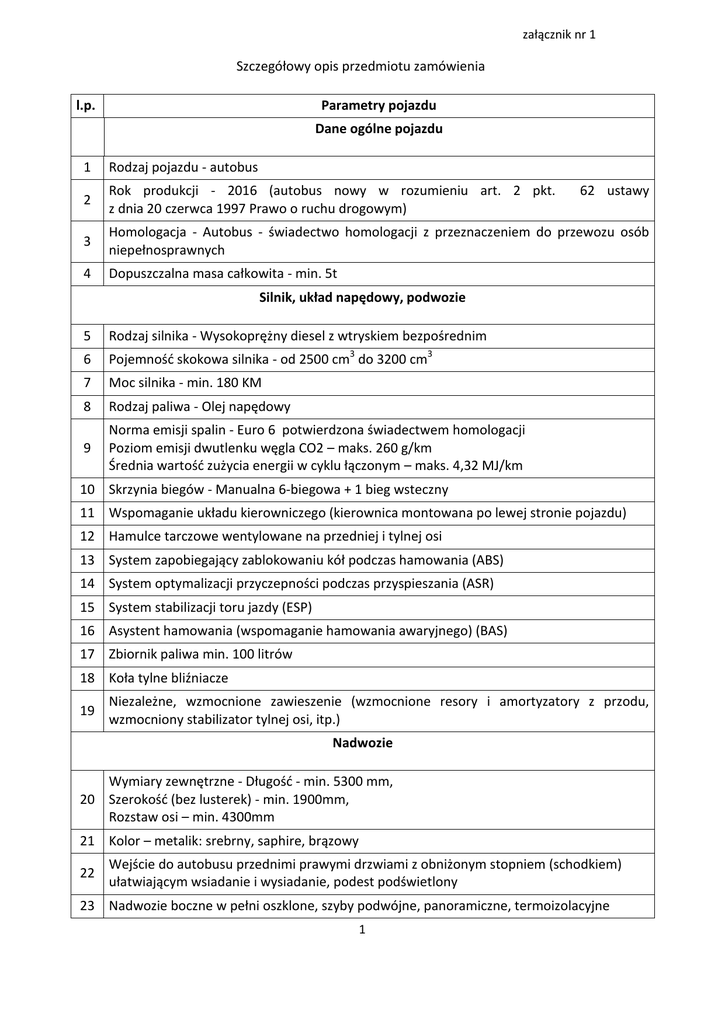 załącznik nr 1 Szczegółowy opis przedmiotu zamówienia l.p. Parametry pojazdu Dane ogólne pojazdu 1 Rodzaj pojazdu - autobus 2 Rok produkcji - 2016 (autobus nowy w rozumieniu art. 2 pkt. z dnia 20 czerwca 1997 Prawo o ruchu drogowym) 3 Homologacja - Autobus - świadectwo homologacji z przeznaczeniem do przewozu osób niepełnosprawnych 4 Dopuszczalna masa całkowita - min. 5t 62 ustawy Silnik, układ napędowy, podwozie 5 Rodzaj silnika - Wysokoprężny diesel z wtryskiem bezpośrednim 6 Pojemność skokowa silnika - od 2500 cm3 do 3200 cm3 7 Moc silnika - min. 180 KM 8 Rodzaj paliwa - Olej napędowy 9 Norma emisji spalin - Euro 6 potwierdzona świadectwem homologacji Poziom emisji dwutlenku węgla CO2 – maks. 260 g/km Średnia wartość zużycia energii w cyklu łączonym – maks. 4,32 MJ/km 10 Skrzynia biegów - Manualna 6-biegowa + 1 bieg wsteczny 11 Wspomaganie układu kierowniczego (kierownica montowana po lewej stronie pojazdu) 12 Hamulce tarczowe wentylowane na przedniej i tylnej osi 13 System zapobiegający zablokowaniu kół podczas hamowania (ABS) 14 System optymalizacji przyczepności podczas przyspieszania (ASR) 15 System stabilizacji toru jazdy (ESP) 16 Asystent hamowania (wspomaganie hamowania awaryjnego) (BAS) 17 Zbiornik paliwa min. 100 litrów 18 Koła tylne bliźniacze 19 Niezależne, wzmocnione zawieszenie (wzmocnione resory i amortyzatory z przodu, wzmocniony stabilizator tylnej osi, itp.) Nadwozie Wymiary zewnętrzne - Długość - min. 5300 mm, 20 Szerokość (bez lusterek) - min. 1900mm, Rozstaw osi – min. 4300mm 21 Kolor – metalik: srebrny, saphire, brązowy 22 Wejście do autobusu przednimi prawymi drzwiami z obniżonym stopniem (schodkiem) ułatwiającym wsiadanie i wysiadanie, podest podświetlony 23 Nadwozie boczne w pełni oszklone, szyby podwójne, panoramiczne, termoizolacyjne 1 załącznik nr 1 Szczegółowy opis przedmiotu zamówienia 24 Szyba przednia ogrzewana, ze szkła klejonego z filtrem 25 Wysokość mierzona od linii podłogowej do sufitu nie mniej niż 1850 mm 26 Wysokość mierzona od jezdni do płyty podłogowej jak najniższa zapewniająca komfort wsiadania i bezpieczeństwo osób niepełnosprawnych 27 Światła obrysowe 28 Chlapacze 29 Dodatkowe kierunkowskazy dachowe 30 Okna w drzwiach tylnych, ogrzewane, przyciemniane 31 Elektrycznie sterowane i podgrzewane lusterka zewnętrzne, ze zintegrowanymi kierunkowskazami 32 Światła do jazdy dziennej LED 33 Światła przeciwmgłowe z tyłu i przodu pojazdu 34 Dodatkowe trzecie światło hamowania STOP 35 Malowanie zderzaków , listew bocznych , lusterek w kolorze nadwozia 36 Oznakowanie pojazdu z przodu i tyłu symbolem „inwalidzi” Wyposażenie Ilość miejsc siedzących 19+1 (kierowca) z opcją umożliwiającą łatwy demontaż trzech foteli 37 pasażerskich znajdujących się na szynach podłogowych umożliwiających kotwiczenie wózków inwalidzkich (atestowane) 38 Komfortowy, hydraulicznie resorowany, regulowany fotel kierowcy wyposażony w zagłówek i trzypunktowe pasy bezpieczeństwa z ograniczeniem napięcia oraz podłokietnik 39 Komfortowe fotele w kabinie pasażerskiej klasy turystycznej uchylno-rozsuwane wykonane z tapicerki materiałowej o wysokiej wytrzymałości na przetarcia z podłokietnikami 40 Fotele w kabinie pasażerskiej wyposażone w trzypunktowe pasy bezpieczeństwa z ograniczeniem napięcia i zagłówki 41 Płaska podłoga wykonana z materiałów wysokiej wytrzymałości pokryta antypoślizgową, łatwo zmywalną wykładziną o podwyższonych parametrach ścieralności 42 Komplet atestowanych zamocowań do kotwiczenia wózków inwalidzkich – 6 szt. 43 Komplet pasów do mocowania osób niepełnosprawnych ruchowo – 6 szt. 44 45 46 Pełne tapicerowanie przestrzeni pasażerskiej - pokrycie ścian, sufitu, słupków, termoizolacja i wygłuszenie Uchwyty wejściowe dla kierowcy i pasażera Barierki bezpieczeństwa przy drzwiach bocznych oraz zamontowane uchwyty ułatwiające wsiadanie i wysiadanie 47 Luk dachowy uchylny z młotkiem bezpieczeństwa pełniący rolę wyjścia awaryjnego 48 Półki na bagaż podręczny z oświetleniem LED i kanałem klimatyzacji oraz nagłośnieniem 2 załącznik nr 1 Szczegółowy opis przedmiotu zamówienia 49 Półka nad fotelami kierowcy i pasażera 50 Pokrywa schowka na środku deski rozdzielczej 51 Klimatyzacja kierowcy 52 Klimatyzacja dachowa części pasażerskiej z rozprowadzeniem (min. 10kW), parownik klimatyzacji umieszczony na dachu w osłonie w kolorze nadwozia 53 Dodatkowe ogrzewanie konwektorowe, lewa i prawa strona niezależne od pracy silnika o mocy min. 4 kW (elektroniczna regulacja), 54 Oświetlenie podsufitowe LED do jazdy nocnej i postojowe w przedziale kierowcy i części pasażerskiej 55 Oświetlenie przejścia w części pasażerskiej 56 Zasłonki przeciwsłoneczne w oknach przedziału pasażerskiego 57 Wybijaki szyb samochodowych (min. 4 szt.) wraz z ostrzem do cięcia pasów zamontowane na ścianach bocznych plus oznaczenie wyjść awaryjnych 58 Poduszka powietrzna kierowcy i pasażera 59 Lusterko wsteczne wewnętrzne 60 Elektrycznie sterowane szyby boczne przednie 61 Immobiliser 62 Tachograf cyfrowy z ważną legalizacją 63 Obrotomierz i prędkościomierz z licznikiem kilometrów i licznikiem dziennym 64 Automatyczna blokada drzwi w czasie jazdy 65 Centralny zamek sterowany zdalnie pilotem 66 Kierownica regulowana w dwóch płaszczyznach, wielofunkcyjna z komputerem pokładowym 67 Instalacja alarmowa z pilotem 68 Homologowany ogranicznik prędkości do 100km/h 69 Czujnik światła i deszczu 70 Regulacja zasięgu reflektorów 71 Sygnalizator cofania 72 Kamera cofania 73 Wskaźnik temperatury zewnętrznej 74 75 Tempomat Radioodtwarzacz CD wraz z głośnikami w przedniej i tylnej części z mikrofonem, MP3, USB i zintegrowanym monitorem 76 Nawigacja GPS 77 Odtwarzacz DVD z podwieszonym monitorem składanym LCD min. 19’’ 3 załącznik nr 1 Szczegółowy opis przedmiotu zamówienia Winda hydrauliczna wewn
