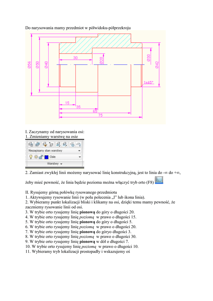 Do narysowania mamy przedmiot w półwidoku-półprzekroju I. Zaczynamy od narysowania osi: 1. Zmieniamy warstwę na osie 2. Zamiast zwykłej linii możemy narysować linię konstrukcyjną, jest to linia do -∞ do +∞, żeby mieć pewność, że linia będzie pozioma można włączyć tryb orto (F8) II. Rysujemy górną połówkę rysowanego przedmiotu 1. Aktywujemy rysowanie linii (w polu polecenia „l” lub ikona linia). 2. Wybieramy punkt lokalizacji bliski i klikamy na osi, dzięki temu mamy pewność, że zaczniemy rysowanie linii od osi. 3. W trybie orto rysujemy linię pionową do góry o długości 20. 4. W trybie orto rysujemy linię poziomą w prawo o długości 15. 5. W trybie orto rysujemy linię pionową do góry o długości 5. 6. W trybie orto rysujemy linię poziomą w prawo o długości 20. 7. W trybie orto rysujemy linię pionową do góryo długości 3. 8. W trybie orto rysujemy linię poziomą w prawo o długości 30. 9. W trybie orto rysujemy linię pionową w dół o długości 7. 10. W trybie orto rysujemy linię poziomą w prawo o długości 10. 11. Wybieramy tryb lokalizacji prostopadły i wskazujemy oś III Fazujemy polecenie fazuj, zmieniamy wielkość faz na 1. faza =1, druga faza =1. IV lustrzane odbicie 1. Zaznaczamy wszystkie linie, oprócz osi. 2. Klikamy na ikonie lustrzane odbicie (LUSTRO) w zasobniku modyfikuj 3. Oś powinniśmy wskazać wykorzystując punkty lokalizacji koniec 4. Na pytanie czy wymazać oryginał odpowiadamy: „nie” V Rysujemy widok 1. Przedłużamy linie do osi (narzędzie wydłuż) 2. Rysujemy linie od faz do prostopadły do osi. VI Rysujemy wnętrze półprzekroju VII Wymiarowanie 1. Zmieniamy aktywną warstwą na warstwę wymiary 2. Włączamy stały sposób lokalizacji, może być tylko koniec 3. Rysujemy pierwszy wymiar 40 jest to średnica, a więc musimy dodać symbol średnicy przed liczbą 40. 4. Pierwszy sposób klikamy lewym przyciskiem myszy na wymiarze, który chcemy zmienić, następnie klikamy prawy przycisk myszy z menu, które się pokaże wybieramy WŁĄŚCIWIŚCI 5. Wpisujemy do pola zmiana tekstu: „%%c<>” lub do pola Przedrostek wymiaru: „%%c”. Jest to najprostszy ale równocześnie najbardziej pracochłonny sposób dodawania znaku średnicy do wymiarów. 6. Inny sposób to przygotowanie stylu wymiarowania a) otwieramy okno dialogowe stylów wymiarowania b) W oknie dialogowym klikamy na przycisku nowy: w oknie, które się otworzy wpisujemy nazwą nowego stylu, może to być np. średnica liniowa. Po potwierdzeniu nazwy nowego stylu otworzy się okno z właściwościami stylu wymiarów. Na zakładce jednostki podstawowe do okna Przedrostek wpisujemy: „%%C” Potwierdzamy utworzenie stylu, zamykamy okno definiowania stylów. Wybieramy aktywny styl średnica liniowa i rysujemy średnice. Średnice wewnętrzne w półprzekroju powinny być zwymiarowane inaczej tzn. Osiągniemy to definiując: - linia pomocnicza 2 = nie - strzałka 2 = brak - liniowa skala wymiaru = 2 wymiary liniowe, długości proszę zrobić samodzielnie Do samodzielnego narysowania