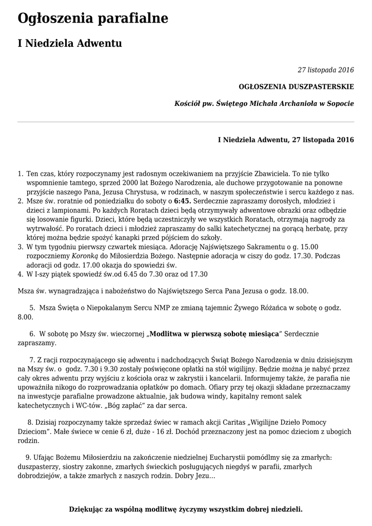 Ogłoszenia parafialne I Niedziela Adwentu 27 listopada 2016 OGŁOSZENIA DUSZPASTERSKIE Kościół pw. Świętego Michała Archanioła w Sopocie I Niedziela Adwentu, 27 listopada 2016 1. Ten czas, który rozpoczynamy jest radosnym oczekiwaniem na przyjście Zbawiciela. To nie tylko wspomnienie tamtego, sprzed 2000 lat Bożego Narodzenia, ale duchowe przygotowanie na ponowne przyjście naszego Pana, Jezusa Chrystusa, w rodzinach, w naszym społeczeństwie i sercu każdego z nas. 2. Msze św. roratnie od poniedziałku do soboty o 6:45. Serdecznie zapraszamy dorosłych, młodzież i dzieci z lampionami. Po każdych Roratach dzieci będą otrzymywały adwentowe obrazki oraz odbędzie się losowanie figurki. Dzieci, które będą uczestniczyły we wszystkich Roratach, otrzymają nagrody za wytrwałość. Po roratach dzieci i młodzież zapraszamy do salki katechetycznej na gorącą herbatę, przy której można będzie spożyć kanapki przed pójściem do szkoły. 3. W tym tygodniu pierwszy czwartek miesiąca. Adorację Najświętszego Sakramentu o g. 15.00 rozpoczniemy Koronką do Miłosierdzia Bożego. Następnie adoracja w ciszy do godz. 17.30. Podczas adoracji od godz. 17.00 okazja do spowiedzi św. 4. W I-szy piątek spowiedź św.od 6.45 do 7.30 oraz od 17.30 Msza św. wynagradzająca i nabożeństwo do Najświętszego Serca Pana Jezusa o godz. 18.00. 5. Msza Święta o Niepokalanym Sercu NMP ze zmianą tajemnic Żywego Różańca w sobotę o godz. 8.00. 6. W sobotę po Mszy św. wieczornej „Modlitwa w pierwszą sobotę miesiąca” Serdecznie zapraszamy. 7. Z racji rozpoczynającego się adwentu i nadchodzących Świąt Bożego Narodzenia w dniu dzisiejszym na Mszy św. o godz. 7.30 i 9.30 zostały poświęcone opłatki na stół wigilijny. Będzie można je nabyć przez cały okres adwentu przy wyjściu z kościoła oraz w zakrystii i kancelarii. Informujemy także, że parafia nie upoważniła nikogo do rozprowadzania opłatków po domach. Ofiary przy tej okazji składane przeznaczamy na inwestycje parafialne prowadzone aktualnie, jak budowa windy, kapitalny remont salek katechetycznych i WC-tów. „Bóg zapłać” za dar serca. 8. Dzisiaj rozpoczynamy także sprzedaż świec w ramach akcji Caritas „Wigilijne Dzieło Pomocy Dzieciom”. Małe świece w cenie 6 zł, duże - 16 zł. Dochód przeznaczony jest na pomoc dzieciom z ubogich rodzin. 9. Ufając Bożemu Miłosierdziu na zakończenie niedzielnej Eucharystii pomódlmy się za zmarłych: duszpasterzy, siostry zakonne, zmarłych świeckich posługujących niegdyś w parafii, zmarłych dobrodziejów, a także zmarłych z naszych rodzin. Dobry Jezu… Dziękując za wspólną modlitwę życzymy wszystkim dobrej niedzieli. Przyjmijmy Boże błogosławieństwo.