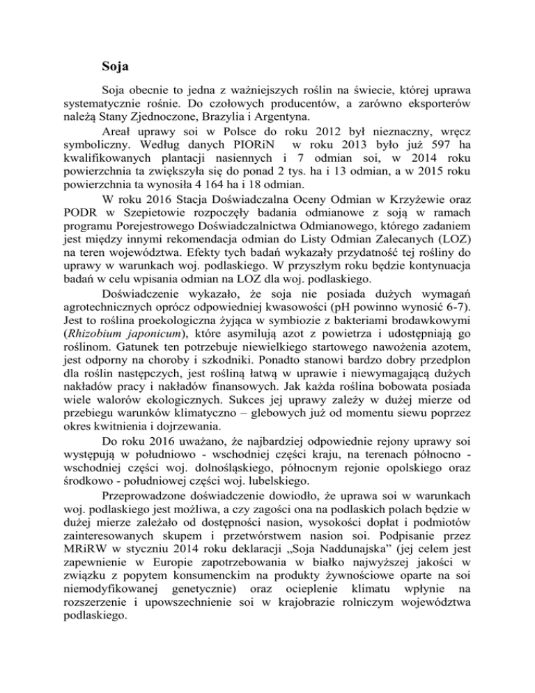 Soja Soja obecnie to jedna z ważniejszych roślin na świecie, której uprawa systematycznie rośnie. Do czołowych producentów, a zarówno eksporterów należą Stany Zjednoczone, Brazylia i Argentyna. Areał uprawy soi w Polsce do roku 2012 był nieznaczny, wręcz symboliczny. Według danych PIORiN w roku 2013 było już 597 ha kwalifikowanych plantacji nasiennych i 7 odmian soi, w 2014 roku powierzchnia ta zwiększyła się do ponad 2 tys. ha i 13 odmian, a w 2015 roku powierzchnia ta wynosiła 4 164 ha i 18 odmian. W roku 2016 Stacja Doświadczalna Oceny Odmian w Krzyżewie oraz PODR w Szepietowie rozpoczęły badania odmianowe z soją w ramach programu Porejestrowego Doświadczalnictwa Odmianowego, którego zadaniem jest między innymi rekomendacja odmian do Listy Odmian Zalecanych (LOZ) na teren województwa. Efekty tych badań wykazały przydatność tej rośliny do uprawy w warunkach woj. podlaskiego. W przyszłym roku będzie kontynuacja badań w celu wpisania odmian na LOZ dla woj. podlaskiego. Doświadczenie wykazało, że soja nie posiada dużych wymagań agrotechnicznych oprócz odpowiedniej kwasowości (pH powinno wynosić 6-7). Jest to roślina proekologiczna żyjąca w symbiozie z bakteriami brodawkowymi (Rhizobium japonicum), które asymilują azot z powietrza i udostępniają go roślinom. Gatunek ten potrzebuje niewielkiego startowego nawożenia azotem, jest odporny na choroby i szkodniki. Ponadto stanowi bardzo dobry przedplon dla roślin następczych, jest rośliną łatwą w uprawie i niewymagającą dużych nakładów pracy i nakładów finansowych. Jak każda roślina bobowata posiada wiele walorów ekologicznych. Sukces jej uprawy zależy w dużej mierze od przebiegu warunków klimatyczno – glebowych już od momentu siewu poprzez okres kwitnienia i dojrzewania. Do roku 2016 uważano, że najbardziej odpowiednie rejony uprawy soi występują w południowo - wschodniej części kraju, na terenach północno wschodniej części woj. dolnośląskiego, północnym rejonie opolskiego oraz środkowo - południowej części woj. lubelskiego. Przeprowadzone doświadczenie dowiodło, że uprawa soi w warunkach woj. podlaskiego jest możliwa, a czy zagości ona na podlaskich polach będzie w dużej mierze zależało od dostępności nasion, wysokości dopłat i podmiotów zainteresowanych skupem i przetwórstwem nasion soi. Podpisanie przez MRiRW w styczniu 2014 roku deklaracji „Soja Naddunajska” (jej celem jest zapewnienie w Europie zapotrzebowania w białko najwyższej jakości w związku z popytem konsumenckim na produkty żywnościowe oparte na soi niemodyfikowanej genetycznie) oraz ocieplenie klimatu wpłynie na rozszerzenie i upowszechnienie soi w krajobrazie rolniczym województwa podlaskiego. Tabela 71. Soja – odmiany badane w 2016 roku. Lp. Odmiana Rok wpisania do Rejestru Odmian 1 Aldana 1992 2 Augusta 2002 3 Mavka 2013 4 Madlen 2015 5 Aligator 2015 6 Abelina 2016 7 Protina CCA* 8 Sultana CCA* Hodowca (lub polski przedstawiciel dla odmian zagranicznych) HR Smolice sp. z o.o. 63-740 Kobylin Uniwersytet Przyrodniczy w Poznaniu. 60-637 Poznań Hodowla Soi Agro Youmis Polska sp. z o.o. 37-420 Rudnik nad Sanem Hodowla Soi Agro Youmis Polska sp. z o.o. 37-420 Rudnik nad Sanem Euralis Semences sp. z o.o. 60-449 Poznań Saatbau Polska sp. z o.o. 55-300 Środa Śląska RAGT Semences sp. z o.o. 87-148 Łysomice RAGT Semences sp. z o.o. 87-148 Łysomice *CCA – odmiany ze Wspólnotowego Katalogu Odmian Roślin Rolniczych Tabela 72. Agrotechniczne i polowe warunki prowadzenia doświadczeń w 2016 r. Wyszczególnienie Krzyżewo Szepietowo Kompleks glebowy Klasa bonitacyjna gleby pH gleby Zasobność gleby mg/100 g P2O5 K2 O Mg Przedplon Data siewu Data zbioru Nawożenie: N kg/ha P2O5 kg/ha K2O kg/ha Insektycydy 2 III b 6,4 4 III a 6,4 18,5 7,9 3,5 Pszenica ozima 05.05 19.09 21,4 9,5 7,9 Groch pastewny 06.05 20.09 48 60 90 Afalon Dyspersyjny 450 SC – 1,25 l. 40 40 110 Proman 500SC – 2 l. Command 480 EC – 0,15 l. Herbicydy dawka Odchylenie od wzorca % wzorca Wzorzec (dt∙ha-1) Średni plon dt∙ha-1 Odmiana Szepietowo Lp. Krzyżewo Tabela 73. Plon nasion (dt∙ha-1) soi w 2016 roku. 31,2 25,5 28,3 0,0 100 1 Aldana 28,3 17,6 22,9 -5,4 81 2 Augusta 29,1 25,0 27,1 -1,3 95 3 Abelina 37,2 29,2 33,2 4,8 117 4 Madlen 30,0 27,6 28,8 0,4 102 5 Mavka 33,8 25,5 29,7 1,3 105 6 Aligator 34,1 31,8 32,9 4,6 116 7 Protina CCA* 28,6 24,6 26,6 -1,7 94 8 Sultana CCA* 28,3 22,9 25,6 -2,8 90 *CCA – odmiany ze Wspólnotowego Katalogu Odmian Roślin Rolniczych L. dni od 1.01 Masa Tysiąca Nasion L. dni od 1.01 Wyleganie przed zbiorem cm Dojrzałość techniczna cm Początek kwitnienia Odmiana Wysokość osadzenia najniższego strąka Lp. Wysokość roślin Tabela 74. Ważniejsze cechy rolnicze odmian soi badanej w 2016 roku. Skala 9° g Wzorzec 105 15 178 254 8,0 151,3 1 Aldana 98 14 176 249 8,0 161,0 2 Augusta 94 13 179 249 6,0 133,9 3 Abelina 125 14 176 256 9,0 141,2 4 Madlen 91 15 187 254 6,0 161,0 5 Mavka 116 18 179 251 8,0 163,4 6 Aligator 105 17 175 255 9,0 156,9 7 Protina 121 18 175 257 9,0 132,8 8 Sultana 86 14 175 257 9,0 159,9 40 16 35 14 30 12 25 10 20 8 15 6 10 4 5 2 0 0 Protina Sultana Aldana Augusta Mavka Madlen Aligator Abelina *CCA *CCA dt·ha-1 28,25 29,08 33,84 29,97 34,12 37,19 28,62 28,29 % 11,2 11,1 11,7 12,2 12,2 11,6 13 13,5 % dt·ha-1 Wykres 1. Plonowanie i wilgotność odmian soi w doświadczeniu PDO przeprowadzonym w SDOO w Krzyżewie w roku 2016