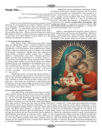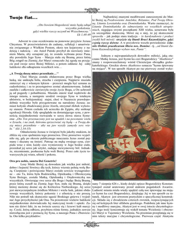 Twoje fiat… ,,Oto bowiem błogosławić mnie będą odtąd wszystkie pokolenia, gdyż wielkie rzeczy uczynił mi Wszechmocny.” Łk 1,48-49 Najbardziej znanymi modlitwami zanoszonymi do Matki Bożej są Pozdrowienie Anielskie, Różaniec, Pod Twoją Obronę, Litania Loretańska oraz Dominikańska. Warto zaznaczyć, że Litania Dominikańska do odmawiania we wszelkich utrapieniach, sięgająca swymi początkami XIII wieku, uznawana była za szczególnie skuteczną. Mówi się o niej, że jej skuteczność sprawiła – jak podaje stara tradycja – że kardynałowie i prałaci zwykli byli mówić: strzeżcie się litanii Braci Kaznodziejów, gdyż czynią rzeczy dziwne. A w przysłowie weszło powiedzenie: Litaniis Ordinis praedicarum libera nos, Domine - tj. ,,od litanii Zakonu Kaznodziejskiego wybaw nas, Panie’’. Adwent to czas oczekiwania na ponowne przyjście Jezusa Chrystusa. W przeciwieństwie do zadumy, refleksji i umartwienia związanego z Wielkim Postem, okres ten kojarzymy z nadzieją i radością – oto Anioł Pański przybył do niewiasty imieniem Maria, aby oznajmić jej, że została wybrana przez Pana, Jednym z najwspanialszych dowodów miłości, jaką otaaby porodziła Jego Syna – Maryja stała się Bramą, przez którą czano Matkę Jezusa, jest hymn ku czci Bogurodzicy "Akathistos" Bóg zstąpił na Ziemię; fiat Maryi oznaczało Jej zgodę na przyjęznany i rozpowszechniony wśród Chrześcijan obrządku grekocie pod swoje serce Bożej Miłości, a potem oddanie Jej całej katolickiego. Greckie słowo Akathistos oznacza "hymn śpiewany ludzkości dla odkupienia wszelkich win… na stojąco". W ten sposób Akatyst po raz pierwszy został wyko,,A Twoją duszę miecz przeniknie…’’ Choć Maryja została obdarowana przez Boga wielką łaską, nie uniknęła bólu, strachu i cierpienia. Najpierw musiała zmierzyć się z własnym lękiem – przecież mogła być uznana za cudzołożnicę i za to przestępstwo zostać ukamienowana. Jednak zaufała i całkowicie zawierzyła swoje życie Bogu, a On uchronił ją od pogardy i pohańbienia. Musiała znieść trud wędrówki do innego miasta, a następnie urodzić swojego Syna w totalnym ubóstwie, w betlejemskiej stajni, choć w Nazarecie prawdopodobnie wszystko było przygotowane na narodziny Jezusa; zamiast kołyski zbudowanej przez Józefa, otrzymał żłobek wyłożony sianem. Potem czekała ich ucieczka do Egiptu, aby uniknąć egzekucji Heroda. Gdy spoglądała na dorastającego syna, z pewnością niejednokrotnie rozważała w sercu słowa starca Symeona: ,,Oto Ten przeznaczony jest na upadek i na powstanie wielu w Izraelu, i na znak, któremu sprzeciwiać się będą – a Twoją duszę miecz przeniknie – aby na jaw wyszły zamysły serc wielu.’’ (Łk 2,34-35) Odnalezienie Jezusa w świątyni było jakoby znakiem, że zbliża się czas spełnienia tego proroctwa. Owe proroctwo wypełniło się, gdy po okresie publicznego nauczania Jezus został pojmany i skazany na śmierć. Patrząc na mękę swojego syna, cierpiała wraz z nim; każdy cios wymierzony w Jego boskie ciało, przenikał jej serce jak sztylet, zadając niewymowny ból. Jednakże, niezmiennie, posłuszna była woli Bożej. Przez całe życie towarzyszyła jej wiara, ufność i pokora. Ora pro nobis, sancta Dei Genetrix! Losy Matki Bożej są dowodem jak wielka jest miłość, dobro i hojność Stwórcy dla tych, którzy wiernie pełnią wolę Bożą. Cierpienie i poświęcenie Maryi zostało sowicie wynagrodzone – oto Ta, która była Rodzicielką, Opiekunką i Obrończynią Syna Bożego, została Matką, Opiekunką i Orędowniczką nas wszystkich. Otwierając swe serce dla Boga i będąc Bożą Bramą, przez którą zszedł na Ziemię Jego Syn, stała się Bramą, dzięki której możemy dostać się do Królestwa Niebieskiego. Jej serce jest niewyczerpalnym źródłem Miłości i wielu łask, jakimi obdarowuje wszystkich, którzy pokornie i z ufnością o nie proszą. Nikt nie potrafi tak skutecznie ugasić Boskiego gniewu i wyjednać Jego przychylności jak Ona. Na przestrzeni wieków ludzkość niejednokrotnie doświadczała Jej matczynej troski i opieki. Zatem nie dziwi fakt, że na świecie szerzy się i krzewi kult maryjny. Cześć, którą odbiera, przybiera różne formy, jednakże zawsze nierozłączna jest z postacią Jej Syna, a naszego Pana i Zbawiciela. Oto kilka przykładów: nany 7 sierpnia 626 r., kiedy dzięki opiece Bogurodzicy Konstantynopol został uratowany przed atakiem pogańskich Awarów. Ludność miasta miała wtedy spędzić całą noc śpiewając na stojąco hymn ku czci Bogurodzicy, dziękując Jej w ten sposób za ratunek. Akatyst jest utworem poetyckim o specyficznej konstrukcji. Składa się z dwudziestu czterech zwrotek, rozpoczynających się od kolejnych liter alfabetu greckiego. Podobnie jak inne hymny i modlitwy maryjne, Akatyst jest w swej istocie chrystologiczny. Jego treść koncentruje się wokół tematu Wcielenia i obecności Maryi w Tajemnicy Wcielenia. Na przemian przeplatają się w nim teksty maryjne i chrystologiczne. Pierwsza część Akatystu poświęcona jest dzieciństwu Chrystusa, druga natomiast jest kontemplacją tajemnicy Wcielenia. Jest on jednocześnie trwałym świadectwem rozwoju mariologii. W XX wieku Kościół katolicki w liturgicznym sięganiu do źródeł, również powrócił do Akatystu, wykonywanego jednak nie po grecku czy łacinie, ale w językach narodowych. Największe zasługi w powrocie Akatystu do liturgii ma Ojciec święty Jan Paweł II. Ubolewając nad tym, że nie może nas połączyć wspólna Eucharystia, papież mówił o "świętej tęsknocie za minionymi wiekami, kiedy żyliśmy w pełnej komunii wiary i miłości" i wskazując na Maryję, Matkę Gwiazdy, która nie zna zmierzchu i wskazuje na Akatyst - nabożeństwo wspólne dla obu Kościołów jako na drogę prowadzącą do pełni jedności. Recytację tego hymnu zatwierdził jako jedną z praktyk 