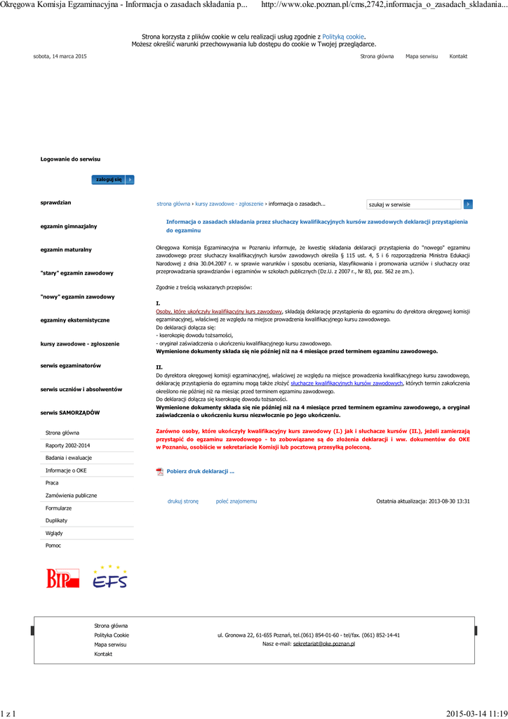 Okręgowa Komisja Egzaminacyjna - Informacja o zasadach składania p... 1z1 http://www.oke.poznan.pl/cms,2742,informacja_o_zasadach_skladania... Strona korzysta z plików cookie w celu realizacji usług zgodnie z Polityką cookie. Możesz określić warunki przechowywania lub dostępu do cookie w Twojej przeglądarce. sobota, 14 marca 2015 Strona główna Mapa serwisu Kontakt Logowanie do serwisu sprawdzian strona główna › kursy zawodowe - zgłoszenie › informacja o zasadach... egzamin gimnazjalny egzamin maturalny "stary" egzamin zawodowy szukaj w serwisie Informacja o zasadach składania przez słuchaczy kwalifikacyjnych kursów zawodowych deklaracji przystąpienia do egzaminu Okręgowa Komisja Egzaminacyjna w Poznaniu informuje, że kwestię składania deklaracji przystąpienia do "nowego" egzaminu zawodowego przez słuchaczy kwalifikacyjnych kursów zawodowych określa § 115 ust. 4, 5 i 6 rozporządzenia Ministra Edukacji Narodowej z dnia 30.04.2007 r. w sprawie warunków i sposobu oceniania, klasyfikowania i promowania uczniów i słuchaczy oraz przeprowadzania sprawdzianów i egzaminów w szkołach publicznych (Dz.U. z 2007 r., Nr 83, poz. 562 ze zm.). Zgodnie z treścią wskazanych przepisów: "nowy" egzamin zawodowy egzaminy eksternistyczne I. Osoby, które ukończyły kwalifikacyjny kurs zawodowy, składają deklarację przystąpienia do egzaminu do dyrektora okręgowej komisji egzaminacyjnej, właściwej ze względu na miejsce prowadzenia kwalifikacyjnego kursu zawodowego. Do deklaracji dołącza się: - kserokopię dowodu tożsamości, kursy zawodowe - zgłoszenie - oryginał zaświadczenia o ukończeniu kwalifikacyjnego kursu zawodowego. Wymienione dokumenty składa się nie później niż na 4 miesiące przed terminem egzaminu zawodowego. serwis egzaminatorów II. Do dyrektora okręgowej komisji egzaminacyjnej, właściwej ze względu na miejsce prowadzenia kwalifikacyjnego kursu zawodowego, serwis uczniów i absolwentów serwis SAMORZĄDÓW deklarację przystąpienia do egzaminu mogą także złożyć słuchacze kwalifikacyjnych kursów zawodowych, których termin zakończenia określono nie później niż na miesiąc przed terminem egzaminu zawodowego. Do deklaracji dołącza się kserokopię dowodu tożsaności. Wymienione dokumenty składa się nie później niż na 4 miesiące przed terminem egzaminu zawodowego, a oryginał zaświadczenia o ukończeniu kursu niezwłocznie po jego ukończeniu. Zarówno osoby, które ukończyły kwalifikacyjny kurs zawodowy (I.) jak i słuchacze kursów (II.), jeżeli zamierzają przystąpić do egzaminu zawodowego - to zobowiązane są do złożenia deklaracji i ww. dokumentów do OKE w Poznaniu, osobiście w sekretariacie Komisji lub pocztową przesyłką poleconą. Strona główna Raporty 2002-2014 Badania i ewaluacje Informacje o OKE Pobierz druk deklaracji ... Praca Zamówienia publiczne drukuj stronę poleć znajomemu Ostatnia aktualizacja: 2013-08-30 13:31 Formularze Duplikaty Wglądy Pomoc Strona główna Polityka Cookie ul. Gronowa 22, 61-655 Poznań, tel.(061) 854-01-60 - tel/fax. (061) 852-14-41 Mapa serwisu Nasz e-mail: [email protected] Kontakt 2015-03-14 11:19
