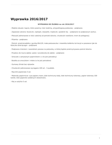 Wyprawka 2016/2017 WYPRAWKA DO ŻŁOBKA na rok 2016/2017 - Miękkie obuwie: kapcie, które powinny mieć stabilną, antypoślizgową podeszwę – podpisane. - Zapasowe ubrania: bluzeczki, rajstopki, skarpetki, majteczki, spodenki itp. – podpisane (w podpisanym worku). - Pieluszki jednorazowe w ilości zależnej od potrzeb dziecka, chusteczki nawilżone, krem do pielęgnacji. - Piżamka - podpisana - Pościel: prześcieradełko z gumką 60x120, mała poduszeczka i niewielka kołderka lub kocyk w poszewce (jak do łóżeczka dziecięcego) – podpisane - Podpisana imieniem i nazwiskiem poszwa na poduszkę, w której będzie przetrzymywana pościel dziecka. - Przybory do mycia zębów: pasta i szczoteczka do zębów – podpisane - Smoczek z zamykanym pojemnikiem ( o ile jest potrzebny) - Butelka ze smoczkiem i mleko (o ile jest potrzebne) - Gumowy śliniak bez rękawów - Chusteczki jednorazowe wyciągane 100 szt – 5 pudełek. - Ręczniki papierowe 3 szt. - Materiały papiernicze: ryza papieru ksero, blok techniczny biały, blok techniczny kolorowy, papier kolorowy 100 kartek, blok papierów ozdobnych (dowolność), - Klej w sztyfcie 5 szt. 1