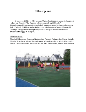 Piłka ręczna 2 czerwca 2012r. w XIII Liceum Ogólnokształcącym przy ul. Targowej odbył się Turniej Piłki Ręcznej „Szczypiorniak na Orlikach.” Organizatorami i pomysłodawcami akcji popularyzującej tę dyscyplinę sportu byli: Związek Piłki Ręcznej w Polsce oraz Ministerstwo Sportu i Turystyki. Turnieje szczypiorniaka odbyły się na 64 otwartych boiskach w Polsce. Dziewczęta zajęły V miejsce. Skład drużyny: Magda Ziółkowska, Zuzanna Bartkowiak, Patrycja Paśniewska, Marta Kutnik, Natalia Kowalska, Nicole Kwaśniewska, Marta Jeneralska, Alicja Wyczyńska, Marta Dziewiątkowska, Zuzanna Hulisz, Sara Pańkowska, Marta Wesołowska.