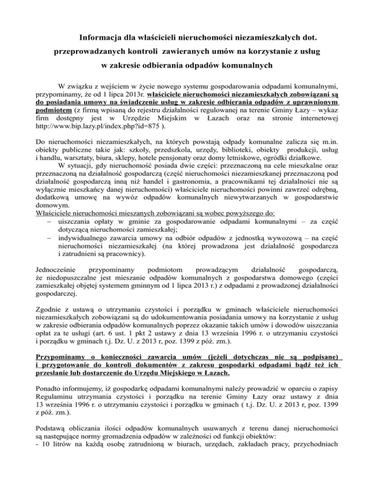Informacja dla właścicieli nieruchomości niezamieszkałych dot. przeprowadzanych kontroli zawieranych umów na korzystanie z usług w zakresie odbierania odpadów komunalnych W związku z wejściem w życie nowego systemu gospodarowania odpadami komunalnymi, przypominamy, że od 1 lipca 2013r. właściciele nieruchomości niezamieszkałych zobowiązani są do posiadania umowy na świadczenie usług w zakresie odbierania odpadów z uprawnionym podmiotem (z firmą wpisaną do rejestru działalności regulowanej na terenie Gminy Łazy – wykaz firm dostępny jest w Urzędzie Miejskim w Łazach oraz na stronie internetowej http://www.bip.lazy.pl/index.php?id=875 ). Do nieruchomości niezamieszkałych, na których powstają odpady komunalne zalicza się m.in. obiekty publiczne takie jak: szkoły, przedszkola, urzędy, biblioteki, obiekty produkcji, usług i handlu, warsztaty, biura, sklepy, hotele pensjonaty oraz domy letniskowe, ogródki działkowe. W sytuacji, gdy nieruchomość posiada dwie części: przeznaczoną na cele mieszkalne oraz przeznaczoną na działalność gospodarczą (część nieruchomości niezamieszkanej przeznaczoną pod działalność gospodarczą inną niż handel i gastronomia, a pracownikami tej działalności nie są wyłącznie mieszkańcy danej nieruchomości) właściciele nieruchomości powinni zawrzeć odrębną, dodatkową umowę na wywóz odpadów komunalnych niewytwarzanych w gospodarstwie domowym. Właściciele nieruchomości mieszanych zobowiązani są wobec powyższego do: − uiszczania opłaty w gminie za gospodarowanie odpadami komunalnymi – za część dotyczącą nieruchomości zamieszkałej; − indywidualnego zawarcia umowy na odbiór odpadów z jednostką wywozową – na część nieruchomości niezamieszkałej (na której prowadzona jest działalność gospodarcza i zatrudnieni są pracownicy). Jednocześnie przypominamy podmiotom prowadzącym działalność gospodarczą, że niedopuszczalne jest mieszanie odpadów komunalnych z gospodarstwa domowego (części zamieszkałej objętej systemem gminnym od 1 lipca 2013 r.) z odpadami z prowadzonej działalności gospodarczej. Zgodnie z ustawą o utrzymaniu czystości i porządku w gminach właściciele nieruchomości niezamieszkałych zobowiązani są do udokumentowania posiadania umowy na korzystanie z usług w zakresie odbierania odpadów komunalnych poprzez okazanie takich umów i dowodów uiszczania opłat za te usługi (art. 6 ust. 1 pkt 2 ustawy z dnia 13 września 1996 r. o utrzymaniu czystości i porządku w gminach t.j. Dz. U. z 2013 r, poz. 1399 z póź. zm.). Przypominamy o konieczności zawarcia umów (jeżeli dotychczas nie są podpisane) i przygotowanie do kontroli dokumentów z zakresu gospodarki odpadami bądź też ich przesłanie lub dostarczenie do Urzędu Miejskiego w Łazach. Ponadto informujemy, iż gospodarkę odpadami komunalnymi należy prowadzić w oparciu o zapisy Regulaminu utrzymania czystości i porządku na terenie Gminy Łazy oraz ustawy z dnia 13 września 1996 r. o utrzymaniu czystości i porządku w gminach ( t.j. Dz. U. z 2013 r, poz. 1399 z póź. zm.). Podstawą obliczania ilości odpadów komunalnych usuwanych z terenu danej nieruchomości są następujące normy gromadzenia odpadów w zależności od funkcji obiektów: - 10 litrów na każdą osobę zatrudnioną w biurach, urzędach, zakładach pracy, przychodniach praktykach lekarskich, jednak co najmniej jeden pojemnik 120 litrów, niezależnie od odpadów opakowaniowych i odpadów innych niż odpady komunalne; - 20 litrów na każde miejsce dla konsumenta i zatrudnioną osobę, nie mniej jednak niż 120 litrów na punkt, dla restauracji, barów, niezależnie od odpadów opakowaniowych i odpadów innych niż odpady komunalne; -30 litrów na osobę zatrudnioną, nie mniej jednak niż 120 litrów dla sklepów i punktów usługowych, niezależnie od odpadów opakowaniowych i odpadów innych niż odpady komunalne; - w przypadku lokali handlowych i gastronomicznych, dla zapewnienia czystości wymagane jest również ustawienie na zewnątrz, poza lokalem odpowiedniej liczby koszy na odpady lecz co najmniej jednego pojemnika o minimalnej pojemności 20 litrów; - dla punktów szybkiej konsumpcji- co najmniej jeden pojemnik o pojemności 120 litrów, - dla szkół wszelkiego typu 3 litry na każdego ucznia, studenta, pracownika; - dla żłobków i przedszkoli 3 litry na każde dziecko i pracownika; -15 l – na każdą działkę na terenie ogródków działkowych w okresie od 1 marca do 31 października jeżeli działka wyposażona jest w kompostownik lub 20 litrów na każdą działkę w przypadku braku kompostownika, a poza wymienionym okresem – 5 litrów na każdą działkę; − dla domków letniskowych pojemniki i worki powinny być dostosowane tak jak dla nieruchomości zamieszkałych. Urząd Miejski w Łazach