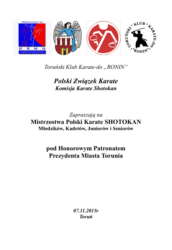 Toruński Klub Karate-do „RONIN” Polski Związek Karate Komisja Karate Shotokan Zapraszają na Mistrzostwa Polski Karate SHOTOKAN Młodzików, Kadetów, Juniorów i Seniorów pod Honorowym Patronatem Prezydenta Miasta Torunia 07.11.2015r Toruń Regulamin Zawodów Organizator: Toruński Klub Karate-Do „RONIN” Polski Związek Karate Komisja Karate Shotokan Miasto Toruń Cel turnieju: wyłonienie najlepszych zawodników w Karate SHOTOKAN wśród młodzieży, wyłonienie szerokiej Kadry Polski na rok 2015, popularyzacja karate. Miejsce turnieju: Hala Sportowa „Arena Toruń” ul. J. Bema 73/89 Termin turnieju 07.11.2015 (sobota), oficjalne otwarcie 9.20 Warunki udziału w Turnieju: Do Mistrzostw Polski Karate Shotokan mogą zgłaszać wyłącznie Kluby sportowe zrzeszone w PZK i posiadające aktualną licencję klubową na 2015 r. Zawodnicy muszą posiadać aktualne badania lekarskie oraz aktualną licencję zawodniczą na 2015r, potwierdzeniem stopnia może być wyłącznie Certyfikat PZK. Posiadanie ubezpieczenia NW dla sportowców Dostarczenie zgłoszenia na Mistrzostwa Polski w Karate SHOTOKAN dla młodzieży tylko zgodnie z załączonym formularzem Excel (dostępny ze strony internetowej PZK) zgłoszenia do dnia 02.11.2015r jednocześnie na adres e-mail: [email protected] i [email protected] Zawodnicy będą kwalifikowani do danej kategorii na podstawie dokładnej dziennej daty urodzenia (dzień, miesiąc, rok). Zawodnicy 14-15 lat mogą brać udział tylko w jednej kategorii wiekowej oraz w konkurencji kata kategorii kadet. Potwierdzenie stopnia wyszkolenia dla młodzików (14-15 lat) – kata min. 7 kyu, kumite min. 6 kyu; kadetów – kata min. 5 kyu, kumite min. 4 kyu; dla juniorów i seniorów – kata min. 4 kyu, kumite min. 3 kyu. Wiek zawodników: Młodzicy 14 – 15 lat - młodzik może startować w konkurencji przewidzianej dla młodzików i może wziąć udział w konkurencji kata kadetów bez możliwości startu w kumite. Kadeci 16 – 17 lat, kadet może startować w konkurencji przewidzianej dla kadetów i może wziąć udział w konkurencji kata i kumite juniorów. Drużyna Kadetów startując w konkurencji Kata drużynowego Juniorów, może wystartować w całym zespole lub jego części, natomiast w kata drużynowym seniorów może startować tylko 1 zawodnik. Juniorzy 18 – 20 lat – może wziąć udział w konkurencji kata i kumite seniorów Seniorzy powyżej 21 lat. Przepisy turnieju, Sędziowanie: Zawody będą rozgrywane na podstawie przepisów PZK - Regulamin organizacji zawodów ESKA/ WSKA oraz przepisy ESKA/WSKA i zapisy niniejszego regulaminu. W Kumite wymagane są białe napięstniki oraz ochraniacze na zęby, organizator nie zapewnia pasów (białe, czerwone) wymaganych do startu zawodnika. Warunkiem rozegrania danej konkurencji jest zgłoszenie minimum 4 zawodników, drużyn w danej konkurencji. W dniu zawodów można będzie wykreślić zawodnika bez możliwości nanoszenia zmian. Finały poszczególnych konkurencji będą rozgrywały się bezpośrednio po eliminacjach. Kumite – czas walki kategorii 14-15 lat 90 sekund, kadeci 2 minuty, pozostałe kategorie wiekowe zgodnie z przepisami ESKA/WSKA. Kadet może brać udział tylko w konkurencji Junior, w Kumite drużynowym skład drużyny można uzupełnić 1 osobą z niższej kategorii wiekowej. Lista Kata - zawodnicy wykonują kata zgodnie z przepisami WSKA/ ESKA. Złożenie protestu dotyczącego decyzji sędziowskiej wymaga formy pisemnej oraz wpłacenia wadium w kwocie 300,00 zł. W trakcie zwodów w okolicy plansz mogą przebywać wyłącznie startujący zawodnicy i trenerzy. Konkurencje rozgrywane: MŁODZIEŻ 14 – 15 drużyny Kumite 3+1 Kata ind. młodziczek Kata ind. młodzików Kumite ind. młodziczek Kumite ind. młodzików Kata druż. młodziczek Kata druż. młodzików Kumite druż. młodziczek Kumite druż. młodzików KADET 16 – 17 drużyny Kumite 3+1 Kata ind. Kadetek Kata ind. Kadetów Kata druż. Kadetek Kata druż. Kadetów Kumite ind. Kadetek Kumite ind. Kadetów Kumite druż. Kadetek Kumite druż. Kadetów JUNIOR 18 – 20 Drużyny Kumite 3+1 Kata ind. Juniorek Kata ind. Juniorów Kata druż. Juniorek Kata druż. Juniorów Kumite ind. Juniorek Kumite ind. Juniorów Kumite druż. Juniorek Kumite druż. Juniorów SENIOR 21 i starsi drużyny Kumite 3+1 Kata ind. Seniorek Kata ind. Seniorów Kata druż. Seniorek Kata druż. Seniorów Kumite ind. Seniorek Kumite ind. Seniorów Kumite druż. Seniorek Kumite druż. Seniorów Nagrody: - puchary, medale, dyplomy Postanowienia końcowe: Zawodnicy startujący w Kumite muszą posiadać białe napięstniki zgodnie z homologacją PZK i ochraniacze na zęby Do dekoracji zawodnicy występują w karategach lub kompletnych dresach klubowych Kluby ubezpieczają swoich zawodników od NW we własnym zakresie Opłaty startowej należy dokonać u organizatora w dniu rejestracji/ lub na konto organizatora w banku Credit Agricole 24 1940 1076 3016 5566 0000 0000 kwocie: 70,00 zł od konkurencji indywidualnej oraz 120,00 zł od konkurencji drużynowej Ekspozycja i sprzedaż towarów – tylko za zgodą organizatora Noclegi możliwe do rezerwacji we własnym zakresie: Baza hotelowa Toruń – www.torun.pl Program Mistrzostw Polski 06.11.2015 Piątek – Hala Sportowa „Arena Toruń” 19.00 – 21.30 Rejestracja i sprawdzanie dokumentów 21.45 – losowanie zawodników 07.11.2015 Sobota – Hala Sportowa „Arena Toruń” 8.00 – 8.30 Przyjazd ekip, rejestracja i sprawdzanie dokumentów 9.00 – Odprawa Kierowników Ekip 9.10 – Odprawa Sędziowska 9.20 – Oficjalne otwarcie Turnieju 10.00 – Rozpoczęcie konkurencji 19.00 – Zakończenie Turnieju