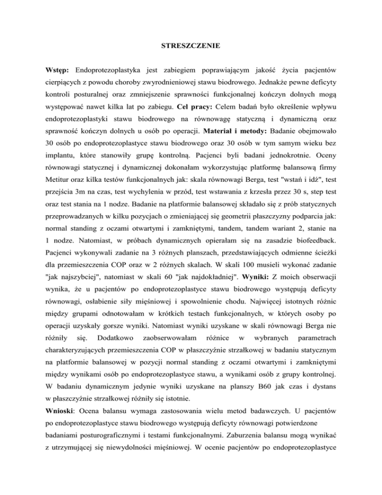 STRESZCZENIE Wstęp: Endoprotezoplastyka jest zabiegiem poprawiającym jakość życia pacjentów cierpiących z powodu choroby zwyrodnieniowej stawu biodrowego. Jednakże pewne deficyty kontroli posturalnej oraz zmniejszenie sprawności funkcjonalnej kończyn dolnych mogą występować nawet kilka lat po zabiegu. Cel pracy: Celem badań było określenie wpływu endoprotezoplastyki stawu biodrowego na równowagę statyczną i dynamiczną oraz sprawność kończyn dolnych u osób po operacji. Materiał i metody: Badanie obejmowało 30 osób po endoprotezoplastyce stawu biodrowego oraz 30 osób w tym samym wieku bez implantu, które stanowiły grupę kontrolną. Pacjenci byli badani jednokrotnie. Oceny równowagi statycznej i dynamicznej dokonałam wykorzystując platformę balansową firmy Metitur oraz kilka testów funkcjonalnych jak: skala równowagi Berga, test "wstań i idź", test przejścia 3m na czas, test wychylenia w przód, test wstawania z krzesła przez 30 s, step test oraz test stania na 1 nodze. Badanie na platformie balansowej składało się z prób statycznych przeprowadzanych w kilku pozycjach o zmieniającej się geometrii płaszczyzny podparcia jak: normal standing z oczami otwartymi i zamkniętymi, tandem, tandem wariant 2, stanie na 1 nodze. Natomiast, w próbach dynamicznych opierałam się na zasadzie biofeedback. Pacjenci wykonywali zadanie na 3 różnych planszach, przedstawiających odmienne ścieżki dla przemieszczenia COP oraz w 2 różnych skalach. W skali 100 musieli wykonać zadanie "jak najszybciej", natomiast w skali 60 "jak najdokładniej". Wyniki: Z moich obserwacji wynika, że u pacjentów po endoprotezoplastyce stawu biodrowego występują deficyty równowagi, osłabienie siły mięśniowej i spowolnienie chodu. Najwięcej istotnych różnic między grupami odnotowałam w krótkich testach funkcjonalnych, w których osoby po operacji uzyskały gorsze wyniki. Natomiast wyniki uzyskane w skali równowagi Berga nie różniły się. Dodatkowo zaobserwowałam różnice w wybranych parametrach charakteryzujących przemieszczenia COP w płaszczyźnie strzałkowej w badaniu statycznym na platformie balansowej w pozycji normal standing z oczami otwartymi i zamkniętymi między wynikami osób po endoprotezoplastyce stawu, a wynikami osób z grupy kontrolnej. W badaniu dynamicznym jedynie wyniki uzyskane na planszy B60 jak czas i dystans w płaszczyźnie strzałkowej różniły się istotnie. Wnioski: Ocena balansu wymaga zastosowania wielu metod badawczych. U pacjentów po endoprotezoplastyce stawu biodrowego występują deficyty równowagi potwierdzone badaniami posturograficznymi i testami funkcjonalnymi. Zaburzenia balansu mogą wynikać z utrzymującej się niewydolności mięśniowej. W ocenie pacjentów po endoprotezoplastyce stawu biodrowego największą wartość kliniczną prezentują testy funkcjonalne, które służą nie tylko do oceny balansu ciała, ale także do oceny wydolności mięśni kończyn dolnych. W świetle uzyskanych wyników wydaje się konieczne przeanalizowanie aktualnie stosowanych standardów usprawniania po endoprotezoplastyce stawu biodrowego. SUMMARY Introduction: Total hip arthroplasty is the procedure which can improve the quality of live in patients with osteoarthritis. However, deficit of balance and decrease in lower extremity efficiency can be observed several years after hip replacement. Aims: The aim of this study was to assess the impact of total hip alloplasty on static and dynamic balance and lower extremity efficiency. Methods: The study included 30 patients after total hip replacement and 30 healthy subject. Patients were examined once. Metitur balance platform and functional tests like: Berg Balance Scale, timed up and go test, 3 m gait test, functional reach test, 30 second chair sit-to-stand test, step test and one-leg standing test were used to assess the static and dynamic balance. Static balance tests on balance platform was performed in several position with different foot placement like: normal standing eyes open and eyes closed, tandem position, second option of tandem position and one leg standing position. During the dynamic balance test I used biofeedback. Patients were performed their tasks in 2 scales on 3 boards which showed 3 different paths to COP displacement. In scale 100 they had to do it "as soon as possible" while the scale 60 "accurately as possible". Results: I observed that in patients after total hip replacement occur balance deficit, loss of muscle strength and reduction in walking velocity. In short functional tests I noted the most significant differences between groups what means that patients after hip alloplasty had worse results than control group. While the results received in Berg Balance Scale did not differ. Additionally, there were differences between some of parameters characterizing COP displacement in the sagittal plane in both groups. It was noted during static tests performed on balance platform like normal standing position with eyes open and closed. Significant differences were found in dynamic tests but only on B60 board (time of task and distance in sagittal plane). Conclusions: Assessment of balance should include a lot of postural tests. In the study group deficits in balance confirmed by postural and functional tests occur. Balance disturbances in patients after total hip replacement results from persistent muscle insufficiency. Functional tests have the greatest clinical value during evaluation of patients after total hip replacement. They could be used not only to assess the balance of the body, but also to evaluate the efficiency of the muscles of the lower limbs. In view of these results, it seems necessary to analyze the rehabilitation protocols currently used after total hip replacement.