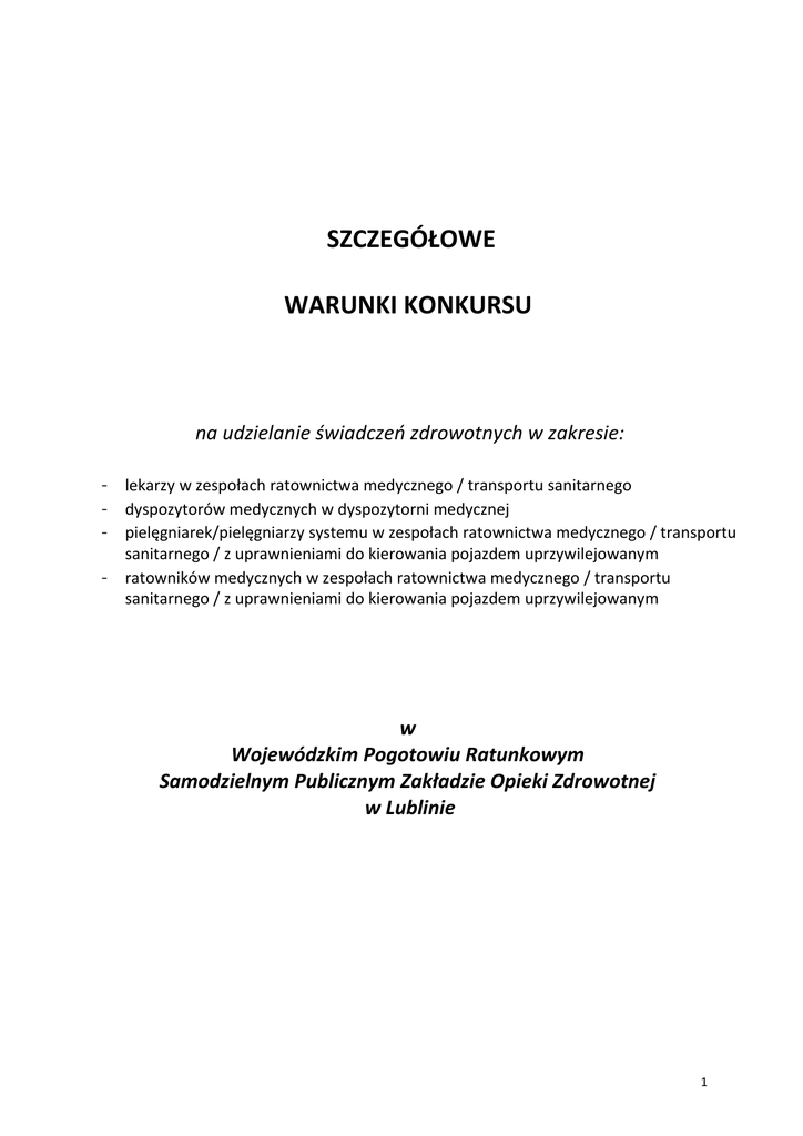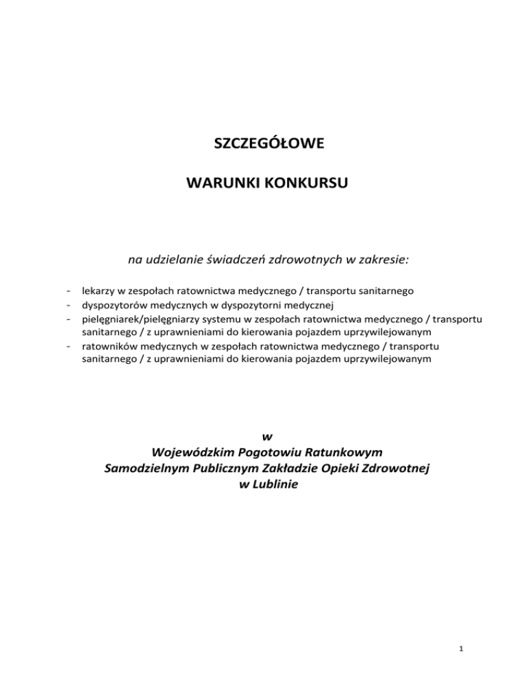 SZCZEGÓŁOWE WARUNKI KONKURSU na udzielanie świadczeń zdrowotnych w zakresie: - lekarzy w zespołach ratownictwa medycznego / transportu sanitarnego - dyspozytorów medycznych w dyspozytorni medycznej - pielęgniarek/pielęgniarzy systemu w zespołach ratownictwa medycznego / transportu sanitarnego / z uprawnieniami do kierowania pojazdem uprzywilejowanym - ratowników medycznych w zespołach ratownictwa medycznego / transportu sanitarnego / z uprawnieniami do kierowania pojazdem uprzywilejowanym w Wojewódzkim Pogotowiu Ratunkowym Samodzielnym Publicznym Zakładzie Opieki Zdrowotnej w Lublinie 1 I. SPOSÓB PRZYGOTOWANIA OFERTY 1. Oferent składa ofertę w formie pisemnej, na formularzu oferty udostępnionym przez WPR SP ZOZ w Lublinie, zgodnie z wymaganiami określonymi w Szczegółowych Warunkach Konkursu. 2. Każdy oferent może złożyć jedną ofertę tylko na jeden rodzaj świadczeń. 3. Nie dopuszcza się składania ofert wariantowych. Oferta zawierająca wariantowe propozycje cenowe zostanie odrzucona. 4. Złożona oferta może dotyczyć tylko jednego oferenta. 5. Oferenci ponoszą wszelkie koszty związane z przygotowaniem i złożeniem oferty. 6. Ofertę należy opracować na druku „OFERTA”. Oferentowi nie wolno dokonywać żadnych zmian merytorycznych we wzorze druku „OFERTA” pod rygorem odrzucenia oferty. 7. Oferta i załączniki - pod rygorem ich odrzucenia - powinny być napisane w języku polskim (z wyłączeniem pojęć medycznych), na maszynie, komputerze lub ręcznie nieścieralnym atramentem oraz podpisane przez osobę /osobę upoważnioną do złożenia oferty, w przypadku osoby upoważnionej – wymagane pełnomocnictwo. 8. Wszystkie zapisane strony oferty, załączników oraz wszystkie wymagane dokumenty muszą być podpisane przez osobę podpisującą ofertę. 9. Wszystkie dokumenty i oświadczenia sporządzone w językach obcych należy złożyć wraz z tłumaczeniem na język polski sporządzonym przez tłumaczy przysięgłych. 10. Dokument przedstawiony w postaci kserokopii winien być opatrzony adnotacją: "za zgodność z oryginałem" i podpisany przez osobę składającą ofertę. Komisja Konkursowa może żądać przedstawienia oryginału lub notarialnie potwierdzonej kopii dokumentu wyłącznie wtedy, gdy przedstawiona przez Oferenta kopia dokumentu jest nieczytelna lub budzi wątpliwości, co do jej prawdziwości, a Udzielający zamówienia nie może sprawdzić jej prawdziwości w inny sposób. 11. Ofertę wraz ze wszystkimi załącznikami na ponumerowanych stronach należy umieścić w zapieczętowanej kopercie opatrzonej napisem: Imię i nazwisko Oferenta: …................................................................... Adres: …..................................................................................................................................... Oferta na wykonywanie świadczeń zdrowotnych w zakresie: ................................................................................................................................. (wpisać zakres) Nie otwierać przed dniem 3 października 2016 r. godz. 11.30 Liczba stron (określić, ile zapisanych stron znajduje się w kopercie) ........... Telefon kontaktowy:...................................... 12. Wszelkie poprawki lub zmiany w tekście oferty muszą być parafowane przez osobę podpisującą ofertę. 13. Ofertę przed upływem terminu składania ofert można zmienić lub wycofać. Powiadomienie o wprowadzeniu zmian lub wycofaniu oferty winno zostać złożone w sposób i formie przewidzianej dla oferty, z tym, że koperta winna być dodatkowo oznaczona określeniem „ZMIANA” lub „WYCOFANIE”. II. 1. 2. 3. 4. 5. MIEJSCE SKŁADANIA OFERT Ofertę w zamkniętej/zaklejonej kopercie opatrzonej napisami jak w rozdziale I. niniejszych Szczegółowych Warunków Konkursu należy złożyć lub doręczyć w inny sposób w terminie do dnia: 3 października 2016 r. do godz. 11.15 w Kancelarii WPR SP ZOZ w Lublinie przy ul. Spadochroniarzy 8, II piętro, pokój numer 222. Celem dokonania zmian bądź poprawek – Oferent może wycofać wcześniej złożoną ofertę i złożyć ją po modyfikacji ponownie, pod warunkiem zachowania wyznaczonego w SWK terminu składania ofert. Przy składaniu oferty Oferent otrzyma pisemne potwierdzenie złożenia oferty wraz z numerem, jakim została oznakowana oferta. Oferty złożone po wyznaczonym terminie lub nadane jako przesyłka pocztowa lub drogą faxu, niezależnie od daty nadania nie będą rozpatrywane i zostaną zwrócone Oferentowi bez otwierania. Po otwarciu ofert, złożone do konkursu oferty wraz z wszelkimi załączonymi dokumentami nie podlegają zwrotowi. 2 III. WYMAGANIA FORMALNO - PRAWNE W ODNIESIENIU DO OFERENTÓW 1. Oferent powinien spełniać wymogi wynikające z ustawy o Państwowym Ratownictwie Medycznym: lekarz w zespołach ratownictwa medycznego / transportu sanitarnego: 1) tytuł specjalisty w dziedzinie medycyny ratunkowej albo lekarz, który ukończył co najmniej drugi rok specjalizacji w dziedzinie medycyny ratunkowej; 2) do dnia 31 grudnia 2020 r. lekarzem systemu może być: a) specjalizacja lub tytuł specjalisty, albo ukończenie co najmniej drugiego roku specjalizacji w co najmniej jednej z następujących dziedzin: - anestezjologii i intensywnej terapii, - chorób wewnętrznych, - chirurgii ogólnej, - chirurgii dziecięcej, - ortopedii i traumatologii - ortopedii i traumatologii narządu ruchu, - pediatrii, b) doświadczenie w wymiarze 3000 godzin w wykonywaniu zawodu lekarza w szpitalnym oddziale ratunkowym, zespole ratownictwa medycznego, lotniczym zespole ratownictwa medycznego, lub izbie przyjęć szpitala pod warunkiem rozpoczęcia szkolenia specjalizacyjnego w dziedzinie medycyny ratunkowe do dnia 1 stycznia 2018 r., w przypadku niespełnienia tego wymogu lekarz przestaje być lekarzem systemu; dyspozytor medyczny w dyspozytorni medycznej: a) wykształcenie wymagane dla lekarza systemu, pielęgniark