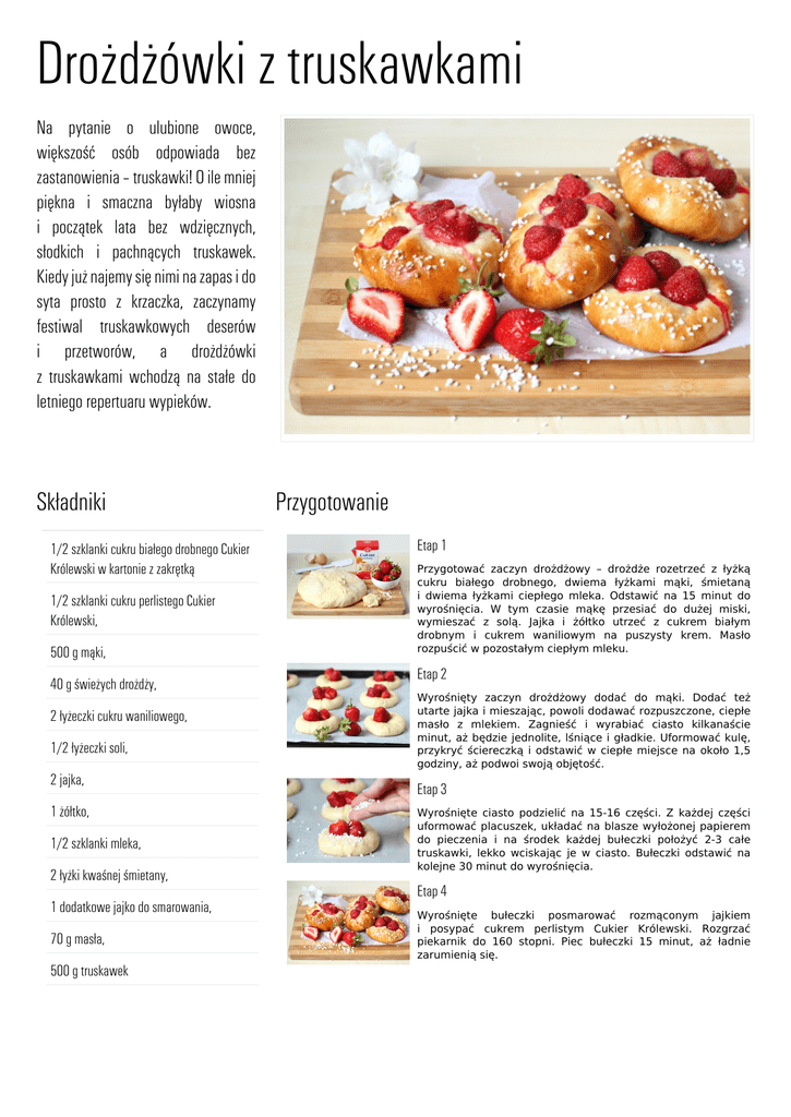 Powered by TCPDF (www.tcpdf.org) Drożdżówki z truskawkami Na pytanie o ulubione owoce, większość osób odpowiada bez zastanowienia – truskawki! O ile mniej piękna i smaczna byłaby wiosna i początek lata bez wdzięcznych, słodkich i pachnących truskawek. Kiedy już najemy się nimi na zapas i do syta prosto z krzaczka, zaczynamy festiwal truskawkowych deserów i przetworów, a drożdżówki z truskawkami wchodzą na stałe do letniego repertuaru wypieków. Składniki 1/2 szklanki cukru białego drobnego Cukier Królewski w kartonie z zakrętką 1/2 szklanki cukru perlistego Cukier Królewski, 500 g mąki, 40 g świeżych drożdży, 2 łyżeczki cukru waniliowego, 1/2 łyżeczki soli, 2 jajka, 1 żółtko, 1/2 szklanki mleka, 2 łyżki kwaśnej śmietany, 1 dodatkowe jajko do smarowania, 70 g masła, 500 g truskawek Przygotowanie Etap 1 Przygotować zaczyn drożdżowy – drożdże rozetrzeć z łyżką cukru białego drobnego, dwiema łyżkami mąki, śmietaną i dwiema łyżkami ciepłego mleka. Odstawić na 15 minut do wyrośnięcia. W tym czasie mąkę przesiać do dużej miski, wymieszać z solą. Jajka i żółtko utrzeć z cukrem białym drobnym i cukrem waniliowym na puszysty krem. Masło rozpuścić w pozostałym ciepłym mleku. Etap 2 Wyrośnięty zaczyn drożdżowy dodać do mąki. Dodać też utarte jajka i mieszając, powoli dodawać rozpuszczone, ciepłe masło z mlekiem. Zagnieść i wyrabiać ciasto kilkanaście minut, aż będzie jednolite, lśniące i gładkie. Uformować kulę, przykryć ściereczką i odstawić w ciepłe miejsce na około 1,5 godziny, aż podwoi swoją objętość. Etap 3 Wyrośnięte ciasto podzielić na 15-16 części. Z każdej części uformować placuszek, układać na blasze wyłożonej papierem do pieczenia i na środek każdej bułeczki położyć 2-3 całe truskawki, lekko wciskając je w ciasto. Bułeczki odstawić na kolejne 30 minut do wyrośnięcia. Etap 4 Wyrośnięte bułeczki posmarować rozmąconym jajkiem i posypać cukrem perlistym Cukier Królewski. Rozgrzać piekarnik do 160 stopni. Piec bułeczki 15 minut, aż ładnie zarumienią się.