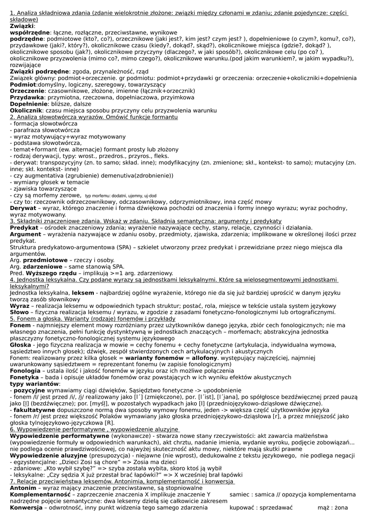 1. Analiza składniowa zdania (zdanie wielokrotnie złożone: związki między członami w zdaniu; zdanie pojedyncze: części składowe) Związki: współrzędne: łączne, rozłączne, przeciwstawne, wynikowe podrzędne: podmiotowe (kto?, co?), orzecznikowe (jaki jest?, kim jest? czym jest? ), dopełnieniowe (o czym?, komu?, co?), przydawkowe (jaki?, który?), okolicznikowe czasu (kiedy?, dokąd?, skąd?), okolicznikowe miejsca (gdzie?, dokąd? ), okolicznikowe sposobu (jak?), okolicznikowe przyczyny (dlaczego?, w jaki sposób?), okolicznikowe celu (po co? ), okolicznikowe przyzwolenia (mimo co?, mimo czego?), okolicznikowe warunku.(pod jakim warunkiem?, w jakim wypadku?), rozwijające Związki podrzędne: zgoda, przynależność, rząd Związek główny: podmiot+orzeczenie. gr podmiotu: podmiot+przydawki gr orzeczenia: orzeczenie+okoliczniki+dopełnienia Podmiot:domyślny, logiczny, szeregowy, towarzyszący Orzeczenie: czasownikowe, złożone, imienne (łącznik+orzecznik) Przydawka: przymiotna, rzeczowna, dopełniaczowa, przyimkowa Dopełnienie: bliższe, dalsze Okolicznik: czasu miejsca sposobu przyczyny celu przyzwolenia warunku 2. Analiza słowotwórcza wyrazów. Omówić funkcje formantu - formacja słowotwórcza - parafraza słowotwórcza - wyraz motywujący+wyraz motywowany - podstawa słowotwórcza, - temat+formant (ew. alternacje) formant prosty lub złożony - rodzaj derywacji, typy: wrost., przedros., przyros., fleks. - derywat: transpozycyjny (zn. to samo; skład. inne); modyfikacyjny (zn. zmienione; skł., kontekst- to samo); mutacyjny (zn. inne; skł. kontekst- inne) - czy augmentativa (zgrubienie) demenutiva(zdrobnienie)) - wymiany głosek w temacie - zjawiska towarzyszące - czy są morfemy zerowe, typ morfemu: dodatni, ujemny, ujdod - czy to: rzeczownik odrzeczownikowy, odczasownikowy, odprzymiotnikowy, inna część mowy Derywat – wyraz, którego znaczenie i forma dźwiękowa pochodzi od znaczenia i formy innego wyrazu; wyraz pochodny, wyraz motywowany. 3. Składniki znaczeniowe zdania. Wskaż w zdaniu. Składnia semantyczna: argumenty i predykaty Predykat – ośrodek znaczeniowy zdania; wyrażenie nazywające cechy, stany, relacje, czynności i działania. Argument – wyrażenia nazywające w zdaniu osoby, przedmioty, zjawiska, zdarzenia; implikowane w określonej ilości przez predykat. Struktura predykatowo-argumentowa (SPA) – szkielet utworzony przez predykat i przewidziane przez niego miejsca dla argumentów. Arg. przedmiotowe – rzeczy i osoby. Arg. zdarzeniowe – same stanowią SPA. Pred. Wyższego rzędu – implikują >=1 arg. zdarzeniowy. 4. Jednostka leksykalna. Czy podane wyrazy są jednostkami leksykalnymi. Które są wielosegmentowymi jednostkami leksykalnymi? Jednostka leksykalna, leksem - najbardziej ogólne wyrażenie, którego nie da się już bardziej uprościć w danym języku tworzą zasób słownikowy Wyraz – realizacja leksemu w odpowiednich typach struktur; postać, rola, miejsce w tekście ustala system językowy Słowo – fizyczna realizacja leksemu / wyrazu, w zgodzie z zasadami fonetyczno-fonologicznymi lub ortograficznymi. 5. Fonem a głoska. Warianty (rodzaje) fonemów i przykłady Fonem - najmniejszy element mowy rozróżniany przez użytkowników danego języka, zbiór cech fonologicznych; nie ma własnego znaczenia, pełni funkcję dystynktywną w jednostkach znaczących – morfemach; abstrakcyjna jednostka płaszczyzny fonetyczno-fonologicznej systemu językowego Głoska - jego fizyczna realizacja w mowie = cechy fonemu + cechy fonetyczne (artykulacja, indywidualna wymowa, sąsiedztwo innych głosek); dźwięk, zespół stwierdzonych cech artykulacyjnych i akustycznych Fonem: realizowany przez kilka głosek = warianty fonemów = allofony. występujący najczęściej, najmniej uwarunkowany sąsiedztwem = reprezentant fonemu (w zapisie fonologicznym) Fonologia – ustala ilość i jakość fonemów w języku oraz ich możliwe połączenia Fonetyka – bada i opisuje układów fonemów oraz powstających w ich wyniku efektów akustycznych typy wariantów: - pozycyjne wymawiamy ciągi dźwięków, Sąsiędztwo fonetyczne -> upodobnienie - fonem /l/ jest przed /i/, /i̯/ realizowany jako [l´] (zmiękczone), por. [l´ist], [l´i̯ana], po spółgłosce bezdźwięcznej przed pauzą jako [ļ] (bezdźwięczne); por. [myśļ], w pozostałych wypadkach jako [l] (przedniojęzykowo-dziąsłowe dźwięczne). - fakultatywne dopuszczone normą dwa sposoby wymowy fonemu, jeden -> większa część użytkowników języka - fonem /r/ jest przez większość Polaków wymawiany jako głoska przedniojęzykowo-dziąsłowa [r], a przez mniejszość jako głoska tylnojęzykowo-języczkowa [R]. 6. Wypowiedzenie performatywne , wypowiedzenie aluzyjne Wypowiedzenie performatywne (wykonawcze) - stwarza nowe stany rzeczywistości: akt zawarcia małżeństwa (wypowiedzenie formuły w odpowiednich warunkach), akt chrztu, nadanie imienia, wydanie wyroku, podjęcie zobowiązań... nie podlega ocenie prawdziwościowej, co najwyżej skuteczność aktu mowy, niektóre mają skutki prawne Wypowiedzenie aluzyjne (presupozycja) - niejawne (nie wprost), dedukowalne z tekstu językowego, nie podlega negacji - egzystencjalne: „Dzieci Zosi są chore” => Zosia ma dzieci - zdaniowe: „Kto wybił szybę?” => szyba została wybita, skoro ktoś ją wybił - leksykalne: „Czy sędzia X już przestał brać łapówki?” => X wcześniej brał łapówki 7. Relacje przeciwieństwa leksemów. Antonimia, komplementarność i konwersja Antonim – wyraz mający znaczenie przeciwstawne, są stopniowalne Komplementarność – zaprzeczenie znaczenia X implikuje znaczenie Y samiec : samica // opozycja komplementarna nadrzędne pojęcie semantyczne: dwa leksemy dzielą się całkowicie zakresem Konwersja – odwrotność, inny punkt widzenia tego samego zdarzenia kupować : sprzedawać mąż : żona nie odnosi się do leksemów, ale do całych zdań, nazwy tych samych rel