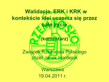 Walidacja, ERK i KRK w kontekście idei uczenia się przez całe życie (komentarz) Związek Rzemiosła Polskiego Józef Jacek Hordejuk Warszawa 19.04.2011 r. Związek Rzemiosła Polskiego Z doświadczeń ZRP wynika, że najlepsze efekty osiąga się z uczenia osób w różnych miejscach, formach i okresach życia, a nade wszystko z praktyki zawodowej; Stąd też bardzo istotna jest gwarancja państwa równego traktowania różnorodnych dróg dojścia do efektu finalnego (cząstkowych, pełnych, z wymaganymi dodatkowymi uprawnieniami) kwalifikacji! Związek Rzemiosła Polskiego Bez wątpienia punktem kluczowym jest wiedza, umiejętności i szerokie kompetencje, nie zaś cechy wyróżniające instytucje. Stąd najważniejszy jest „klient” , a instytucja potwierdzająca jego wartość na rynku pracy jedynie i aż potwierdza jego dla tego rynku (ale czytelnie i zrozumiale dla wszystkich partnerów) Związek Rzemiosła Polskiego Dla przykładu w krajach znających system dualny (Niemcy, Austria, Belgia) doskonale jest znana waga świadectwa czeladniczego lub dyplomu mistrzowskiego wydanych przez izbę rzemieślniczą w Polsce niż np. świadectwa ukończenia technikum zawodowego. Związek Rzemiosła Polskiego Cele LLL !? Spełniane są przez rzemiosło w zakresie kreatywności i innowacyjności, bowiem zależy to od każdej indywidualnej firmy. Pozostałe zależą od prawnych rozwiązań przygotowanych przez państwo. Związek Rzemiosła Polskiego Założenia KRK: - zadbać by nasze kwalifikacje miały rzeczywiste odniesienie do EQF; - społeczeństwo powinno poznać różne ścieżki dochodzenia do kwalifikacji (dziś zna głównie system formalny/szkolny). - uczenie się przez całe życie musi być wsparte praktyką, a nie zaliczaniem kolejnych progów (od przedszkola do doktoratu, a w finale kolejka na liście bezrobotnych w PUP-ie) Związek Rzemiosła Polskiego Cele KRK II Siłą rzeczy i tradycji ZRP skoncentrowane jest na edukacji zawodowej. Jeśli mamy stworzyć warunki uznawania kwalifikacji nadawanych w Polsce (głównie w UE) musimy zgrabnie „nałożyć” nasz system na rozpoznawalne systemy w UE. Związek Rzemiosła Polskiego Europejski kontekst walidacji Wypadałoby tylko przyklasnąć zaleceniom Parlamentu UE, gdyby… Nie konieczność opracowania KRK przez Polskę. I tu jest problem, bo wstępne proponowanie podziały na 8 ram preferowały system szkolny. Związek Rzemiosła Polskiego W świetle proponowanych obecnie przez MEN zmian absolwent ZSZ lub technikum może opuścić szkołę bez kwalifikacji, z jedną lub dwoma (na ile podzieli ten zawód MEN); Stąd też naturalnym procesem jest by KRK oprzeć na rzeczywistych i potwierdzonych na odpowiednim poziomie kwalifikacjach zawodowych, w systemie nie- lub poza formalnym (a nie tylko na ukończeniu odpowiedniego typu szkoły). Związek Rzemiosła Polskiego Cele… Tak, ale akceptacja także systemu potwierdzania kwalifikacji w rzemiośle; Tak, ale nasz czeladnik i mistrz powinien mieć adekwatny poziom jak jego odpowiednik w krajach UE (z uwzględnieniem różnych dróg do potwierdzenia kwalifikacji) Związek Rzemiosła Polskiego Walidacja jako odpowiedź na potrzeby: Diabeł tkwi w szczegółach! Z doświadczeń polskiego rzemiosła wiemy, ze np. Niemcy kontestują nasze proporcje teorii do praktyki w procesie dojścia do pełnych kwalifikacji (wygrywa to rzemiosło – tracą szkoły publiczne); Związek Rzemiosła Polskiego Inaczej np. w Belgii, gdzie zawody „murarz” i „tynkarz” są rozdzielone, a w Polsce mieści się to w pełnej kwalifikacji murarza. W kwalifikacji tak, ale na rynku pracy jest podobnie jak w Belgii – czyli specjalizacja! W Belgii nasz glazurnik nie może położyć terrakoty na tarasie budynku na najwyższym piętrze, gdyż wchodzi to w zakres kwalifikacji dekarza! I tu nawet nie chodzi o kwalifikacje, tylko o system rozliczeń VAT (nie masz kwalifikacji odpowiednich – nie możesz rozliczyć faktury, bo pilnuje tego firma ubezpieczeniowa. Stąd popularna w Belgii forma sp. z. oo skupiająca fachowców różnych specjalności). Związek Rzemiosła Polskiego Zasady: Winny być spójne z zasadami UE, ale… Pomni doświadczeń europejskich powinniśmy raczej ostrożnie „na wyrost” ustawiać kwalifikacje naszych fachowców, niż z założenia ustawiać ich na niższym poziomie niż ich odpowiedniki w krajach UE. Związek Rzemiosła Polskiego Instytucje: Już po rezultatach kilku debat widać, że prace nad skonstruowaniem KRK są źródłem wielu nieporozumień – jawi się potrzeba powołania IKSK. Abstrahując od standardów jakości/licencjonowania itd.., itd.. , monitoringu, rejestrów, walidacji i przeprowadzania egzaminów, prowadzenia banku pytań… i tak można by to mnożyć. Związek Rzemiosła Polskiego Proszę wskazać nam jedną, jedyną instytucję w Polsce, w której są wszystkie niezbędne informacje o ścieżce zawodowej kandydata do zdobycia kwalifikacji czeladniczych lub mistrzowskich (staż pracy, szkoły, praktyki krajowe lub zagraniczne itp.. czyli cała ścieżka formalna, nieformalna i pozaformalna) jest zapisana w archiwach co najmniej od 1945 r. w każdej izbie rzemieślniczej przeprowadzającej egzaminy na tych poziomach). Związek Rzemiosła Polskiego Konkludując: Jeśli KRK mają być rzeczywistym odzwierciedleniem wiedzy, umiejętności i kompetencji – przy ich konstrukcji należy uwzględnić: - różne sposoby zdobywania kwalifikacji; - pamiętać o kontekście europejskim (syndrom polskiego hydraulika); - zerwać ostatecznie z automatycznym przypisaniem posiadania kwalifikacji z ukończeniem określonego typu szkoły! Związek Rzemiosła Polskiego Jeden z Prezydentów USA wypowiedział kiedyś w debacie pamiętną frazę: „Przede wszystkim gospodarka, durniu” Związek Rzemiosła Polskiego od lat bije się o podobne spojrzenie: „Praktyka zawodowa, durniu!!” Pech chce, że my to widzieliśmy w rzemiośle od lat, a w innych sektorach dopier