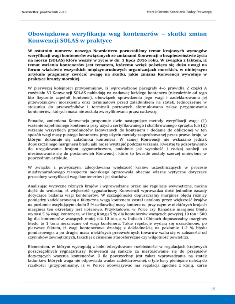 Newsletter, październik 2016 Marek Czernis Kancelaria Radcy Prawnego Obowiązkowa weryfikacja wag kontenerów – skutki zmian Konwencji SOLAS w praktyce W ostatnim numerze naszego Newslettera poruszaliśmy temat krajowych wymogów weryfikacji wagi kontenerów związanych ze zmianami Konwencji o bezpieczeństwie życia na morzu (SOLAS) które weszły w życie w dn. 1 lipca 2016 roku. W związku z faktem, iż temat ważenia kontenerów jest tematem, któremu wciąż poświęca się dużo uwagi na forum właściwie wszystkich międzynarodowych organizacjach morskich, w niniejszym artykule pragniemy zwrócić uwagę na skutki, jakie zmiana Konwencji wywołuje w praktyce branży morskiej. W pierwszej kolejności przypomnijmy, iż wprowadzone paragrafy 4-6 prawidła 2 części A rozdziału VI Konwencji SOLAS nakładają na nadawcę każdego kontenera (niezależnie od tego kto fizycznie zapełnił kontener), obowiązek sprawdzenia jego wagi i zadeklarowania jej przewoźnikowi morskiemu oraz terminalowi przed załadunkiem na statek. Jednocześnie w stosunku do przewoźników i terminali portowych sformułowano zakaz przyjmowania kontenerów, których masa nie została zweryfikowana przez nadawcę. Ponadto, zmieniona Konwencja proponuje dwie następujące metody weryfikacji wagi: (1) ważenie zapełnionego kontenera przy użyciu certyfikowanego i skalibrowanego sprzętu; lub (2) ważenie wszystkich przedmiotów ładowanych do kontenera i dodanie do obliczonej w ten sposób wagi masy pustego kontenera, przy użyciu metody zaaprobowanej przez prawo kraju, w którym dokonuje się załadunku kontenera. W samej Konwencji nie wskazano jednak dopuszczalnego marginesu błędu jaki może wystąpić podczas ważenia. Kwestię tę pozostawiono do uregulowania krajom sygnatariuszom, podobnie jak wysokość i rodzaj sankcji za niestosowanie się do postanowień Konwencji, które to kwestie zostały szerzej omówione w poprzednim artykule. W związku z powyższym, zdecydowana większość krajów uczestniczących w procesie międzynarodowego transportu morskiego opracowała obecnie własne wytyczne dotyczące procedury weryfikacji wagi kontenerów i jej skutków. Analizując wytyczne różnych krajów i wprowadzane przez nie regulacje wewnętrzne, można dojść do wniosku, iż większość sygnatariuszy Konwencji wprowadza dość jednolite zasady dotyczące badania wagi kontenerów. W szczególności dopuszczalny margines błędu różnicy pomiędzy zadeklarowaną a faktyczną wagą kontenera został ustalony przez większość krajów na poziomie oscylującym około 5 % całkowitej masy kontenera, przy czym w niektórych krajach margines ten określany jest ilościowo. Przykładowo, w Polce czy Kanadzie margines błędu wynosi 5 % wagi kontenera, w Hong Kongu 5 % dla kontenerów ważących powyżej 10 ton i 500 kg dla kontenerów ważących mniej niż 10 ton, a w Indiach i Chinach dopuszczalny margines błędu to 1 tona niezależnie od wagi kontenera. Takie regulacje wydają się uzasadnione, po pierwsze faktem, iż wagi kontenerowe działają z dokładnością na poziomie 1-2 % błędu pomiarowego, a po drugie, masa niektórych przewożonych towarów waha się w zależności od czynników zewnętrznych, takich jak ciśnienie atmosferyczne czy wilgotność powietrza. Elementem, w którym występują z kolei zdecydowane rozbieżności w regulacjach krajowych poszczególnych sygnatariuszy Konwencji są sankcje za niestosowanie się do przepisów dotyczących ważenia kontenerów. O ile powszechny jest zakaz wprowadzania na statek ładunków których waga nie odpowiada wadze zadeklarowanej, o tyle kary pieniężne należą do rzadkości (przypominamy, iż w Polsce obowiązywać ma regulacja zgodnie z którą, karze 15 Newsletter, październik 2016 Marek Czernis Kancelaria Radcy Prawnego pieniężnej nieprzekraczającej dwudziestokrotnego przeciętnego miesięcznego wynagrodzenia, podlega ten, kto nie wykonuje obowiązków weryfikacji wagi lub nie przekazuje informacji o wadze, określa wagę kontenera różniącą się od masy rzeczywistej o więcej niż 5%, nie przekazuje dyrektorowi urzędu morskiego informacji o wykrytych różnicach w masie kontenera większych niż 5%, ładuje na statek kontener bez zweryfikowanej wagi). Niemniej jednak, należy zauważyć, że niezaładowanie kontenera na statek samo w sobie stanowi dla załadowcy karę wystarczająco motywującą do stosowania się do zaleceń Konwencji. Rozważane jest również rozwiązanie zgodnie z którym kontenery, które nie posiadają weryfikacji wagi, będą ważone na koszt załadowcy przez terminale przeładunkowe. Rozwiązanie takie zasługiwałoby na aprobatę, gdyż ten rodzaj sankcji nie opóźniałby procesu transportowego kontenera. Niektóre kraje idą jednak krok dalej, niż nakazuje im Konwencja i wprowadzają własne rozwiązania do procedury ważenia. Przykładowo, w Indiach przyjęto obowiązek przekazywania wszelkich informacji dotyczących wagi kontenerów w formie elektronicznej dostępnej dla załadowcy, terminalu i kapitana statku przewożącego ładunek i całkowicie zrezygnowano z przekazywania tych informacji w formie pisemnej. Należy jednak zaznaczyć, że data wejścia w życie przepisów wprowadzających to nowatorskie rozwiązanie była zmieniana już kilkukrotnie, gdyż zarówno terminale jak i przewoźnicy mają problemy z dostosowaniem się do wskazanych regulacji (według indyjskiego rządu, tradycyjna forma dokumentów ma być honorowana do końca listopada 2016 roku). Wśród organizacji, takich jak Global Shippers Forum, mówi się niestety również o praktykach podejmowanych przez niektórych przewoźników i spedytorów, polegających na wprowadzaniu dodatkowych opłat nieuzasadnionych przez warunki rynkowe. Według organizacji, pobierane są one pod pozorem m.in. czynności przekazywania informacji o wadze ładunków czy kosztów administracyjnych. Niektórzy przewoźnicy oraz terminale przeładunkowe stos