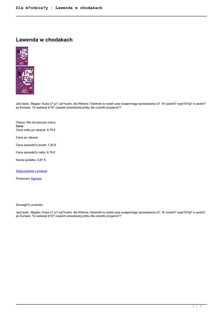 Dla m?odzie?y : Lawenda w chodakach Lawenda w chodakach Jest lipiec. Magda i Kuba s? ju? zar?czeni, dla Wiktora i Damroki to nadal czas wzajemnego sprawdzania si?. W czwórk? wyje?d?aj? w podró? po Europie. Te wakacje b?d? czasem prawdziwej próby dla czwórki przyjació?? Ocena: Nie ma jeszcze oceny Cena Cena netto po rabacie: 6,79 € Cena po rabacie Cena sprzeda?y brutto: 7,40 € Cena sprzeda?y netto: 6,79 € Kwota podatku: 0,61 € Zadaj pytanie o produkt Producent: Egmont Szczegó?y produktu Jest lipiec. Magda i Kuba s? ju? zar?czeni, dla Wiktora i Damroki to nadal czas wzajemnego sprawdzania si?. W czwórk? wyje?d?aj? w podró? po Europie. Te wakacje b?d? czasem prawdziwej próby dla czwórki przyjació?? 1 / 1 Powered by TCPDF (www.tcpdf.org)