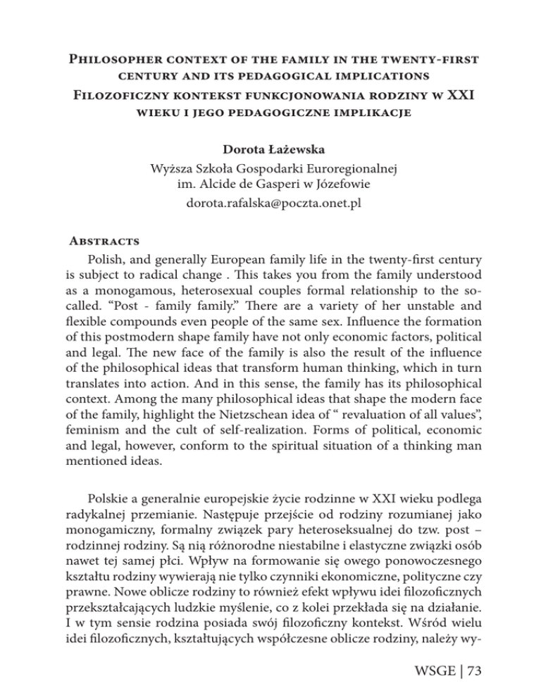 Philosopher context of the family in the twenty-first century and its pedagogical implications Filozoficzny kontekst funkcjonowania rodziny w XXI wieku i jego pedagogiczne implikacje Dorota Łażewska Wyższa Szkoła Gospodarki Euroregionalnej im. Alcide de Gasperi w Józefowie [email protected] Abstracts Polish, and generally European family life in the twenty-first century is subject to radical change . This takes you from the family understood as a monogamous, heterosexual couples formal relationship to the socalled. “Post - family family.” There are a variety of her unstable and flexible compounds even people of the same sex. Influence the formation of this postmodern shape family have not only economic factors, political and legal. The new face of the family is also the result of the influence of the philosophical ideas that transform human thinking, which in turn translates into action. And in this sense, the family has its philosophical context. Among the many philosophical ideas that shape the modern face of the family, highlight the Nietzschean idea of “ revaluation of all values”, feminism and the cult of self-realization. Forms of political, economic and legal, however, conform to the spiritual situation of a thinking man mentioned ideas. Polskie a generalnie europejskie życie rodzinne w XXI wieku podlega radykalnej przemianie. Następuje przejście od rodziny rozumianej jako monogamiczny, formalny związek pary heteroseksualnej do tzw. post – rodzinnej rodziny. Są nią różnorodne niestabilne i elastyczne związki osób nawet tej samej płci. Wpływ na formowanie się owego ponowoczesnego kształtu rodziny wywierają nie tylko czynniki ekonomiczne, polityczne czy prawne. Nowe oblicze rodziny to również efekt wpływu idei filozoficznych przekształcających ludzkie myślenie, co z kolei przekłada się na działanie. I w tym sensie rodzina posiada swój filozoficzny kontekst. Wśród wielu idei filozoficznych, kształtujących współczesne oblicze rodziny, należy wy- WSGE | 73 różnić nietzscheańską ideę „przewartościowania wszystkich wartości”, feminizm oraz kult samorealizacji. Formy polityczne, ekonomiczne i prawne natomiast dostosowują się do duchowej sytuacji człowieka myślącego wspomnianymi ideami. Key words: feminizm, nowa antropologia, postmodernizm, indywidualizm, rodziny alternatywne Wprowadzenie Struktura oraz funkcjonowanie rodziny w XXI podlegają radykalniej zmianie. Opis socjologiczny informuje, iż rodzina pustoszeje, fragmentaryzuje się i starzeje (Donati, 2010, s. 21). Tradycyjne formy rodzinności, rozumiane jako związek monogamiczny pary heteroseksualnej, zostają powoli wypierane przez związki nazywane zrekonstruowanymi, wielokrotnie złożonymi, mieszanymi (blended family), przekomponowanymi, patchworkowymi. Przedmiotem wyboru jest też życie w samotności, kohabitacja oraz związki homoseksualne (Mizielińska, 2009; Slany, 2002). Tempo przejścia od rodziny tradycyjnej do form życia alternatywnego jest dość szybkie. Zmiany te bowiem są widoczne na przestrzeni dekady, a nie stulecia. Poszukując odpowiedzi na pytanie o przyczyny transformacji życia rodzinnego, można posługiwać się teoriami pochodzącymi z różnych dziedzin wiedzy. Na kształt rodziny wpływają bowiem czynniki społeczne, ekonomiczne i prawne będące przedmiotem analizy ekonomistów, prawników, socjologów, politologów oraz pedagogów. I tak zdaniem niektórych badaczy zmiany życia rodzinnego są uwarunkowane procesem globalizacji (Tchorzewski, 2006). Inni zaś uważają, iż to, czym powinna być rodzina, zależy od decyzji politycznych. Władza ustawodawcza decyduje bowiem, które wspólnoty mają prawo do nazywania się rodziną (Adamiecka - Sitek, 2009). Rodzinę w XXI wieku można również rozumieć jako swoiste wydarzenie filozoficzne. Sformułowanie wydarzenie filozoficzne zostało użyte przez Leszka Kołakowskiego, który stwierdził, iż wydarzeniem filozoficznym był upadek komunizmu. Pod pojęciem wydarzenia filozoficznego myśliciel ten rozumiał pojawienie się nowych idei przekształcających ludzkie myślenie i działanie (1999). I tak uwidocznienie się pewnych znaczących idei nastąpiło w połowie XX wieku. Owe idee to nowe sposoby myślenia na temat kultury, sztuki, nauki, życia religijnego, indywidualnego i społecz- 74 | WSGE nego w tym również na temat form życia rodzinnego, funkcji i relacji wewnątrzrodzinnych (Slany, 2002). Ten nowy stan ludzkiego ducha i wrażliwości moralnej został nazwany postmoderną (Welsch, 1998). Opisywane zaś przez socjologów nowe formy rodzinności określono terminem post – rodzinna rodzina (Slany, s. 55). Rodzina XXI wieku może zatem spełnić rolę lustra odbijającego ponowoczesne znamiona świata. Rodzina XXI wieku to również filmowy kadr utrwalający ową ponowoczesność przenikającą różnorodne obszary ludzkiej aktywności. I w tym sensie rodzinę XXI wieku można uznać za „wydarzenie filozoficzne”. Obecny kształt rodzinności został bowiem uformowany pod wpływem idei typowych dla ponowoczesności. Do owych ponowoczesnych idei, które przekształciły myślenie o rodzinie, odbijając się na jej kształcie, można zaliczyć feminizm oraz nową antropologię. Feminizm Współczesny socjolog M. Castells uważa feminizm za najważniejszą rewolucję, która dokonała się na naszej planecie (Slany, 2002). Silnie oddziałujące na umysły współczesnych kobiet idee feminizmu są różnorodne i elastyczne, trudne do klasyfikowania. Jednak z powodu związku feminizmu z marksizmem (Ślęczka, 1999; Zdybicka, 2007) można zidentyfikować pewien specyficzny dla ruchów feministycznym schemat myślowy wywodzący się właśnie z przemyśleń Karola Marksa. Elementem ściśle marksistowskim jest bowiem teoria walki klas. Zdaniem Marksa historia społeczeństw to dzieje ucisku jednej klasy społecznej przez drugą. Ową klasa uciskaną, jak sądził w XIX wieku Mar