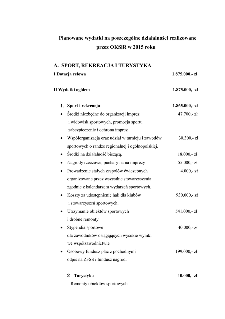 Planowane wydatki na poszczególne działalności realizowane przez OKSiR w 2015 roku A. SPORT, REKREACJA I TURYSTYKA I Dotacja celowa 1.875.000,- zł II Wydatki ogółem 1.875.000,- zł 1. Sport i rekreacja Środki niezbędne do organizacji imprez 1.865.000,- zł 47.700,- zł i widowisk sportowych, promocja sportu zabezpieczenie i ochrona imprez Współorganizacja oraz udział w turnieju i zawodów 30.300,- zł sportowych o randze regionalnej i ogólnopolskiej. Środki na działalność bieżącą. 18.000,- zł Nagrody rzeczowe, puchary na na imprezy 55.000,- zł Prowadzenie stałych zespołów ćwiczebnych 4.000,- zł organizowane przez wszystkie stowarzyszenia zgodnie z kalendarzem wydarzeń sportowych. Koszty za udostępnienie hali dla klubów 930.000,- zł i stowarzyszeń sportowych. Utrzymanie obiektów sportowych 541.000,- zł i drobne remonty Stypendia sportowe 40.000,- zł dla zawodników osiągających wysokie wyniki we współzawodnictwie Osobowy fundusz płac z pochodnymi 199.000,- zł odpis na ZFŚS i fundusz nagród. 2. Turystyka Remonty obiektów sportowych 10.000,- zł B. IZBA REGIONALNA ZIEMI ŚWIECKIEJ I ZAMEK I Przychody ogółem 1. Dotacja celowa. 2. Przychody własne w tym: 170.000,- zł 130.000,- zł 40.000,- zł (sprzedaż biletów wstępu, wydawnictw oraz inne przychody). II Wydatki ogółem 170.000,- zł Osobowy fundusz płac z pochodnymi. 72.000,- zł Umowy zlecenia (dozorca i przewodnik sezonowy). 18.000,- zł Odpis na Zakładowy Fundusz Świadczeń Socjalnych. 2.000,- zł 1. Izba Regionalna Ziemi Świeckiej 29.500,- zł 18.000,- zł Utrzymanie Izby Regionalnej (opłaty za energię elek., wodę i kanalizację, rozmowy telefoniczne, opłaty pocztowe, ubezpieczenie mienia, renowacja i konserwacja eksponatów inne wydatki związane z prowadzeniem Izby). Zakup eksponatów. 2.000,- zł Naprawy i remonty. 2.000,- zł Druk folderów i materiałów reklamowych o Izbie. 4.000,- zł Wydatki na konkursy, spotkania i imprezy. 2.500,- zł Podróże służbowe. 1.000,- zł 2. Zamek pokrzyżacki 48.500,- zł Utrzymanie zamku 10.000,- zł (opłaty za energię elek., toalety, środki czystości, wywóz śmieci, ubezpieczenie mienia i osób, opłaty telefoniczne, ochrona obiektu i inne drobne wydatki). Zakup eksponatów. Bieżące remonty. 3.000,- zł 15.500,- zł Organizacja imprez kulturalnych: 20.000,- zł C. CENTRUM KULTURY FILMOWEJ KINO „WRZOS” I Przychody ogółem 1 .040.000,- zł 1. Dotacja celowa 300.000,- zł 2. Przychody własne (sprzedaż biletów) 440.000,- zł 3. Dofinansowanie PISF (wymiana foteli) 300.000,- zł II Wydatki ogółem 1.040.000,- zł Osobowy fundusz płac z pochodnymi DKF „Klaps 2” 10.000,- zł Umowy zlecenia dla drugiego kinooperatora. 22.000,- zł Opłaty dla dystrybutorów za wynajem filmu. 220.000,- zł Koszty wysyłki filmów. Opłaty dla ZAiKS Wymiana foteli kinowych, wykładziny, oświetlenia, Malowanie sali widowiskowej 10.000,- zł Środki niezbędne do organizacji festiwali, spotkań, 15.000,- zł 150.000,- zł 3.000,- zł 10.000,- zł 590.000,- zł warsztatów, reklamy imprez. Zakup lampy do projektora 4.000,- zł Bieżące zakupy do kabiny projekcyjnej 6.000,- zł D. ANIMACJA, PROMOCJA I UPOWSZECHNIANIE KULTURY I Przychody ogółem 1.340.000,- zł Dotacja celowa 800.000,- zł Dotacja MKiDN i ZMN 105.000,- zł Pozostałe dotacje od firm i innych instytucji Przychody własne (z organizacji imprez, spektakli, warsztatów i inne) 65.000,- zł 370.000,- zł II Wydatki ogółem 1.340.000,- zł Osobowy fundusz płac z pochodnymi 380.000,- zł Umowy zlecenia dla instruktorów merytorycznych 100.000,- zł zatrudnionych na godziny do realizacji projektów oraz inne zlecenia 1. Pracownia teatralna i kultury słowa 15.000,- zł 10.000,- zł Środki niezbędne do realizacji konkursów poetyckich, recytatorskich, warsztatów i innych programów promujących kulturę słowa Środki na potrzeby grupy teatralnej 5.000,- zł 2. Pracownia filmowa i fotograficzna 10.000,- zł Środki niezbędne do realizacji konkursów, 5.000,- zł warsztatów, wystaw, plenerów i programów promujących sztukę Zakup podstawowych materiałów do zajęć 5.000,- zł 3. Projekt „Żyj Kulturą” 50.000,- zł Promocja projektu 10.000,- zł Środki na projekty 40.000,- zł 4. Pracownia tańca i śpiewu 20.000,- zł Środki na zespoły taneczne 5.000,- zł Środki na zespoły wokalne i muzyczne 5.000,- zł Projekt „Klaustrofonia” 5. CDP „Akademia” i Otwarta Strefa Twórcza 10.000,- zł 45.000,- zł Zakup podstawowych materiałów plastycznych do zajęć 10.000,- zł Środki finansowe niezbędne do organizacji wystaw, 15.000,- zł plenerów, warsztatów, konkursów i innych działań artystycznych Otwarta Strefa Twórcza – Gruczno 20.000,- zł 6. Wyspa Skarbów – oferta dla dzieci 25.000,- zł Zakup podstawowych materiałów do zajęć 10.000,- zł Organizacja różnych imprez dla dzieci 15.000,- zł 7. Klub seniora „Kociewiacy” 15.000,- zł 8. Punkt informacji, promocja działań 160.000,- zł Działalność informacyjna 90.000,- zł w tym miesięcznik „Teraz Świecie” Działania związane z promocją kultury i wolontariatem 40.000,- zł Zakup gadżetów promocyjnych z logo 30.000,- zł miasta do sprzedaży w PIT 9. Organizacja imprez: 1. Dni Ziemi Świeckiej 2. Festiwal Orkiestr Dętych 520.000,- zł 30.000,- zł 120.000,- zł 3. Blues na Świecie 90.000,- zł 4. MPO „Nocne Śpiewanie” 40.000,- zł 5. Pozostałe wydarzenia kulturalne 240.000,- zł oraz projekty artystyczne E. DOM KULTURY I AMFITEATR I Przychody ogółem Dotacja celowa Pokrycie kosztów amortyzacji budynków i środków trwałych 1.680.000,- zł 1.260.000,- zł 170.000,- zł Dofinansowanie MKiDN projektu adaptacji pomieszczeń 200.000,- zł Przychody własne z wynajmu pomieszczeń II Wydatki ogółem 1. Dom Kultury 50. 000,- zł 1.680.000,- zł 1.630.000,- zł Osobowy fundusz płac z pochodnymi Zakładowy fundusz nagród 99.000,- zł Odpis na Zakładowy Fundusz Świadczeń Socjal