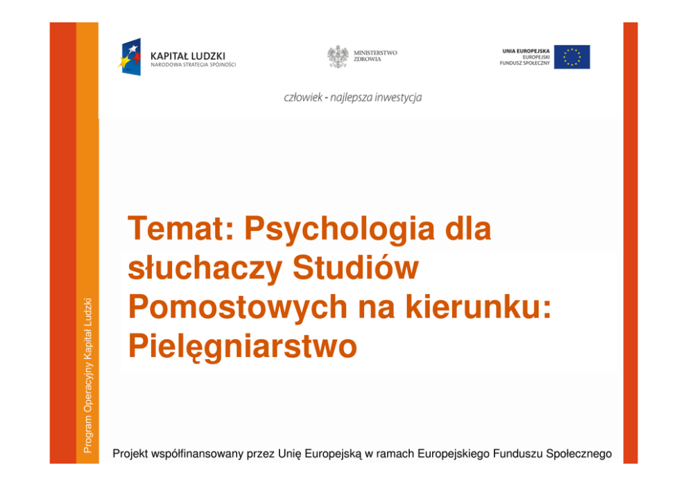 Temat: Psychologia dla słuchaczy Studiów Pomostowych na kierunku: Pielęgniarstwo Projekt współfinansowany przez Unię Europejską w ramach Europejskiego Funduszu Społecznego WALTER BRADFORD CANNON Fizjolog eksperymentalny 1871-1945 Autor pojęcia: „homeostaza” „szok traumatyczny” STRES FIZJOLOGICZNY W.B. Cannon reakcja „walcz lub uciekaj” Stres jako tzw. stan pogotowia, pełniący funkcje adaptacyjne (nastawia i przygotowuje organizm do radzenia sobie z niebezpieczeństwem). Stymulacja współczulnego układu nerwowego i hormonalnego prowadzi do gwałtownego wzrostu poziomu epinefryny (adrenaliny) i norepinefryny (noradrenaliny) oraz pobudzeniem układu sympatycznego. • Prowadzi to do wzmożenia akcji serca, wzrostu ciśnienia krwi, wzrostu poziomu cukru we krwi przyspieszenia oddechu, wzrostu napięcia mięśni szkieletowych, zmniejszenia dopływu krwi do skóry i mięśni szkieletowych. •Jednak, kiedy stan taki trwa długi czas może doprowadzić do wyczerpania zasobów energetycznych organizmu i stanowić potencjalne zagrożenie zdrowia (tzw. choroby psychosomatyczne) STRES FIZJOLOGICZNY Hans Selye ogólny zespół adaptacyjny GAS • • • • Stres to niespecyficzna reakcja organizmu, powstająca w odpowiedzi na działanie bodźców szkodliwych (stresorów). Wywołuje ona w organizmie istot żywych tak zwany Ogólny Zespół Adaptacyjny, tzn. zespół zmian o postaci niezależnej od rodzaju urazu. Zespół ten przebiega w trzech kolejnych stadiach: stadium reakcji alarmowej – podczas której zostają zmobilizowane siły obronne. Jest inicjowane przez fazę szoku. Obok zmian specyficznych wywołuje zmiany niespecyficzne (spadek ciśnienia krwi, spadek ciepłoty ciała) stadium odporności – czyli pełnego przystosowania do stresora. Organizm podejmuje wysiłki obronne (rośnie ciśnienie krwi, rośnie ciepłota ciała). stadium wyczerpania: pojawiające się w sytuacji gdy stresor jest odpowiednio nasilony i działa przez odpowiednio długi czas. Następuje wzrost uogólnionego pobudzenia organizmu, które nie jest korzystne do zwalczania stresowa. Następuje rozregulowanie funkcji fizjologicznych i spadek zdolności obronnych. W skrajnych wypadkach zmiany mogą prowadzić do śmierci STRES FIZJOLOGICZNY Hans Selye dystres = stres deprywacji, przeciążenia prowadzącego do choroby, niesie cierpienie i dezintegrację psychiczną, może powodować frustrację, zachowania agresywne eustres = stan zadowolenia, motywuje człowieka do podejmowania wysiłku i dążenia do osiągnięć życiowych STRES FIZJOLOGICZNY Hans Selye STRESOR REAKCJA ALARMOWA ODPORNOŚĆ: USUWANIE STRESORA CHOROBA ADAPTACJI CHOROBY NEREK, WIEŃCOWA, ALERGIE WYCZERPANIE: UTRATA ZDOLNOSCI OBRONY GRINKER, ROY R. LT. COL.; SPIEGEL, JOHN P. MAJOR, 1945 „Men under stress in and after combat” Symptomy w reakcji na stres walki (combat fatigue, operational fatique) Zdenerwowanie (restlesness) Drażliwość i zachowania agresywne Zmęczenie po obudzeniu się i ospałość Trudności z zasypianiem, subiektywny lęk Łatwe męczenie się Reakcja przestrachu Depresja Zmiany osobowości i zakłócenia pamięci Drżenie i objawy nadaktywności układu sympatycznego Trudności w koncentracji uwagi Poczucie zagubienia (confusion) Zwiększono spożycie alkoholu STRES PSYCHOLOGICZNY • Gringer i Spigel z 1945: pewne aspekty walki, mimo, iż nie wywołują uszkodzeń fizycznych przyczyniały się do powstawania zaburzeń psychicznych i fizjologicznych u żołnierzy. • Stres psychologiczny to całokształt czynników, które wpływają na człowieka wykonującego działania bojowe (zagrożenie życia, zdrowia, zależność od przełożonych, izolacja od bliskich, brak snu i odżywiania) STRES PSYCHOLOGICZNY • Współcześnie stres nie jest lokalizowany ani w jednostce ani w otoczeniu, ale dotyczy określonego rodzaju relacji (interakcji, transakcji) między nimi. • Transakcja ta zwykle ujmowana jest jako zakłócenie lub zapowiedź zakłócenia równowagi pomiędzy zasobami bądź możliwościami jednostki z jednej strony a wymaganiami otoczenia z drugiej • Stres nie jest więc immanentną cechą bodźca, istniejącą poza jego stosunkiem do aktualnych dążeń i oczekiwań człowieka oraz do stałych jego cech, takich jak potrzeby, schematy poznawcze, cechy fizyczne, wartości. TRANSAKCYJNA TEORIA STRESU R. Lazarus i S. Folkman • Stres psychiczny jest to szczególny rodzaj transakcji pomiędzy człowiekiem a otoczeniem, które to otoczenie człowiek ocenia jako nadwerężające lub przekraczające jego zasoby i jako zagrażające jego dobrostanowi. Dotyczy to także „otoczenia wewnętrznego” człowieka. • Podstawowym mechanizmem odpowiadającym za stres psychologiczny jest ocena poznawcza otoczenia (ocena pierwotna), rozumiana jako mechanizm oceniający, uświadamiający i interpretujący zdarzenia „co to dla mnie znaczy?”. Po niej następuje ocena wtórna: „co mogę z tym zrobić?” • Wynikiem oceny może być wniosek w postaci: Brak zagrożenia, sytuacja bez znaczenia, nie istotna (brak stresu) Krzywda/strata (stres) Zagrożenie (stres) • Wyzwanie, sytuacja sprzyjająco – pozytywna (stres). TRANSAKCYJNA TEORIA STRESU R. Lazarusa i S. Folkman • Krzywda/strata dotyczy już zaistniałej szkody w postaci utraty wartościowych obiektów (samoocena, bliska osoba). Towarzyszą jej emocje: złość, żal, smutek. • Zagrożenie odnosi się do takich samych szkód, które jednak dopiero mogą zaistnieć, aktualnie natomiast są antycypowane. Towarzyszą emocje: strach, lęk, zamartwianie się. • Wyzwanie ma również charakter antycypacyjny, ale dotyczy sytuacji, w których możliwe są zarówno szkody i straty, jak i korzyści. Towarzyszą jej emocje: wspomniane wyżej ale i nadzieja, zapał, podniecenie. TRANSAKCYJNA TEORIA STRESU R. Lazarus i S. Folkman Brak stresu SYTUACJA Brak stresu OCENA PIERWOTNA OCENA WTÓRNA co to dla mnie znaczy? co mogę z tym zrobić? RADZENIE SO