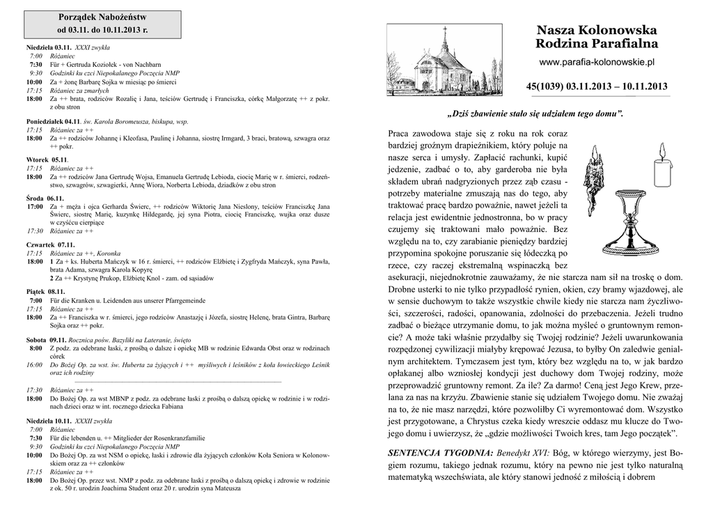 Porządek Nabożeństw od 03.11. do 10.11.2013 r. Niedziela 03.11. XXXI zwykła 7:00 Różaniec 7:30 Für + Gertruda Koziołek - von Nachbarn 9:30 Godzinki ku czci Niepokalanego Poczęcia NMP 10:00 Za + żonę Barbarę Sojka w miesiąc po śmierci 17:15 Różaniec za zmarłych 18:00 Za ++ brata, rodziców Rozalię i Jana, teściów Gertrudę i Franciszka, córkę Małgorzatę ++ z pokr. z obu stron Poniedziałek 04.11. św. Karola Boromeusza, biskupa, wsp. 17:15 Różaniec za ++ 18:00 Za ++ rodziców Johannę i Kleofasa, Paulinę i Johanna, siostrę Irmgard, 3 braci, bratową, szwagra oraz ++ pokr. Wtorek 05.11. 17:15 Różaniec za ++ 18:00 Za ++ rodziców Jana Gertrudę Wojsa, Emanuela Gertrudę Lebioda, ciocię Marię w r. śmierci, rodzeństwo, szwagrów, szwagierki, Annę Wiora, Norberta Lebioda, dziadków z obu stron Środa 06.11. 17:00 Za + męża i ojca Gerharda Świerc, ++ rodziców Wiktorię Jana Nieslony, teściów Franciszkę Jana Świerc, siostrę Marię, kuzynkę Hildegardę, jej syna Piotra, ciocię Franciszkę, wujka oraz dusze w czyśćcu cierpiące 17:30 Różaniec za ++ Czwartek 07.11. 17:15 Różaniec za ++, Koronka 18:00 1 Za + ks. Huberta Mańczyk w 16 r. śmierci, ++ rodziców Elżbietę i Zygfryda Mańczyk, syna Pawła, brata Adama, szwagra Karola Kopyrę 2 Za ++ Krystynę Prukop, Elżbietę Knol - zam. od sąsiadów Piątek 7:00 17:15 18:00 08.11. Für die Kranken u. Leidenden aus unserer Pfarrgemeinde Różaniec za ++ Za ++ Franciszka w r. śmierci, jego rodziców Anastazję i Józefa, siostrę Helenę, brata Gintra, Barbarę Sojka oraz ++ pokr. Sobota 09.11. Rocznica pośw. Bazyliki na Lateranie, święto 8:00 Z podz. za odebrane łaski, z prośbą o dalsze i opiekę MB w rodzinie Edwarda Obst oraz w rodzinach córek 16:00 Do Bożej Op. za wst. św. Huberta za żyjących i ++ myśliwych i leśników z koła łowieckiego Leśnik oraz ich rodziny —–————–——————–—————–—————————–––—— 17:30 Różaniec za ++ 18:00 Do Bożej Op. za wst MBNP z podz. za odebrane łaski z prośbą o dalszą opiekę w rodzinie i w rodzinach dzieci oraz w int. rocznego dziecka Fabiana Niedziela 10.11. XXXII zwykła 7:00 Różaniec 7:30 Für die lebenden u. ++ Mitglieder der Rosenkranzfamilie 9:30 Godzinki ku czci Niepokalanego Poczęcia NMP 10:00 Do Bożej Op. za wst NSM o opiekę, łaski i zdrowie dla żyjących członków Koła Seniora w Kolonowskiem oraz za ++ członków 17:15 Różaniec za ++ 18:00 Do Bożej Op. przez wst. NMP z podz. za odebrane łaski z prośbą o dalszą opiekę i zdrowie w rodzinie z ok. 50 r. urodzin Joachima Student oraz 20 r. urodzin syna Mateusza Nasza Kolonowska Rodzina Parafialna www.parafia-kolonowskie.pl 45(1039) 03.11.2013 – 10.11.2013 „Dziś zbawienie stało się udziałem tego domu”. Praca zawodowa staje się z roku na rok coraz bardziej groźnym drapieżnikiem, który poluje na nasze serca i umysły. Zapłacić rachunki, kupić jedzenie, zadbać o to, aby garderoba nie była składem ubrań nadgryzionych przez ząb czasu potrzeby materialne zmuszają nas do tego, aby traktować pracę bardzo poważnie, nawet jeżeli ta relacja jest ewidentnie jednostronna, bo w pracy czujemy się traktowani mało poważnie. Bez względu na to, czy zarabianie pieniędzy bardziej przypomina spokojne poruszanie się łódeczką po rzece, czy raczej ekstremalną wspinaczką bez asekuracji, niejednokrotnie zauważamy, że nie starcza nam sił na troskę o dom. Drobne usterki to nie tylko przypadłość rynien, okien, czy bramy wjazdowej, ale w sensie duchowym to także wszystkie chwile kiedy nie starcza nam życzliwości, szczerości, radości, opanowania, zdolności do przebaczenia. Jeżeli trudno zadbać o bieżące utrzymanie domu, to jak można myśleć o gruntownym remoncie? A może taki właśnie przydałby się Twojej rodzinie? Jeżeli uwarunkowania rozpędzonej cywilizacji miałyby krępować Jezusa, to byłby On zaledwie genialnym architektem. Tymczasem jest tym, który bez względu na to, w jak bardzo opłakanej albo wzniosłej kondycji jest duchowy dom Twojej rodziny, może przeprowadzić gruntowny remont. Za ile? Za darmo! Ceną jest Jego Krew, przelana za nas na krzyżu. Zbawienie stanie się udziałem Twojego domu. Nie zważaj na to, że nie masz narzędzi, które pozwoliłby Ci wyremontować dom. Wszystko jest przygotowane, a Chrystus czeka kiedy wreszcie oddasz mu klucze do Twojego domu i uwierzysz, że „gdzie możliwości Twoich kres, tam Jego początek”. SENTENCJA TYGODNIA: Benedykt XVI: Bóg, w którego wierzymy, jest Bogiem rozumu, takiego jednak rozumu, który na pewno nie jest tylko naturalną matematyką wszechświata, ale który stanowi jedność z miłością i dobrem 45/2013 Asceta i myszka Pewien wielki i znany na całym świecie święty asceta mieszkał w ukrytej jaskini. Przez cały dzień zagłębiał się w medytacji, a jego myśli były zawsze zwrócone w stronę Boga. Pewnego dnia, kiedy oddawał się rozmyślaniu, z dziury wyszła myszka i zaczęła obgryzać mu sandały. Pustelnik otworzył oczy ze wściekłością. Dlaczego mi przeszkadzasz medytować? Bo jestem głodna - zapiszczała żałośnie myszka. Uciekaj stąd, paskudztwo - krzyknął asceta - jak śmiesz przeszkadzać mi właśnie wtedy, kiedy rozmawiam z Bogiem? Ciekawe w jaki sposób udaje ci się z Nim porozumieć - zapytała myszka - jeśli nie potrafisz rozmawiać nawet ze mną? ——————————–——————————————–——— Nasz parafialny cmentarz Cmentarz jest miejscem świętym. Przez poświęcenie oraz przez szacunek dla Tych którzy tam spoczywają. Cmentarz jest miejscem szczególnym w każdej miejscowości. Świadczy o żyjących, w danym pokoleniu. Każdy jest odpowiedzialny za porządek i czystość. Na cmentarzu zachowajmy powagę. O czystość i porządek między grobami i przy grobach dbają opiekujący się danym grobem. Śmieci wyrzucajmy tylko 