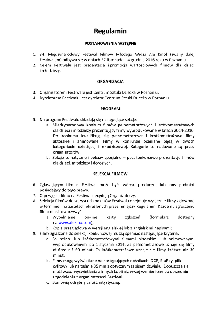 Regulamin POSTANOWIENIA WSTĘPNE 1. 34. Międzynarodowy Festiwal Filmów Młodego Widza Ale Kino! (zwany dalej Festiwalem) odbywa się w dniach 27 listopada – 4 grudnia 2016 roku w Poznaniu. 2. Celem Festiwalu jest prezentacja i promocja wartościowych filmów dla dzieci i młodzieży. ORGANIZACJA 3. Organizatorem Festiwalu jest Centrum Sztuki Dziecka w Poznaniu. 4. Dyrektorem Festiwalu jest dyrektor Centrum Sztuki Dziecka w Poznaniu. PROGRAM 5. Na program Festiwalu składają się następujące sekcje: a. Międzynarodowy Konkurs filmów pełnometrażowych i krótkometrażowych dla dzieci i młodzieży prezentujący filmy wyprodukowane w latach 2014-2016. Do konkursu kwalifikują się pełnometrażowe i krótkometrażowe filmy aktorskie i animowane. Filmy w konkursie oceniane będą w dwóch kategoriach: dziecięcej i młodzieżowej. Kategorie te nadawane są przez organizatorów. b. Sekcje tematyczne i pokazy specjalne – pozakonkursowe prezentacje filmów dla dzieci, młodzieży i dorosłych. SELEKCJA FILMÓW 6. Zgłaszającym film na Festiwal może być twórca, producent lub inny podmiot posiadający do tego prawo. 7. O przyjęciu filmu na Festiwal decydują Organizatorzy. 8. Selekcja filmów do wszystkich pokazów Festiwalu obejmuje wyłącznie filmy zgłoszone w terminie i na zasadach określonych przez niniejszy Regulamin. Każdemu zgłoszeniu filmu musi towarzyszyć: a. Wypełnienie on-line karty zgłoszeń (formularz dostępny na www.alekino.com), b. Kopia przeglądowa w wersji angielskiej lub z angielskimi napisami; 9. Filmy zgłaszane do selekcji konkursowej muszą spełniać następujące kryteria: a. Są pełno- lub krótkometrażowymi filmami aktorskimi lub animowanymi wyprodukowanymi po 1 stycznia 2014. Za pełnometrażowe uznaje się filmy dłuższe niż 60 minut. Za krótkometrażowe uznaje się filmy krótsze niż 30 minut. b. Filmy mogą wyświetlane na następujących nośnikach: DCP, BluRay, plik cyfrowy lub na taśmie 35 mm z optycznym zapisem dźwięku. Dopuszcza się możliwość wyświetlania z innych kopii niż wyżej wymienione po uprzednim uzgodnieniu z organizatorami Festiwalu. c. Stanowią odrębną całość artystyczną. 10. Ostateczny termin nadsyłania kart zgłoszeń i materiałów do selekcji konkursowej upływa 31 lipca 2016. 11. Odpowiedzialność za prawny tytuł do możliwości zgłoszenia filmu na Festiwal i rozporządzania nim leży po stronie Zgłaszającego. 12. Organizatorzy powiadomią Zgłaszających o rezultatach selekcji niezwłocznie po jej zakończeniu. 13. W przypadku zakwalifikowania filmu do pokazów na Festiwalu, należy niezwłocznie nadesłać na adres Festiwalu : a. wydrukowaną i podpisaną kartę zgłoszeń b. informacje do katalogu (szczegółowych informacji udzielą Organizatorzy), c. listę dialogową w ustalonej z Organizatorem wersji językowej, d. inne materiały promocyjne. 14. Po zakwalifikowaniu filmu do programu Festiwalu podpisane wydruki karty zgłoszeń i inne materiały należy przesłać na adres: Centrum Sztuki Dziecka w Poznaniu Św. Marcin 80/82 61-809 Poznań Fax +48 61 64 64 472 Filmy pełnometrażowe: [email protected], [email protected], Filmy krótkometrażowe: [email protected], [email protected] 15. Nadesłane wraz ze zgłoszeniem materiały będą odsyłane tylko wtedy, gdy zgłoszeniu towarzyszyć będzie pisemna prośba. DODATKOWE PRAWA FESTIWALU: 16. Zgłaszający film udziela Festiwalowi prawa do użycia: a. kopii filmu do głównego pokazu festiwalowego oraz dodatkowych projekcji w ramach Festiwalu, b. dostarczonych materiałów promocyjnych do publikacji festiwalowych (druki, strona internetowa Festiwalu, katalogi, program Festiwalu) oraz do celów promocji Festiwalu w mediach. Zgłaszający wyraża zgodę na redakcję przesłanych materiałów przez Organizatorów. c. fragmentów pokazywanego filmu w transmisjach telewizyjnych, związanych z Festiwalem (trailer lub fragment do 2 minut z filmu pełnometrażowego i do 1 minuty z krótkometrażowego) oraz w działaniach związanych z promocją filmu i Festiwalu. 17. Organizator ma prawo do użycia fragmentów filmu i materiałów promocyjnych do promocji kolejnych edycji Festiwalu na zasadach opisanych w pkt. 16. W zakresie wynikającym z pkt. 16. i 17. zgłaszający film odpowiednio udziela Organizatorowi licencji lub zezwala na nieodpłatne wykonywanie przez Organizatora praw zależnych do utworu. KOPIA FESTIWALOWA 18. Zgłaszający zobowiązuje się dostarczyć kopię filmu zakwalifikowanego na Festiwal do 14 listopada 2016 na adres Organizatora Festiwalu: Centrum Sztuki Dziecka w Poznaniu Św. Marcin 80/82 pok.345 61-809 Poznań 19. Kopia powinna być nagrana na nośniku zgodnym ze zgłoszonym, w wersji oryginalnej z napisami w języku angielskim (jeśli film nie jest w angielskiej wersji językowej), w dobrym stanie technicznym. 20. Kopia powinna być odpowiednio opisana. 21. Koszty przesłania kopii na Festiwal pokrywa Zgłaszający, chyba, że zostanie to inaczej uzgodnione z Organizatorami. Wysyłający kopię powinien przestrzegać instrukcji wysyłki, która zostanie mu przekazana przez Organizatora Festiwalu. Instrukcje zostaną przekazane wraz z informacją o wynikach selekcji. 22. Koszty odesłania pokrywa Festiwal chyba, że zostanie to inaczej uzgodnione ze Zgłaszającym. Festiwal zobowiązuje się zwrócić kopię filmu w stanie nie gorszym niż wynika to z normalnej eksploatacji. 23. Ubezpieczenie kopii, do wartości podanej w karcie zgłoszenia, pokrywa Festiwal. Obejmuje ono okres od przekazania Organizatorom kopii przez przewoźnika przywożącego do odbioru od Organizatora kopii przez przewoźnika odwożącego. 24. Kopia zostanie odesłana pod wskazany adres po zakończeniu Festiwalu. Organizator nie odpowiada za szkody wynikłe wskutek wadliwie wskazanego adresu. JURY I NAGRODY 25. Międzynarodowe jury profesjonalne przyzna: Złote Koziołki dla najlepszego filmu pełnometrażowego dla dzieci oraz nagrodę pieniężną dla