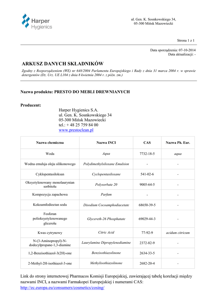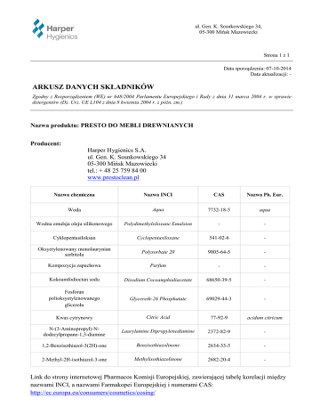 ul. Gen. K. Sosnkowskiego 34, 05-300 Mińsk Mazowiecki Strona 1 z 1 Data sporządzenia: 07-10-2014 Data aktualizacji: - ARKUSZ DANYCH SKŁADNIKÓW Zgodny z Rozporządzeniem (WE) nr 648/2004 Parlamentu Europejskiego i Rady z dnia 31 marca 2004 r. w sprawie detergentów (Dz. Urz. UE L104 z dnia 8 kwietnia 2004 r. z późn. zm.) Nazwa produktu: PRESTO DO MEBLI DREWNIANYCH Producent: Harper Hygienics S.A. ul. Gen. K. Sosnkowskiego 34 05-300 Mińsk Mazowiecki tel.: + 48 25 759 84 00 www.prestoclean.pl Nazwa chemiczna Nazwa INCI CAS Nazwa Ph. Eur. Woda Aqua 7732-18-5 aqua Wodna emulsja oleju silikonowego Polydimethylsiloxane Emulsion - - Cyklopentasiloksan Cyclopentasiloxane 541-02-6 - Oksyetylenowany monolaurynian sorbitolu Polysorbate 20 9005-64-5 - Kompozycja zapachowa Parfum - - Kokoamfodioctan sodu Disodium Cocoamphodiacetate 68650-39-5 - Fosforan polioksyetylenowanego glicerolu Glycereth-26 Phosphatate 69029-44-3 - Kwas cytrynowy Citric Acid 77-92-9 acidum citricum N-(3-Aminopropyl)-Ndodecylpropane-1,3-diamine Laurylamine Dipropylenediamine 2372-82-9 - 1,2-Benzisothiazol-3(2H)-one Benzisothiazolinone 2634-33-5 - 2-Methyl-2H-isothiazol-3-one Methylisothiazolinone 2682-20-4 - Link do strony internetowej Pharmacos Komisji Europejskiej, zawierającej tabelę korelacji między nazwami INCI, a nazwami Farmakopei Europejskiej i numerami CAS: http://ec.europa.eu/consumers/cosmetics/cosing/
