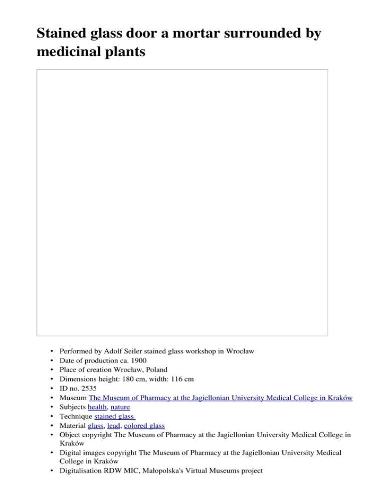 Stained glass door a mortar surrounded by medicinal plants