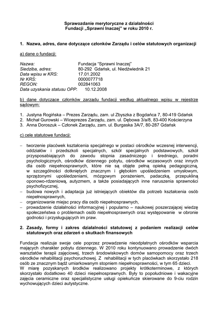Sprawozdanie merytoryczne z działalności Fundacji „Sprawni Inaczej” w roku 2010 r. 1. Nazwa, adres, dane dotyczące członków Zarządu i celów statutowych organizacji a) dane o fundacji: Nazwa: Fundacja “Sprawni Inaczej” Siedziba, adres: 80-292 Gdańsk, ul. Niedźwiednik 21 Data wpisu w KRS: 17.01.2002 Nr KRS: 0000077718 REGON: 002841063 Data uzyskania statusu OPP: 10.12.2008 b) dane dotyczące członków zarządu fundacji według aktualnego wpisu w rejestrze sądowym: 1. Justyna Rogińska – Prezes Zarządu, zam. ul Zbyszka z Bogdańca 7, 80-419 Gdańsk 2. Michał Gurowski – Wiceprezes Zarządu, zam. ul. Dębowa 3/a/8, 83-400 Kościerzyna 3. Anna Doroszuk – Członek Zarządu, zam. ul. Burgaska 3A/7, 80-287 Gdańsk c) cele statutowe fundacji: − tworzenie placówek kształcenia specjalnego w postaci ośrodków wczesnej interwencji, oddziałów i przedszkoli specjalnych, szkół specjalnych podstawowych, szkół przysposabiających do zawodu stopnia zasadniczego i średniego, poradni psychologicznych, ośrodków dziennego pobytu, ośrodków wczasowych oraz innych dla osób niepełnosprawnych, które nie są objęte pełną opieką pedagogiczną, w szczególności dotkniętych znacznym i głębokim upośledzeniem umysłowym, sprzężonymi upośledzeniami, mózgowym porażeniem, padaczką, przepukliną oponowo-rdzeniową, autyzmem, a także posiadających inne naruszenia sprawności psychofizycznej, − budowa nowych i adaptacja już istniejących obiektów dla potrzeb kształcenia osób niepełnosprawnych, − organizowanie miejsc pracy dla osób niepełnosprawnych, − prowadzenie działalności informacyjnej i popularno – naukowej poszerzającej wiedzę społeczeństwa o problemach osób niepełnosprawnych oraz występowanie w obronie godności i przysługujących im praw. 2. Zasady, formy i zakres działalności statutowej z podaniem realizacji celów statutowych oraz zdarzeń o skutkach finansowych Fundacja realizuje swoje cele poprzez prowadzenie nieodpłatnych ośrodków wsparcia mających charakter pobytu dziennego. W 2010 roku kontynuowano prowadzenie dwóch warsztatów terapii zajęciowej, trzech środowiskowych domów samopomocy oraz trzech ośrodków rehabilitacji psychoruchowej. Z rehabilitacji w tych placówkach skorzystało 218 osób ze znacznym bądź umiarkowanym stopniem niepełnosprawności, w tym 65 dzieci. W miarę pozyskanych środków realizowano projekty krótkoterminowe, z których skorzystało dodatkowo 40 dzieci niepełnosprawnych. Były to popołudniowe i wakacyjne zajęcia ceramiczne oraz specjalistyczne usługi opiekuńcze skierowane do 9-ciu rodzin wychowujących dzieci autystyczne. Wszystkie placówki prowadzone przez Fundację „Sprawni Inaczej” realizowały dodatkowe zadania, których celem było przełamywanie barier społecznych wobec niepełnosprawności, poprzez integrację z lokalną społecznością. Pod koniec 2010 roku utworzono czwarty Środowiskowy Dom Samopomocy w miejscowości Wiele, gmina Karsin, powiat kościerski. WARSZTAT TERAPII ZAJĘCIOWEJ W GDAŃSKU działający w dwóch miejscach: 1) 80-292 Gdańsk, ul. Niedźwiednik 21 - 26 miejsc 2) 80-286 Gdańsk, ul. Zofii Nałkowskiej 6C/1 - 16 miejsc prowadził zajęcia w następujących Pracowniach Terapeutycznych: CeramicznoPlastycznej, Papieru Czerpanego, Gospodarstwa Domowego i Technik Różnych. Trzy grupy terapeutyczne korzystały z zajęć w Pracowni Ceramiczno-Plastycznej przy ul. Niedźwiednik 21. Odbywały się one w oparciu o techniki ręcznego wylepiania z gliny. Uczestnicy wykonywali przedmioty począwszy od projektu do gotowego wyrobu. Uczyli się przy tym organizacji stanowiska pracy, współdziałania z zespołem, systematyczności i utrzymywania porządku. Praca w tej Pracowni stworzyła wiele okazji do uspołecznienia i integracji poprzez udział w wystawach, urządzanie dni otwartych, a także pokazy rzemiosła ceramicznego dla zorganizowanych grup. Do największych osiągnięć należy przygotowana we współpracy z Centralnym Muzeum Morskim wystawa prac i plastycznych, którą można było oglądać od października 2010 r. w siedzibie CMM w Gdańsku oraz Oddziałach Muzeum w Helu i Tczewie. Uczestnicy Pracowni Papieru Czerpanego zajmowali się wytwarzaniem papieru z makulatury oraz dalszą jego obróbką polegającą na wykonywaniu różnorodnej galanterii papierniczej – pocztówek, dyplomów, papeterii itp. Dodatkowo uczestnicy opanowali takie czynności, jak laminowanie i bindowanie. Do osiągnięć tej Pracowni zaliczyć należy wykonanie ręczne pocztówek świątecznych dla Prezydenta Miasta Gdańska. W indywidualnych planach terapii uwzględniono również udział w pokazach techniki czerpania papieru dla zorganizowanych grup, głównie uczniów szkół podstawowych. Omawiana Pracownia oraz dwie pozostałe: Gospodarstwa Domowego i Technik Różnych działały przy ul. Nałkowskiej 6C. W oparciu o programy dostosowane do możliwości psychofizycznych uczestników realizowano systematycznie zadania związane z przygotowaniem do pracy. W roku sprawozdawczym 11 osób odbyło praktyki zawodowe, głównie na terenie obiektów Fundacji oraz w innych ośrodkach i urzędach w Gdańsku. Pięciu uczestników korzystało z usług Biura Integracji Zawodowej Osób Niepełnosprawnych. Jedna osoba podjęła pracę. Uczestnicy warsztatu mieli okazję skorzystać z wycieczek krajoznawczych, wyjść do muzeów i bibliotek oraz aktywnie uczestniczyć w różnorodnych imprezach kulturalnooświatowych. Systematycznie uczestniczyli w zajęciach na sali gimnastycznej oraz korzystali z hipoterapii. W 2010 roku kontynuował pracę zespół muzyki improwizowanej „A może…”, który wykonał kilka koncertów, m.in. podczas imprezy „Piknik pod Kasztanami” oraz w Centralnym Muzeum Morskim. WARSZTAT TERAPII ZAJĘCIOWEJ W Kościerzynie 83-400 Kościerzyna ul. Słoneczna 1 – 20 miejsc. W warsztacie działały cztery pracownie główne z pełnym wyposażeniem, w który