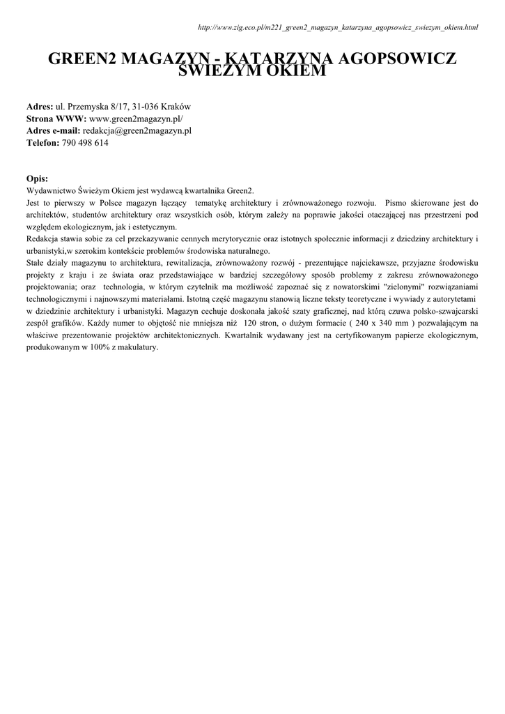 http://www.zig.eco.pl/m221_green2_magazyn_katarzyna_agopsowicz_swiezym_okiem.html GREEN2 MAGAZYN - KATARZYNA AGOPSOWICZ ŚWIEŻYM OKIEM Adres: ul. Przemyska 8/17, 31-036 Kraków Strona WWW: www.green2magazyn.pl/ Adres e-mail: [email protected] Telefon: 790 498 614 Opis: Wydawnictwo Świeżym Okiem jest wydawcą kwartalnika Green2. Jest to pierwszy w Polsce magazyn łączący tematykę architektury i zrównoważonego rozwoju. Pismo skierowane jest do architektów, studentów architektury oraz wszystkich osób, którym zależy na poprawie jakości otaczającej nas przestrzeni pod względem ekologicznym, jak i estetycznym. Redakcja stawia sobie za cel przekazywanie cennych merytorycznie oraz istotnych społecznie informacji z dziedziny architektury i urbanistyki,w szerokim kontekście problemów środowiska naturalnego. Stałe działy magazynu to architektura, rewitalizacja, zrównoważony rozwój - prezentujące najciekawsze, przyjazne środowisku projekty z kraju i ze świata oraz przedstawiające w bardziej szczegółowy sposób problemy z zakresu zrównoważonego projektowania; oraz technologia, w którym czytelnik ma możliwość zapoznać się z nowatorskimi "zielonymi" rozwiązaniami technologicznymi i najnowszymi materiałami. Istotną część magazynu stanowią liczne teksty teoretyczne i wywiady z autorytetami w dziedzinie architektury i urbanistyki. Magazyn cechuje doskonała jakość szaty graficznej, nad którą czuwa polsko-szwajcarski zespół grafików. Każdy numer to objętość nie mniejsza niż 120 stron, o dużym formacie ( 240 x 340 mm ) pozwalającym na właściwe prezentowanie projektów architektonicznych. Kwartalnik wydawany jest na certyfikowanym papierze ekologicznym, produkowanym w 100% z makulatury.