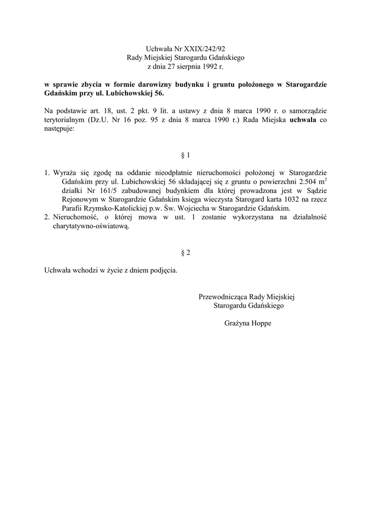 Uchwała Nr XXIX/242/92 Rady Miejskiej Starogardu Gdańskiego z dnia 27 sierpnia 1992 r. w sprawie zbycia w formie darowizny budynku i gruntu położonego w Starogardzie Gdańskim przy ul. Lubichowskiej 56. Na podstawie art. 18, ust. 2 pkt. 9 lit. a ustawy z dnia 8 marca 1990 r. o samorządzie terytorialnym (Dz.U. Nr 16 poz. 95 z dnia 8 marca 1990 r.) Rada Miejska uchwala co następuje: §1 1. Wyraża się zgodę na oddanie nieodpłatnie nieruchomości położonej w Starogardzie Gdańskim przy ul. Lubichowskiej 56 składającej się z gruntu o powierzchni 2.504 m2 działki Nr 161/5 zabudowanej budynkiem dla której prowadzona jest w Sądzie Rejonowym w Starogardzie Gdańskim księga wieczysta Starogard karta 1032 na rzecz Parafii Rzymsko-Katolickiej p.w. Św. Wojciecha w Starogardzie Gdańskim. 2. Nieruchomość, o której mowa w ust. 1 zostanie wykorzystana na działalność charytatywno-oświatową. §2 Uchwała wchodzi w życie z dniem podjęcia. Przewodnicząca Rady Miejskiej Starogardu Gdańskiego Grażyna Hoppe Uzasadnienie: Przanowski Stefan właściciel dóbr Nowa Wieś przekazał (darował) dla Stowarzyszenia Młodzieży Żeńskiej w Starogardzie prawo bezpłatnego użytkowania tej nieruchomości to jest parceli i budynków na rzecz Katolickiego Stowarzyszenia Młodzieży Żeńskiej w Pelplinie Oddział w Starogardzie. W razie powstania w przyszłości Oddziałów Katolickiego Stowarzyszenia Młodzieży Żeńskiej to i tym Oddziałom ma przysługiwać prawo bezpłatnego współużytkowania parcel i budynków na tych parcelach stojących. W okresie powojennym budynek był użytkowany przez różne instytucje świeckie między innymi Administrację Gromadzkiej Rady Narodowej Rokocin, a w okresie późniejszym przedszkole. w roku 1972 Ksiądz Proboszcz Jan Kahl działając w imieniu parafii RzymskoKatolickiej Kościoła pod wezwaniem św. Wojciecha podarował przedmiotową nieruchomość na rzecz Skarbu Państwa. W 1990 r. nieruchomość ta była wykorzystywana na cele przedszkola, dlatego też z mocy prawa stałą się własnością Gminy Miejskiej w Starogardzie Gd., a fakt ten potwierdzony został decyzją Wojewody Gdańskiego. W chwili obecnej filia przedszkola nr 5 przestała korzystać z obiektu dlatego też nieruchomość tą wraz z zabudowaniem można wykorzystać do pierwotnego celu tj. podjęcia działalności na rzecz młodzieży Katolickiej. Wniosek o ponowne przejęcie nieruchomości złożył Proboszcz parafii św. Wojciecha, który zamierza przeznaczyć w/g wniosku odzyskaną własność na cele parafialne - organistówka, ewentualnie społeczne - punkt spotkań wzgl. bibliotekę dla młodzieży. Dotychczasowy obrót przedmiotową nieruchomością odbył się na zasadach darowizn, przeprowadzona była działalność społecznie użyteczna. Starogard, dnia 25 sierpnia 1992 Parafia Rzymsko Katolicka p.w. św. Wojciecha Starogard Gd. Pan Prezydent Miasta Starogardu Gd. W nawiązaniu do wniosku Parafii Rzymsko Katolickiej p.w. św. Wojciecha w Starogardzie Gd. z dnia 1 sierpnia 1992 r. o zwrot nieruchomości o powierzchni 0.44.19 ha, stanowiącej zabudowaną budynkiem (dawny Dom Młodej Polki) działkę nr 161/5 położoną przy ul. Lubichowskiej, jako Proboszcz tejże Parafii ponownie proszę o zwrot tej nieruchomości. Parafia nigdy nie zrzekała się i dobrowolnie nie przekazała na rzecz Skarbu Państwa tej nieruchomości. Przedmiotowa nieruchomość przeszła na rzecz Skarbu Państwa w następstwie prowadzonej przez władze PRL - zwłaszcza do roku 1980 - działalności zmierzającej do ograniczenia a następnie likwidacji działalności kościoła. Jednym ze środków zmierzających do tego celu była polityka podatkowa, fiskalna i budowlana prowadzona wobec Kościoła. Wymierzano bezpodstawne podatki, którym parafie nie mogły podołać, zabraniano prowadzenia działalności inwestycyjnej a wszelkie nieprawidłowości w tym względzie jak również nawet błahe uchybienia sanitarnoporządkowe pociągały za sobą surowe sankcje fiskalne. W takich właśnie warunkach i z tych przyczyn, została przekazana na rzecz Skarbu Państwa w roku 1971 nieruchomość parafialna położona przy ulicy Lubichowskiej. Nie można mówić o dobrowolnym przekazaniu przedmiotowej nieruchomości na rzecz Skarbu Państwa skoro z wszystkich związanych z tym dokumentów wynika, że przekazanie to nastąpiło „za podatki”. Parafia nieruchomość tę przekazała „dobrowolnie”, ale została do tego „zmuszona” działalnością fiskalną Państwa. Czy można w tej sytuacji mówić o dobrowolnym przekazaniu?? Ustawa z dnia 17 maja 1989 r. o stosunku Państwa do Kościoła Katolickiego w RP. naprawiła tę niesprawiedliwość. Z treści art. 61 ust. 1 pkt. 5 tej ustawy wynika, że Kościołowi należy zwrócić między innymi mienie „przejęte po 1948 r. w trybie egzekucji zaległości podatkowych”. Nieruchomość przy ulicy Lubichowskiej została przekazana Państwu za zaległości podatkowe i inne kary finansowe i dlatego zgodnie z powołanym wyżej przepisem winna zostać zwrócona Parafii p.w. św. Wojciecha w Starogardzie. Decyzję w tej mierze władny jest podjąć - zgodnie ze stanowiskiem wyrażonym przez Urząd Wojewódzki, Wydział Spraw Obywatelskich w Gdańsku - terenowy Organ Władzy Państwowej jakim jest Prezydent Miasta Starogard Gd. Gdyby nawet zaszła wątpliwość w interpretacji okoliczności w jakich doszło do przejęcia na rzecz Skarbu Państwa przedmiotowej nieruchomości to zwykłe poczucie sprawiedliwości przemawia za zwrotem działki Parafii. Rada jest władna podjąć uchwałę przekazania na rzecz Parafii każdej nieruchomości bez odpłatności a zwłaszcza takiej nieruchomości, która stanowi własność komunalną a w przeszłości została przejęta na rzecz Skarbu za podatki. Som Młodej Polki w przeszłości i od początku istnienia służył Stowarzyszeniom Młodzieżowym i obecnie będzie służył nadal tym samym celom. Proboszcz Parafii