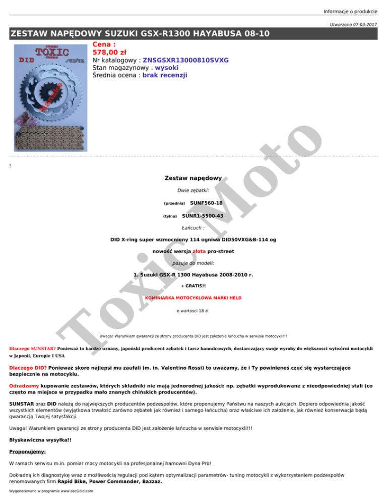 Informacje o produkcie Utworzono 07-03-2017 ZESTAW NAPĘDOWY SUZUKI GSX-R1300 HAYABUSA 08-10 Cena : 578,00 zł ! ot o Nr katalogowy : ZNSGSXR13000810SVXG Stan magazynowy : wysoki Średnia ocena : brak recenzji Zestaw napędowy Dwie zębatki: SUNF560-18 M (przednia) SUNR1-5500-43 (tylna) Łańcuch : DID X-ring super wzmocniony 114 ogniwa DID50VXG&B-114 og c nowość wersja złota pro-street pasuje do modeli: xi 1. Suzuki GSX-R 1300 Hayabusa 2008-2010 r. + GRATIS!! To KOMINIARKA MOTOCYKLOWA MARKI HELD o wartosci 18 zł Uwaga! Warunkiem gwarancji ze strony producenta DID jest założenie łańcucha w serwisie motocykli!!! Dlaczego SUNSTAR? Ponieważ to bardzo uznany, japoński producent zębatek i tarcz hamulcowych, dostarczający swoje wyroby do większosci wytwórni motocykli w Japonii, Europie I USA Dlaczego DID? Ponieważ skoro najlepsi mu zaufali (m. in. Valentino Rossi) to uważamy, że i Ty powinieneś czuć się wystarczająco bezpiecznie na motocyklu. Odradzamy kupowanie zestawów, których składniki nie mają jednorodnej jakości: np. zębatki wyprodukowane z nieodpowiedniej stali (co często ma miejsce w przypadku mało znanych chińskich producentów). SUNSTAR oraz DID należą do największych producentów podzespołów, które proponujemy Państwu na naszych aukcjach. Dopiero odpowiednia jakość wszystkich elementów (wyjątkowa trwałość zarówno zębatek jak również i samego łańcucha) oraz właściwe ich założenie, jak również konserwacja będą gwarancją Twojej satysfakcji. Uwaga! Warunkiem gwarancji ze strony producenta DID jest założenie łańcucha w serwisie motocykli!!! Błyskawiczna wysyłka!! Proponujemy: W ramach serwisu m.in. pomiar mocy motocykli na profesjonalnej hamowni Dyna Pro! Dokładną ich diagnostykę wraz z możliwością regulacji pod kątem optymalizacji parametrów- tuning motocykli z wykorzystaniem podzespołów renomowanych firm Rapid Bike, Power Commander, Bazzaz. Wygenerowano w programie www.oscGold.com To xi c M ot o Jako jedyni w polsce świadczymy usługi chip tuningu oferowane w ramach osiągnięć amerykańskiej firmy ECUnleashed.