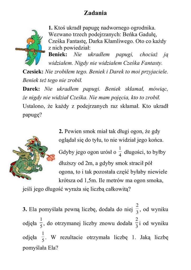 Zadania 1. Ktoś ukradł papugę nadwornego ogrodnika. Wezwano trzech podejrzanych: Beńka Gadułę, Cześka Fantastę, Darka Kłamliwego. Oto co każdy z nich powiedział: Beniek: Nie ukradłem papugi, chociaż ją widziałem. Nigdy nie widziałem Cześka Fantasty. Czesiek: Nie zrobiłem tego. Beniek i Darek to moi przyjaciele. Beniek też tego nie zrobił. Darek: Nie ukradłem papugi. Beniek skłamał, mówiąc, że nigdy nie widział Cześka. Nie mam pojęcia, kto to zrobił. Ustalono, że każdy z podejrzanych raz skłamał. Kto ukradł papugę? 2. Pewien smok miał tak długi ogon, że gdy oglądał się do tyłu, to nie widział jego końca. 1 Gdyby jego ogon urósł o 4 długości, to byłby dłuższy od 2m, a gdyby smok stracił pół ogona, to i tak pozostała część byłaby niewiele krótsza od 1,5m. Ile metrów ma ogon smoka, jeśli jego długość wyraża się liczbą całkowitą? 2 3. Ela pomyślała pewną liczbę, dodała do niej 3 , od wyniku 1 2 odjęła 5 , do otrzymanej liczby znowu dodała 3 i od wyniku 1 odjęła 5 . W rezultacie otrzymała liczbę 1. Jaką liczbę pomyślała Ela?