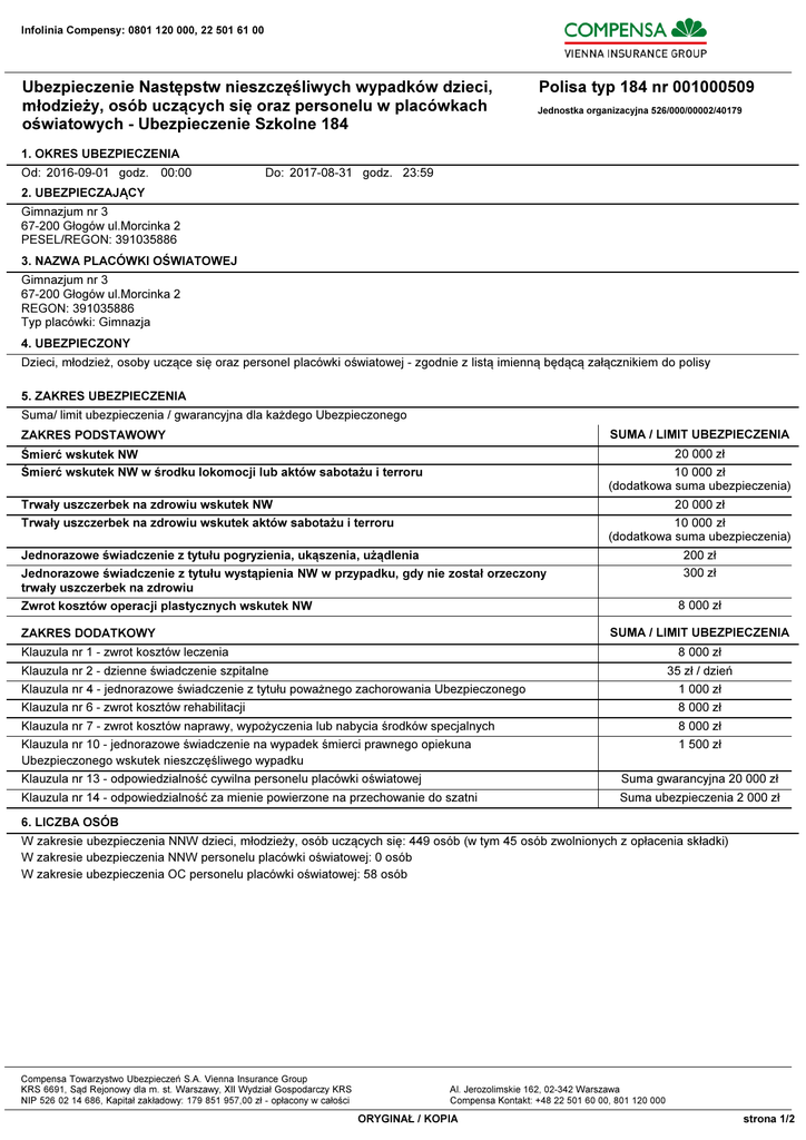 Infolinia Compensy: 0801 120 000, 22 501 61 00 Ubezpieczenie Następstw nieszczęśliwych wypadków dzieci, młodzieży, osób uczących się oraz personelu w placówkach oświatowych - Ubezpieczenie Szkolne 184 1. OKRES UBEZPIECZENIA Od: 2016-09-01 godz. 00:00 2. UBEZPIECZAJĄCY Polisa typ 184 nr 001000509 Jednostka organizacyjna 526/000/00002/40179 Do: 2017-08-31 godz. 23:59 Gimnazjum nr 3 67-200 Głogów ul.Morcinka 2 PESEL/REGON: 391035886 3. NAZWA PLACÓWKI OŚWIATOWEJ Gimnazjum nr 3 67-200 Głogów ul.Morcinka 2 REGON: 391035886 Typ placówki: Gimnazja 4. UBEZPIECZONY Dzieci, młodzież, osoby uczące się oraz personel placówki oświatowej - zgodnie z listą imienną będącą załącznikiem do polisy 5. ZAKRES UBEZPIECZENIA Suma/ limit ubezpieczenia / gwarancyjna dla każdego Ubezpieczonego SUMA / LIMIT UBEZPIECZENIA ZAKRES PODSTAWOWY Śmierć wskutek NW Śmierć wskutek NW w środku lokomocji lub aktów sabotażu i terroru 20 000 zł 10 000 zł (dodatkowa suma ubezpieczenia) Trwały uszczerbek na zdrowiu wskutek NW Trwały uszczerbek na zdrowiu wskutek aktów sabotażu i terroru Jednorazowe świadczenie z tytułu pogryzienia, ukąszenia, użądlenia Jednorazowe świadczenie z tytułu wystąpienia NW w przypadku, gdy nie został orzeczony trwały uszczerbek na zdrowiu Zwrot kosztów operacji plastycznych wskutek NW 20 000 zł 10 000 zł (dodatkowa suma ubezpieczenia) 200 zł 300 zł 8 000 zł SUMA / LIMIT UBEZPIECZENIA ZAKRES DODATKOWY Klauzula nr 1 - zwrot kosztów leczenia 8 000 zł Klauzula nr 2 - dzienne świadczenie szpitalne 35 zł / dzień Klauzula nr 4 - jednorazowe świadczenie z tytułu poważnego zachorowania Ubezpieczonego 1 000 zł Klauzula nr 6 - zwrot kosztów rehabilitacji 8 000 zł Klauzula nr 10 - jednorazowe świadczenie na wypadek śmierci prawnego opiekuna Ubezpieczonego wskutek nieszczęśliwego wypadku 1 500 zł Klauzula nr 7 - zwrot kosztów naprawy, wypożyczenia lub nabycia środków specjalnych Klauzula nr 13 - odpowiedzialność cywilna personelu placówki oświatowej Klauzula nr 14 - odpowiedzialność za mienie powierzone na przechowanie do szatni 6. LICZBA OSÓB 8 000 zł Suma gwarancyjna 20 000 zł Suma ubezpieczenia 2 000 zł W zakresie ubezpieczenia NNW dzieci, młodzieży, osób uczących się: 449 osób (w tym 45 osób zwolnionych z opłacenia składki) W zakresie ubezpieczenia NNW personelu placówki oświatowej: 0 osób W zakresie ubezpieczenia OC personelu placówki oświatowej: 58 osób Compensa Towarzystwo Ubezpieczeń S.A. Vienna Insurance Group KRS 6691, Sąd Rejonowy dla m. st. Warszawy, XII Wydział Gospodarczy KRS NIP 526 02 14 686, Kapitał zakładowy: 179 851 957,00 zł - opłacony w całości Al. Jerozolimskie 162, 02-342 Warszawa Compensa Kontakt: +48 22 501 60 00, 801 120 000 ORYGINAŁ / KOPIA strona 1/2 Infolinia Compensy: 0801 120 000, 22 501 61 00 7. SKŁADKA Składka płatna: gotówką przelewem do dnia 2016-10-31 Składka z ubezpieczenia NNW za 1 osobę: 45 zł Składka za Klauzulę 13 za 1 osobę: bezskładkowo Składka za klauzulę 14 : 200 zł za wszystkie osoby: 18 180 zł za 58 osób: bezskładkowo Składka łączna z polisy: 18 380 zł Nr konta Compensa TU S.A. Vienna Insurance Group: 79 1240 6957 7008 8800 1000 5096 8. POSTANOWIENIA DODATKOWE 9. OŚWIADCZENIA 1. Oświadczam, iż przed podpisaniem polisy otrzymałem(am) Ogólne Warunki Ubezpieczenia Następstw nieszczęśliwych wypadków dzieci, młodzieży, osób uczących się oraz personelu w placówkach oświatowych – Ubezpieczenie Szkolne 184 zatwierdzone Uchwałą Zarządu Compensa Towarzystwo Ubezpieczeń S.A. Vienna Insurance Group nr 8/04/2016 z dnia 11 kwietnia 2016 roku i mających zastosowanie do umów zawieranych od dnia 18 kwietnia 2016 roku. Oświadczam, że zapoznałem(am) się i akceptuję treść ww. Ogólnych Warunków Ubezpieczenia Następstw nieszczęśliwych wypadków dzieci, młodzieży, osób uczących się oraz personelu w placówkach oświatowych – Ubezpieczenie Szkolne 184 oraz, że zapoznałem(am) się z treścią pełnomocnictwa Przedstawiciela Compensy. Ponadto oświadczam, że wszystkie informacje podane przez mnie w polisie o ubezpieczenie są prawdziwe, kompletne i zostały przekazane Compensa Towarzystwo Ubezpieczeń S.A. Vienna Insurance Group w dobrej wierze zgodnie z posiadaną przeze mnie wiedzą i stanowią podstawę do zawarcia umowy ubezpieczenia. 2. Zobowiązuję się do zapoznania Ubezpieczonych z treścią ww. Ogólnych Warunków Ubezpieczenia Następstw nieszczęśliwych wypadków dzieci, młodzieży, osób uczących się oraz personelu w placówkach oświatowych – Ubezpieczenie Szkolne 184 3. Jeżeli umowa ubezpieczenia jest zawarta na okres dłuższy niż 6 miesięcy, Ubezpieczający ma prawo odstąpienia od umowy ubezpieczenia w terminie 30 dni, a w przypadku gdy Ubezpieczający jest przedsiębiorcą - w terminie 7 dni od dnia zawarcia umowy. Jeżeli najpóźniej w chwili zawarcia umowy ubezpieczyciel nie poinformował ubezpieczającego będącego konsumentem o prawie odstąpienia od umowy, termin 30 dni biegnie od dnia, w którym ubezpieczający będący konsumentem dowiedział się o tym prawie. . . . . . . . . . . . . . . . dn, . . . . . . . . . . ------------------------------------------------------Pieczęć i podpis przedstawiciela Compensy --------------------------------------------Podpis Ubezpieczającego OŚWIADCZENIE WOLI W SPRAWIE ZGODY NA PRZETWARZANIE DANYCH OSOBOWYCH W CELACH MARKETINGOWYCH Udzielona zgoda będzie ważna aż do wyraźnego odwołania. Przysługuje Pani/Panu prawo do odwołania w każdym czasie każdej z poniższych zgód poprzez skierowanie oświadczenia: na adres e-mail: [email protected] lub za pośrednictwem telefonu po numerem: +48 22 501 61 00 lub pisemnie na adres korespondencyjny: Compensa Towarzystwo Ubezpieczeń S.A. Vienna Insurance Group, Al. Jerozolimskie 162, 02- 342 Warszawa (Compensa) 1) Zgoda na świadczenie usług drogą elektroniczną w celach marketingowych Zgodnie 
