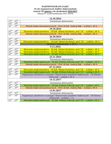 HARMONOGRAM ZAJĘĆ II rok stacjonarnych studiów doktoranckich semestr III zimowy rok akademicki 2016/2017 Edycja IV (cykl kształcenia 2015-2019) 12.10.2016 45 30 15 – 16 1630 – 1800 1815 – 1945 Metody badań ekonometrycznych – Prof. dr hab. Andrzej Bąk – wykład s. 60 A 1630 – 1800 1815 – 1945 Ekonomia międzynarodowa – Dr hab. Marian Kachniarz, prof. UE – wykład s. 60 A Metody badań ekonometrycznych – Prof. dr hab. Andrzej Bąk – wykład s. 60 A Seminarium doktoranckie 19.10.2016 26.10.2016 45 30 45 30 15 – 16 1630 – 1800 1815 – 1945 Seminarium doktoranckie Ekonomia międzynarodowa – Dr hab. Marian Kachniarz, prof. UE – wykład s. 60 A Spotkanie organizacyjne s. 60 A 9.11.2016 15 – 16 1630 – 1800 1815 – 1945 Ekonomia międzynarodowa – Dr hab. Marian Kachniarz, prof. UE – wykład s. 60 A Ekonomia międzynarodowa – Dr hab. Marian Kachniarz, prof. UE – wykład s. 60 A Metodyka badań naukowych – Dr hab. Elżbieta Sobczak, prof. UE – wykład s. 60 A 23.11.2016 1545 – 1630 1630 – 1800 1815 – 1945 Seminarium doktoranckie Metodyka badań naukowych – Dr hab. Elżbieta Sobczak, prof. UE – wykład s. 60 A Metody badań ekonometrycznych – Prof. dr hab. Andrzej Bąk – wykład s. 60 A 1545 – 1630 1630 – 1800 1815 – 1945 Ekonomia międzynarodowa – Dr hab. Marian Kachniarz, prof. UE – wykład s. 60 A Metodyka badań naukowych – Dr hab. Elżbieta Sobczak, prof. UE – wykład s. 60 A Organizacja szkolnictwa wyższego i finansowanie projektów badawczych – Dr Dariusz Głuszczuk – wykład s. 60 A 07.12.2016 14.12.2017 45 30 45 30 15 – 16 1630 – 1800 1815 – 1945 Seminarium doktoranckie Metodyka badań naukowych – Dr hab. Elżbieta Sobczak, prof. UE – wykład s. 60 A Metody badań ekonometrycznych – Prof. dr hab. Andrzej Bąk – wykład s. 60 A 11.01.2017 15 – 16 1630 – 1800 1815 – 1945 Seminarium doktoranckie Organizacja szkolnictwa wyższego i finansowanie projektów badawczych – Dr Dariusz Głuszczuk – wykład s. 1 A Metodyka badań naukowych – Dr hab. Elżbieta Sobczak, prof. UE – wykład s. 60 A Program studiów – III semestr w roku akademickim 2016/2017: Liczba godzin Forma w semestrze Lp. Przedmiot zal. w. ćw. lab. 1 Moduł Ekonomia: Ekonomia międzynarodowa zal. 2 Metodyka badań naukowych 3 4 5 Moduł Metodyka i organizacja badań empirycznych: Metody badań ekonometrycznych Organizacja szkolnictwa wyższego i finansowanie projektów badawczych Seminarium doktoranckie Prowadzący 8 – – Dr hab. Marian Kachniarz, prof. UE zal. 10 – – Dr hab. Elżbieta Sobczak, prof. UE zal. 8 – – Prof. dr hab. Andrzej Bąk zal. – 4 – Dr Dariusz Głuszczuk zal. – 5 – 26 9 – Razem Doktorant zobligowany jest do zaliczenia minimum 10 godzin praktyki zawodowej (dydaktycznej) w roku akademickim – prowadzenie bądź uczestniczenie w prowadzeniu zajęć dydaktycznych. Doktorant zobligowany jest do uczestniczenia w pracach lub zebraniach Katedry opiekuna naukowego przynajmniej 1 raz w roku akademickim. Dyżur Kierownika studiów doktoranckich: 19 października 2016 r. – od 15.00 do 16.00 26 października 2016 r. – od 17.00 do 18.00 9 listopada 2016 r. – od 16.00 do 18.00 14 listopada 2016 r. – od 16.00 do 18.00 7 grudnia 2016 r. – od 17.00 do 18.00 18 stycznia 2017 r. – od 15.00 do 16.00