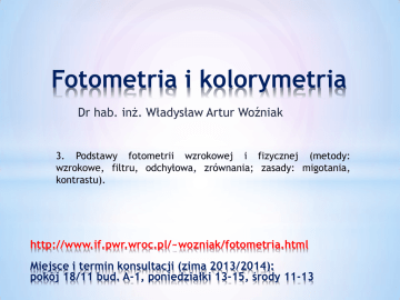Fotometria i kolorymetria Dr hab. inż. Władysław Artur Woźniak 3. Podstawy fotometrii wzrokowej i fizycznej (metody: wzrokowe, filtru, odchyłowa, zrównania; zasady: migotania, kontrastu). http://www.if.pwr.wroc.pl/~wozniak/fotometria.html Miejsce i termin konsultacji (zima 2013/2014): pokój 18/11 bud. A-1, poniedziałki 13-15, środy 11-13 Fotometria i kolorymetria Dr hab. inż. Władysław Artur Woźniak Podstawy fotometrii wzrokowej i fizycznej Zależnie od tego, czy światło ocenia się za pomocą oka czy odbiornika fizycznego, rozróżniamy: - Fotometrię wzrokową (subiektywną); - Fotometrię fizyczną (obiektywną). Zasadniczo można wykorzystywać zależność między wielkością mierzoną obiektywnie Xe a odpowiadająca jej wielkością subiektywną X – poprzez użycie względnej skuteczności świetlnej promieniowania monochromatycznego V(): X K m X eV d Taką „metodę widmową” można by w zasadzie stosować we wszystkich pomiarach… ALE? Fotometria i kolorymetria Dr hab. inż. Władysław Artur Woźniak Metody wzrokowe Wszystkie wzrokowe pomiary techniki świetlnej polegają na zrównaniu dwu luminancji ocenianych okiem. Czemu luminancja? Wielkością, która decyduje o odbieranym wrażeniu bodźca (w naszym oku + mózgu) jest wszak natężenie oświetlenia E elementów siatkówki (czopków i pręcików). W wielu przypadkach stosuje się oświetlenia zależność uproszczoną: do obliczenia natężenia E S dokładną tylko przy równomiernym oświetleniu powierzchni. Fotometria i kolorymetria Dr hab. inż. Władysław Artur Woźniak Metody wzrokowe W praktyce mówi się często o oświetleniu w jednym punkcie powierzchni – gdy powierzchnia ta (detektora) jest dowolnie mała względem rozmiaru źródła i może być przyjęta jako punkt. W licznych przypadkach konieczne jest obliczanie natężenia oświetlenia wytworzonego przez źródło o kołowym kształcie powierzchni. Jeśli założymy, ze źródło takie jest promiennikiem lambertowskim to możemy obliczyć natężenie oświetlenia jako: E L cos O dO L sin 2 1 choć tak naprawdę kształt źródła nie ma znaczenia… Fotometria i kolorymetria Dr hab. inż. Władysław Artur Woźniak Metody wzrokowe Dla źródeł nielambertowskich i niekołowych ale za to punktowych – można z kolei stosować fotometryczne prawo odległości. Jeśli przyjąć, że można je zastosować dla źródeł o powierzchni skończonej S, to: I S E 2 L 2 LO r r O jest kątem bryłowym, w którym źródło światła widać z oświetlonego elementu powierzchni a L jest luminancją źródła. Jeśli do tego dodać twierdzenie Abbego… Luminancja = właściwa miara wrażenia jaskrawości (jasności) źródła. Fotometria i kolorymetria Dr hab. inż. Władysław Artur Woźniak Metody wzrokowe Wracamy do naszej bajki… Wszystkie wzrokowe pomiary techniki świetlnej polegają na zrównaniu dwu luminancji ocenianych okiem. To zrównanie można osiągnąć dwiema metodami: - bezpośrednią; - przy użyciu filtru. Metody te można z kolei stosować wykorzystując różne zasady zrównania: - równowagi; - kontrastu; - migotania. Fotometria i kolorymetria Dr hab. inż. Władysław Artur Woźniak Metody wzrokowe Metoda porównania bezpośredniego: Jeśli oba porównywane promieniowania, działające na oko, są izochromatyczne, nastawienie na równe luminancje jest stosunkowo łatwe. Jeśli oba porównywane promieniowania mają różny skład widmowy a tylko taką samą chromatyczność (metameryzm!), porównywanie może być utrudnione i zależne od obserwatora. Jeśli porównywane promieniowania są heterochromatyczne, używamy zasad kontrastu a następnie migotania. Fotometria i kolorymetria Dr hab. inż. Władysław Artur Woźniak Metody wzrokowe Metoda filtru: W metodzie tej dąży się do tego, aby usunąć lub zminimalizować różnicę chromatyczności dwu porównywanych świateł przez zastosowanie filtrów barwnych umieszczanych przed jednym z nich. Światłość Ik lampy z filtrem wyznacza się ze światłości samej lampy I oraz całkowitego współczynnika przepuszczania filtru F: I K I F Współczynnik F z kolei otrzymuje się z widmowego rozkładu światła tej lampy i widmowego współczynnika filtru: S V d e F 0 S V d e 0 Se jest względnym rozkładem widmowym promieniowania lampy, () widmowym współczynnikiem przepuszczania filtru. Fotometria i kolorymetria Dr hab. inż. Władysław Artur Woźniak Metody wzrokowe Metoda filtru: Filtry powinny być dokładnie płaskorównoległe. Dokładność metody filtru zależy szczególnie od ścisłości dostosowania filtrów i wyznaczenia ich widmowego współczynnika przepuszczania. Osiągane upodobnienie barw jest fizjologiczne (tzw. barwa postrzegana – patrz: kolorymetria) nie fizyczne, zgodne są więc wrażenia barw a nie ich rozkłady widmowe. Może to prowadzić do powstawania błędów pomiarowych – wyniki są różne dla różnych obserwatorów. Wadą metody jest też fakt, że każda mierzona lampa wymaga w zasadzie „swojego” filtru… Fotometria i kolorymetria Dr hab. inż. Władysław Artur Woźniak Zasady zrównywania przy pomiarach wzrokowych Podczas pomiarów wzrokowych, zarówno bezpośrednich jak i przy użyciu filtru, stosuje się pewne zasady, które umożliwiają zrównanie porównywanych świateł – badanego i wzorcowego. Są to: - Zasada równowagi; - Zasada kontrastu; - Zasada migotania. Dwie pierwsze zasady mogą być wyjaśnione na przykładzie działania fotometru Lummera-Brodhuna. Otto Lummer (ur. 17 lipca 1860, Gera - zm. 5 lipca 1925, Wrocław) − niemiecki fizyk, który prowadził badania w dziedzinie optyki. W 1887 roku skonstruował fotometr (tzw. fotometr Lummera-Brodhuna). Był profesorem uniwersytetu we Wrocławiu. Fotometria i kolorymetria Zasada zrównywania przy pomiarach wzrokowych Głowica fotometryczna według Lummera i Brodhuna: (to tylko schemat głowicy, a jak wygląda schemat całego urządzenia?) Kształt wżeru kostki Lumme