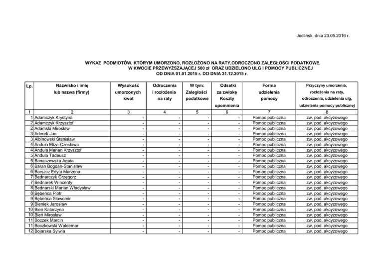 Jedlińsk, dnia 30.05.2011 Jedlińsk, dnia 23.05.2016 r. r. WYKAZ PODMIOTÓW, KTÓRYM UMORZONO, ROZŁOŻONO NA RATY,ODROCZONO ZALEGŁOŚCI PODATKOWE, W KWOCIE PRZEWYŻSZAJĄCEJ 500 zł ORAZ UDZIELONO ULG I POMOCY PUBLICZNEJ OD DNIA 01.01.2015 r. DO DNIA 31.12.2015 r. Lp. Nazwisko i imię Wysokość Odroczenia W tym: Odsetki Forma Przyczyny umorzenia, lub nazwa (firmy) umorzonych kwot i rozłożenia na raty Zaległości podatkowe za zwłokę Koszty udzielenia pomocy odroczenia, udzielenia ulg, upomnienia 1 1 2 2 3 3 4 4 5 5 6 6 7 7 8 8 9 9 10 10 11 11 12 2 Adamczyk Krystyna Adamczyk Krzysztof Adamski Mirosław Aderek Jan Albinowski Stanisław Anduła Eliza-Czesława Anduła Marian Krzysztof Anduła Tadeusz Banaszewska Agata Baran Bogdan-Stanisław Barszcz Edyta Marzena Bednarczyk Grzegorz Bednarek Wincenty Bednarski Marian Władysław Bębeńca Piotr Bębeńca Sławomir Bieniek Jarosław Bień Katarzyna Bień Mirosław Boczek Marcin Boczkowski Waldemar Bojarska Sylwia 3 4 - 5 - 6 - - rozłożenia na raty, udzielenia pomocy publicznej 7 Pomoc publiczna Pomoc publiczna Pomoc publiczna Pomoc publiczna Pomoc publiczna Pomoc publiczna Pomoc publiczna Pomoc publiczna Pomoc publiczna Pomoc publiczna Pomoc publiczna Pomoc publiczna Pomoc publiczna Pomoc publiczna Pomoc publiczna Pomoc publiczna Pomoc publiczna Pomoc publiczna Pomoc publiczna Pomoc publiczna Pomoc publiczna Pomoc publiczna 8 zw. pod. akcyzowego zw. pod. akcyzowego zw. pod. akcyzowego zw. pod. akcyzowego zw. pod. akcyzowego zw. pod. akcyzowego zw. pod. akcyzowego zw. pod. akcyzowego zw. pod. akcyzowego zw. pod. akcyzowego zw. pod. akcyzowego zw. pod. akcyzowego zw. pod. akcyzowego zw. pod. akcyzowego zw. pod. akcyzowego zw. pod. akcyzowego zw. pod. akcyzowego zw. pod. akcyzowego zw. pod. akcyzowego zw. pod. akcyzowego zw. pod. akcyzowego zw. pod. akcyzowego 12 13 13 14 14 15 15 16 16 17 17 18 18 19 19 20 20 21 21 22 22 23 23 24 24 25 25 26 26 27 27 28 28 29 29 30 30 Bolek Janusz Bolek Józef Roman Borkowska Teresa Boruciński Andrzej Broda Edward Feliks Broda Małgorzata Bromińska Irena Budzik Rafał Bukowski Stanisław Burzyński Rafał Bzducha Robert Celi Artur-Mariusz Chęć Jerzy Chmielewski Jacek Chojnacki Eugeniusz Chudzik Józef Chudziński Mieczysław Cichocki Ernest Cierzuch Tomasz Cieślak Cezary Ćwiękała Wioleta Dabiński Krzysztof Stefan Dawidowska Elżbieta Dąbrowski Andrzej Dobrowolski Piotr Dróżdż Marian Durak Ryszard Waldemar Durak Teresa Dyziak Janusz Fajdek Andrzej Figura Krzysztof Robert Fijałkowski Czesław Fijałkowski Józef Jacek Fijałkowski Kazimierz Fijałkowski Maciej Filipiak Ewelina Frączyk Bożena Maria - - - - Pomoc publiczna Pomoc publiczna Pomoc publiczna Pomoc publiczna Pomoc publiczna Pomoc publiczna Pomoc publiczna Pomoc publiczna Pomoc publiczna Pomoc publiczna Pomoc publiczna Pomoc publiczna Pomoc publiczna Pomoc publiczna Pomoc publiczna Pomoc publiczna Pomoc publiczna Pomoc publiczna Pomoc publiczna Pomoc publiczna Pomoc publiczna Pomoc publiczna Pomoc publiczna Pomoc publiczna Pomoc publiczna Pomoc publiczna Pomoc publiczna Pomoc publiczna Pomoc publiczna Pomoc publiczna Pomoc publiczna Pomoc publiczna Pomoc publiczna Pomoc publiczna Pomoc publiczna Pomoc publiczna Pomoc publiczna zw. pod. akcyzowego zw. pod. akcyzowego zw. pod. akcyzowego zw. pod. akcyzowego zw. pod. akcyzowego zw. pod. akcyzowego zw. pod. akcyzowego zw. pod. akcyzowego zw. pod. akcyzowego zw. pod. akcyzowego zw. pod. akcyzowego zw. pod. akcyzowego zw. pod. akcyzowego zw. pod. akcyzowego zw. pod. akcyzowego zw. pod. akcyzowego zw. pod. akcyzowego zw. pod. akcyzowego zw. pod. akcyzowego zw. pod. akcyzowego zw. pod. akcyzowego zw. pod. akcyzowego zw. pod. akcyzowego zw. pod. akcyzowego zw. pod. akcyzowego zw. pod. akcyzowego zw. pod. akcyzowego zw. pod. akcyzowego zw. pod. akcyzowego zw. pod. akcyzowego zw. pod. akcyzowego zw. pod. akcyzowego zw. pod. akcyzowego zw. pod. akcyzowego zw. pod. akcyzowego zw. pod. akcyzowego zw. pod. akcyzowego 31 31 32 32 33 33 34 34 35 35 36 36 37 37 38 38 39 39 40 40 41 41 42 42 43 43 44 44 45 45 46 46 47 47 48 48 49 Gałkowska Jolanta Gierasiński Grzegorz Gizicki Jacek Grzegorz Gniadek Dorota Gniadek Marek Antoni Golus Paweł Gos Tadeusz Kazimierz Górka Anna Górka Krystyna Górka Marek Gruszka Michał Grzesiak Sylwia Gut Bogusław Gutowski Tomasz Hełmińska Teresa Hernik Agnieszka Imiełowski Sławomir Imiołek Monika Imiołek Sławomir Jabłońska Marzanna Jagłowski Jarosław Jakubiak Mariusz Janiec Jan Janus Grzegorz Jarosiński Michał Jarosiński Sebastian Jarosz Janusz-Piotr Jarosz Michał Jarosz Stanisław Jastrzębska Monika Jastrzębski Ryszard Jaworski Jan Leszek Jemiołek Stanisław Jędrasiewicz Piotr Jończyk Marian Jurczak Bogdan Jurczak Czesław Henryk - - - - Pomoc publiczna Pomoc publiczna Pomoc publiczna Pomoc publiczna Pomoc publiczna Pomoc publiczna Pomoc publiczna Pomoc publiczna Pomoc publiczna Pomoc publiczna Pomoc publiczna Pomoc publiczna Pomoc publiczna Pomoc publiczna Pomoc publiczna Pomoc publiczna Pomoc publiczna Pomoc publiczna Pomoc publiczna Pomoc publiczna Pomoc publiczna Pomoc publiczna Pomoc publiczna Pomoc publiczna Pomoc publiczna Pomoc publiczna Pomoc publiczna Pomoc publiczna Pomoc publiczna Pomoc publiczna Pomoc publiczna Pomoc publiczna Pomoc publiczna Pomoc publiczna Pomoc publiczna Pomoc publiczna Pomoc publiczna zw. pod. akcyzowego zw. pod. akcyzowego zw. pod. akcyzowego zw. pod. akcyzowego zw. pod. akcyzowego zw. pod. akcyzowego zw. pod. akcyzowego zw. pod. akcyzowego zw. pod. akcyzowego zw. pod. akcyzowego zw. pod. akcyzowego zw. pod. akcyzowego zw. pod. akcyzowego zw. pod. akcyzowego zw. pod. akcyzowego zw. pod. akcyzowego zw. pod. akcyzowego zw. pod. akcyzowego zw. pod. akcyzowego zw. pod. akcyzowego zw. pod. akcyzowego zw. pod. akcyzowego zw. pod. akcyzowego zw. pod. akcyzowego zw. pod. akcyzowego zw. pod. akcyzowego zw. pod. akcyzowego zw. pod. akcyzowego zw. pod. akcyzowego zw. pod. akcyzowego zw. pod. akcyzowego zw. pod. akcyzo