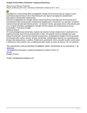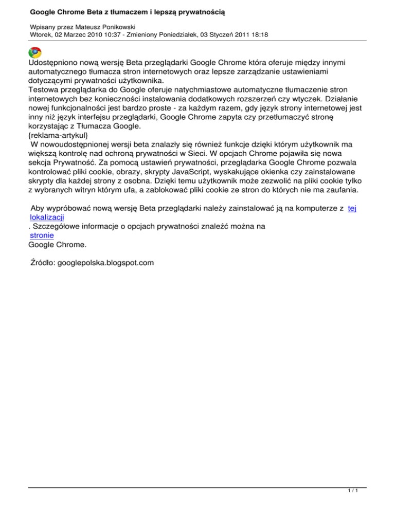 Google Chrome Beta z tłumaczem i lepszą prywatnością