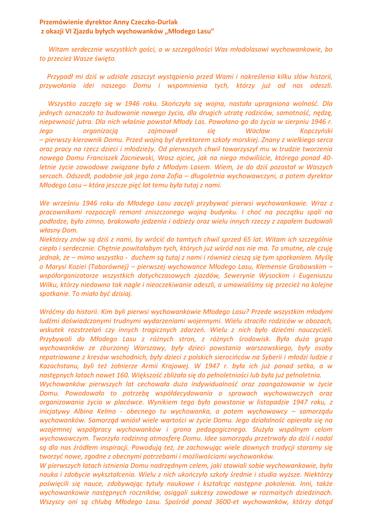 Przemówienie dyrektor Anny Czeczko-Durlak z okazji VI Zjazdu byłych wychowanków „Młodego Lasu” Witam serdecznie wszystkich gości, a w szczególności Was młodolasowi wychowankowie, bo to przecież Wasze święto. Przypadł mi dziś w udziale zaszczyt wystąpienia przed Wami i nakreślenia kilku słów historii, przywołania idei naszego Domu i wspomnienia tych, którzy już od nas odeszli. Wszystko zaczęło się w 1946 roku. Skooczyła się wojna, nastała upragniona wolnośd. Dla jednych oznaczało to budowanie nowego życia, dla drugich utratę rodziców, samotnośd, nędzę, niepewnośd jutra. Dla nich właśnie powstał Młody Las. Powołano go do życia w sierpniu 1946 r. Jego organizacją zajmował się Wacław Kopczyoski – pierwszy kierownik Domu. Przed wojną był dyrektorem szkoły morskiej. Znany z wielkiego serca oraz pracy na rzecz dzieci i młodzieży. Od pierwszych chwil towarzyszył mu w trudzie tworzenia nowego Domu Franciszek Zacniewski, Wasz ojciec, jak na niego mówiliście, którego ponad 40letnie życie zawodowe związane było z Młodym Lasem. Wiem, że do dziś pozostał w Waszych sercach. Odszedł, podobnie jak jego żona Zofia – długoletnia wychowawczyni, a potem dyrektor Młodego Lasu – która jeszcze pięd lat temu była tutaj z nami. We wrześniu 1946 roku do Młodego Lasu zaczęli przybywad pierwsi wychowankowie. Wraz z pracownikami rozpoczęli remont zniszczonego wojną budynku. I chod na początku spali na podłodze, było zimno, brakowało jedzenia i odzieży oraz wielu innych rzeczy z zapałem budowali własny Dom. Niektórzy znów są dziś z nami, by wrócid do tamtych chwil sprzed 65 lat. Witam ich szczególnie ciepło i serdecznie. Chętnie powitałabym tych, których już wśród nas nie ma. To smutne, ale czuję jednak, że – mimo wszystko - duchem są tutaj z nami i również cieszą się tym spotkaniem. Myślę o Marysi Koziei (Taborównej) – pierwszej wychowance Młodego Lasu, Klemensie Grabowskim – współorganizatorze wszystkich dotychczasowych zjazdów, Sewerynie Wysockim i Eugeniuszu Wilku, którzy niedawno tak nagle i nieoczekiwanie odeszli, a umawialiśmy się przecież na kolejne spotkanie. To miało byd dzisiaj. Wródmy do historii. Kim byli pierwsi wychowankowie Młodego Lasu? Przede wszystkim młodymi ludźmi doświadczonymi trudnymi wydarzeniami wojennymi. Wielu straciło rodziców w obozach, wskutek rozstrzelao czy innych tragicznych zdarzeo. Wielu z nich było dziedmi nauczycieli. Przybywali do Młodego Lasu z różnych stron, z różnych środowisk. Była duża grupa wychowanków ze zburzonej Warszawy, były dzieci powstania warszawskiego, były osoby repatriowane z kresów wschodnich, były dzieci z polskich sierocioców na Syberii i młodzi ludzie z Kazachstanu, byli też żołnierze Armii Krajowej. W 1947 r. była ich już ponad setka, a w następnych latach nawet 160. Większośd zbliżała się do pełnoletniości lub była już pełnoletnia. Wychowanków pierwszych lat cechowała duża indywidualnośd oraz zaangażowanie w życie Domu. Powodowało to potrzebę współdecydowania o sprawach wychowawczych oraz organizowania życia w placówce. Wynikiem tego było powstanie w listopadzie 1947 roku, z inicjatywy Albina Kelma - obecnego tu wychowanka, a potem wychowawcy – samorządu wychowanków. Samorząd wniósł wiele wartości w życie Domu. Jego działalnośd opierała się na wzajemnej współpracy wychowanków i grona pedagogicznego. Służyła wspólnym celom wychowawczym. Tworzyła rodzinną atmosferę Domu. Idee samorządu przetrwały do dziś i nadal są dla nas źródłem inspiracji. Powodują też, że zachowując wiele dawnych tradycji staramy się tworzyd nowe, zgodne z obecnymi potrzebami i możliwościami wychowanków. W pierwszych latach istnienia Domu nadrzędnym celem, jaki stawiali sobie wychowankowie, była nauka i zdobycie wykształcenia. Wielu z nich ukooczyło szkoły średnie i studia wyższe. Niektórzy poświęcili się nauce, zdobywając tytuły naukowe i kształcąc następne pokolenia. Inni, także wychowankowie następnych roczników, osiągali sukcesy zawodowe w rozmaitych dziedzinach. Wszyscy oni są chlubą Młodego Lasu. Spośród ponad 3600-et wychowanków, którzy dotąd opuścili nasz Dom, większośd – mimo różnych trudności i konieczności borykania się z przeciwnościami losu – poradziła sobie i znalazła swoje miejsce w życiu. Z nich Młody Las jest również bardzo dumny. Z biegiem lat zmieniały się przyczyny przebywania dzieci i młodzieży w Młodym Lesie. Coraz częstszym powodem kierowania ich do placówki było sieroctwo społeczne. Z tego względu zaczęło przybywad coraz więcej młodszych dzieci, wobec czego Młody Las zaczął zatracad charakter domu młodzieży. W tej sytuacji w 1994 roku zmieniono nazwę placówki z Paostwowego Domu Młodzieży Młody Las na Dom Dziecka nr 1 Młody Las. Przełomem w młodolasowej historii jest rok 1999, kiedy to przeszliśmy z resortu oświaty do resortu pomocy społecznej. Staliśmy się też jednostką organizacyjną Gminy Miasta Torunia. Rok 2005 to następna istotna zmiana w historii Młodego Lasu. Od 1 września tegoż roku, wskutek połączenia Pogotowia Opiekuoczego i Domu Dziecka nr 1 Młody Las, staliśmy się placówką opiekuoczo-wychowawczą wielofunkcyjną pod nazwą Centrum Wspierania Dzieci i Młodzieży „Młody Las”. Jak się jednak okazuje w naszej rzeczywistości zmianom nie ma kooca, bo przed nami kolejne wyzwania i przemiany. Mamy nadzieję, że Młody Las – chod pewnie w innej formie – będzie nadal trwał, pomagał innym i podtrzymywał swoje tradycje. Jedną z nich jest wsparcie i pomoc, jakie otrzymuje Młody Las – zresztą od początku swego istnienia – od wielkiego grona przyjaciół i sympatyków. Nie jest możliwe wymienienie ich wszystkich, ale ich serca od lat ogrzewają nas w różny sposób i za to chciałabym im – tu obecnym i nieobecnym – jak najgoręcej po
