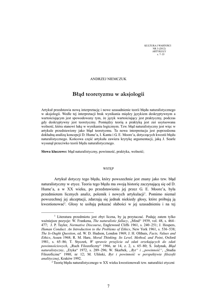 KULTURA I WARTOŚCI NR 3 (2012) ARTYKUŁY s. 7–35 ANDRZEJ NIEMCZUK Błąd teoretyzmu w aksjologii Artykuł przedstawia nową interpretację i nowe uzasadnienie teorii błędu naturalistycznego w aksjologii. Wedle tej interpretacji brak wynikania między językiem deskryptywnym a wartościującym jest spowodowany tym, że język wartościujący jest praktyczny, podczas gdy deskryptywny jest teoretyczny. Pomiędzy teorią a praktyką jest zaś usytuowana wolność, która stanowi lukę w wynikaniu logicznym. Tzw. błąd naturalistyczny jest więc w artykule przedstawiony jako błąd teoretyzmu. Ta nowa interpretacja jest poprzedzona dokładną analizą koncepcji D. Hume’a, I. Kanta i G. E. Moore’a, dotyczących kwestii błędu naturalistycznego. Końcowa część artykułu zawiera krytykę argumentacji, jaką J. Searle wysunął przeciwko teorii błędu naturalistycznego. Słowa kluczowe: błąd naturalistyczny, powinność, praktyka, wolność; WSTĘP Artykuł dotyczy tego błędu, który powszechnie jest znany jako tzw. błąd naturalistyczny w etyce. Teoria tego błędu ma swoją historię zaczynającą się od D. Hume’a, a w XX wieku, po przedstawieniu jej przez G. E. Moore’a, była przedmiotem licznych analiz, polemik i nowych artykulacji1. Pomimo niemal powszechnej jej akceptacji, zdarzają się jednak niekiedy głosy, które próbują ją kwestionować2. Głosy te usiłują pokazać słabości w jej uzasadnieniu i na tej 1 Literatura przedmiotu jest zbyt liczna, by ją przytaczać. Podaję zatem tylko ważniejsze pozycje: W. Frankena, The naturalistic fallacy, „Mind“ 1939, vol. 48, s. 464– 477; J. P. Taylor, Normative Discourse, Englewood Cliffs 1961, s. 240–251; J. Hospers, Human Conduct. An Introduction to the Problems of Ethics, New York 1961, s. 536–538; The Is-Ought Question, ed. W. D. Hudson, London 1969; J. H. Olthuis, Facts, Values and Ethics, Assen 1968; R. M. Hare, Moral Thinking. Its Level, Method, and Point, Oxford 1981, s. 65–86; T. Styczeń, W sprawie przejścia od zdań orzekających do zdań powinnościowych, „Ruch Filozoficzny“ 1966, nr 14, z. 2, s. 65–80; S. Jedynak, Błąd naturalistyczny, „Etyka“ 1972, s. 289–296; W. Skarbek, „Byt“ i „powinność“, „Studia Filozoficzne“ 1980, nr 12; M. Uliński, Byt i powinność w perspektywie filozofii analitycznej, Kraków 1992. 2 Teorię błędu naturalistycznego w XX wieku kwestionowali tzw. naturaliści etyczni 7 ANDRZEJ NIEMCZUK – BŁĄD TEORETYZMU W AKSJOLOGII podstawie ją zdyskredytować. Ponieważ kwestia błędu naturalistycznego w jej ogólnej charakterystyce jest powszechnie znana i wielokrotnie była prezentowana, to nie będę jej całej w sposób historyczny skrupulatnie wykładał. To, co mnie w niej interesuje, to samo jej meritum oraz – przede wszystkim – uzasadnienie. Uzasadnienie to bowiem jest najbardziej kontrowersyjnym elementem teorii. U różnych autorów jest ono formułowane odmiennie, co pozwala niektórym na kwestionowanie samej teorii. Uzasadnienie to przy tym – moim zdaniem – nie jest zadowalające i wymaga radykalnej modyfikacji. Celem artykułu jest zatem przedstawienie nowego uzasadnienia dla teorii tzw. błędu naturalistycznego, a tym samym pokazanie, że błąd ten nie jest w istocie mankamentem tylko różnorakich stanowisk naturalistycznych, jak jednoznacznie sugeruje jego nazwa. Tezą artykułu jest twierdzenie, że błąd, o którym mowa, polega na pomieszaniu myślenia teoretycznego z praktycznym, a dokładniej na tym, że w perspektywie filozofii teoretycznej (lub teorii naukowej) próbuje się ująć i wytłumaczyć to – przede wszystkim wartości, ale nie tylko – co w tej perspektywie jest nieujmowalne i niewytłumaczalne. Tak zwany błąd naturalizmu jest więc w istocie błędem teoretyzmu. HUME W Traktacie o naturze ludzkiej D. Hume napisał: „W każdym systemie moralności stwierdzałem zawsze, że autor przez pewien czas idzie zwykłą drogą rozumowania, ustala istnienie Boga, albo robi spostrzeżenia dotyczące spraw ludzkich, aż nagle i nieoczekiwanie ze zdziwieniem znajduję, iż zamiast zwykłych spójek, jakie znajduje się w zdaniach, a mianowicie »jest« i »nie jest«, nie spotykam żadnego zdania, które by nie było powiązane słowem »powinien« albo »nie powinien«. Ta zmiana jest niedostrzegalna, lecz niemniej ma wielką doniosłość. Wobec tego bowiem, że to »powinien« albo »nie powinien« jest wyrazem pewnego nowego stosunku czy twierdzenia, przeto jest rzeczą konieczną te zwroty zauważyć i wyjaśnić; a jednocześnie konieczne jest, iżby wskazana została racja tego, co wydaje się całkiem niezrozumiałe, a mianowicie, jak ten nowy stosunek może być wydedukowany z innych stosunków, które są całkiem różne od niego”3. Przytoczony fragment jest słynnym sformułowaniem argumentu zwanego „gilotyną Hume’a“ i stanowi historycznie pierwszą wersję tej teorii, którą G. E. (bo uderzała w ich własne teorie (np. por. P. B. Rice, On the Knowledge of Good and Evil, New York 1955, s. 42, lub R. B. Perry, The General Theory of Value, New York 1926). Z drugiej strony, kwestionowanie tej teorii można spotkać w metafizyce A. N. Whiteheada, gdzie usiłuje się podważyć sam podział na wiedzę opisową i normatywną. Ostatnimi czasy podział ten próbował zanegować A. MacIntyre (por. tegoż, Dziedzictwo cnoty, tłum. A. Chmielewski, Warszawa 1996) 3 D. Hume, Traktat o naturze ludzkiej, tłum. Cz. Znamierowski, Warszawa 1963, t. II, s. 259–260. 8 ANDRZEJ NIEMCZUK – BŁĄD TEORETYZMU W AKSJOLOGII Moore na początku XX wieku przedstawi i nazwie teorią błędu naturalistycznego w etyce. To spostrzeżenie Hume’a jest w jego pismach uwagą marginalną, której nigdzie więcej nie wyjaśnia, ani też w swojej pozytywnej teorii etycznej nie przestrzega4. Co w istocie stwierdza ta uwaga? Hume w niej zauważa, jak się zdaje, dwie kwestie. Po pierwsze, że zdania ze spójką „pow
