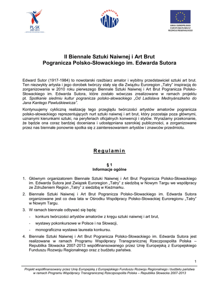 II Biennale Sztuki Naiwnej i Art Brut Pogranicza Polsko-Słowackiego im. Edwarda Sutora Edward Sutor (1917-1984) to nowotarski rzeźbiarz amator i wybitny przedstawiciel sztuki art brut. Ten niezwykły artysta i jego dorobek twórczy stały się dla Związku Euroregion „Tatry” inspiracją do zorganizowania w 2010 roku pierwszego Biennale Sztuki Naiwnej i Art Brut Pogranicza PolskoSłowackiego im. Edwarda Sutora, które zostało wówczas zrealizowane w ramach projektu pt. Spotkanie siedmiu kultur pogranicza polsko-słowackiego „Od Ladislava Mednyánszkeho do Jana Kantego Pawluśkiewicza”. Kontynuujemy cykliczną realizację tego przeglądu twórczości artystów amatorów pogranicza polsko-słowackiego reprezentujących nurt sztuki naiwnej i art brut, który pozostaje poza głównymi, uznanymi kierunkami sztuki, na peryferiach oficjalnych konwencji i stylów. Wyrażamy przekonanie, że będzie ona coraz bardziej doceniana i udostępniana szerokiej publiczności, a zorganizowane przez nas biennale ponownie spotka się z zainteresowaniem artystów i znawców przedmiotu. Regulamin §1 Informacje ogólne 1. Głównym organizatorem Biennale Sztuki Naiwnej i Art Brut Pogranicza Polsko-Słowackiego im. Edwarda Sutora jest Związek Euroregion „Tatry” z siedzibą w Nowym Targu we współpracy ze Združeniem Region „Tatry” z siedzibą w Kieżmarku. 2. Biennale Sztuki Naiwnej i Art Brut Pogranicza Polsko-Słowackiego im. Edwarda Sutora organizowane jest co dwa lata w Ośrodku Współpracy Polsko-Słowackiej Euroregionu „Tatry” w Nowym Targu. 3. W ramach biennale odbywać się będą: - konkurs twórczości artystów amatorów z kręgu sztuki naiwnej i art brut, - wystawy pokonkursowe w Polsce i na Słowacji, - monograficzna wystawa laureata konkursu. 4. Biennale Sztuki Naiwnej i Art Brut Pogranicza Polsko-Słowackiego im. Edwarda Sutora jest realizowane w ramach Programu Współpracy Transgranicznej Rzeczpospolita Polska – Republika Słowacka 2007-2013 współfinansowanego przez Unię Europejską z Europejskiego Funduszu Rozwoju Regionalnego oraz z budżetu państwa. 1 Projekt współfinansowany przez Unię Europejską z Europejskiego Funduszu Rozwoju Regionalnego i budżetu państwa w ramach Programu Współpracy Transgranicznej Rzeczpospolita Polska – Republika Słowacka 2007-2013 §2 Cele 1. Prezentacja szerokiej publiczności amatorskiej twórczości z kręgu malarstwa i rzeźby naiwnej i art brut, która pozostaje poza uznanymi kierunkami sztuki. 2. Odkrywanie oraz popularyzacja nowych i oryginalnych indywidualności twórczych z pogranicza polsko-słowackiego, reprezentujących nurt sztuki naiwnej i art brut. 3. Propagowanie twórczości patrona biennale, wybitnego nowotarskiego rzeźbiarza Edwarda Sutora. §3 Warunki uczestnictwa 1. W biennale mogą wziąć udział współcześni artyści amatorzy, reprezentujący wyłącznie nurt sztuki naiwnej i art brut, których prace zostaną zgłoszone przez instytucje kultury, galerie, muzea, stowarzyszenia, kolekcjonerów lub indywidualnie. 2. Biennale organizowane jest w ramach Programu Współpracy Transgranicznej Rzeczpospolita Polska – Republika Słowacka 2007-2013, dlatego też mogą w nim wziąć udział tylko twórcy zamieszkali lub tworzący na obszarze pogranicza polsko-słowackiego, rozumianego jako: po stronie polskiej: - w województwie małopolskim powiaty: limanowski, myślenicki, gorlicki, nowosądecki, nowotarski, myślenicki, oświęcimski, suski, tatrzański i wadowicki oraz miasto na prawach powiatu Nowy Sącz, - w województwie podkarpackim powiaty: bieszczadzki, brzozowski, jarosławski, jasielski, krośnieński, leski, lubaczowski, przemyski, przeworski, rzeszowski, sanocki i strzyżowski oraz miasta na prawach powiatu: Krosno, Przemyśl i Rzeszów, - w województwie śląskim powiaty: cieszyński, bielski, pszczyński i żywiecki oraz miasto na prawach powiatu Bielsko-Biała, po stronie słowackiej: - Kraj Preszowski, - Kraj Żyliński. 3. Dopuszcza się zgłaszanie maksymalnie 5 prac jednego artysty, wykonanych w dowolnej technice i prezentujących dowolną tematykę, które wcześniej nie były nagradzane na innych konkursach. 4. Zgłoszenia dokonuje się poprzez przesłanie wypełnionej karty wraz z dokumentacją fotograficzną prac w formie fotografii tradycyjnej lub cyfrowej na płycie CD. 5. Zgłoszenia należy przesyłać na adres: Związek Euroregion „Tatry” ul. Sobieskiego 2 34-400 Nowy Targ Polska Združenie Región „Tatry“ Hradné námestie 30 060 01 Kežmarok Słowacja 2 Projekt współfinansowany przez Unię Europejską z Europejskiego Funduszu Rozwoju Regionalnego i budżetu państwa w ramach Programu Współpracy Transgranicznej Rzeczpospolita Polska – Republika Słowacka 2007-2013 6. Prace zakwalifikowane do Biennale należy dostarczyć do siedziby Związku Euroregion „Tatry” w Nowym Targu lub siedziby Združenia Region „Tatry” w Kieżmarku. 7. Związek Euroregion „Tatry” zapewni ubezpieczenie prac podczas wystawy. §4 Jury, ocena prac i nagrody 1. Oceny prac dokona polsko-słowackie jury powoływane przez Dyrektora biura Związku Euroregion „Tatry”. W jego skład wejdzie 5 ekspertów – 3 z Polski i 2 ze Słowacji. 2. Wybór i ocena prac przebiegać będzie w dwóch etapach. W I etapie jury na podstawie nadesłanej dokumentacji fotograficznej zakwalifikuje prace do konkursu. Jury wykluczy prace nie spełniające kryteriów określonych w § 3. W II etapie jury dokona oceny zakwalifikowanych prac oraz wybierze prace na wystawę pokonkursową. 3. Jury przyzna zwycięzcy konkursu nagrodę główną oraz zadecyduje o przyznaniu innych nagród i wyróżnień. Laureat nagrody głównej zostanie zaproszony do zaprezentowania swojej twórczości na monograficznej wystawie zorganizowanej w 2013 roku. 4. Jury w ramach swoich kompetencji rozstrzygać będzie również o innych sprawach merytorycznych dotyczących biennale. 5. Wszyscy autorzy prac zakwalifikowanych do bie
