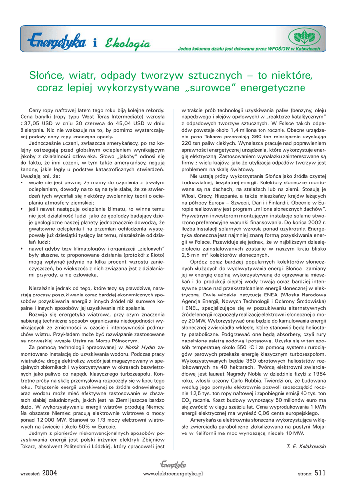 S³oñce, wiatr, odpady tworzyw sztucznych to niektóre, coraz lepiej wykorzystywane surowce energetyczne Ceny ropy naftowej latem tego roku bij¹ kolejne rekordy. Cena bary³ki (ropy typu West Teras Intermediate) wzros³a z 37,05 USD w dniu 30 czerwca do 45,04 USD w dniu 9 sierpnia. Nic nie wskazuje na to, by pomimo wystarczaj¹cej poda¿y ceny ropy znacz¹co spad³y. Jednoczenie uczeni, zw³aszcza amerykañscy, po raz kolejny ostrzegaj¹ przed globalnym ociepleniem wynikaj¹cym jakoby z dzia³alnoci cz³owieka. S³owo jakoby odnosi siê do faktu, ¿e inni uczeni, w tym tak¿e amerykañscy, neguj¹ kanony, jakie leg³y u podstaw katastroficznych stwierdzeñ. Uwa¿aj¹ oni, ¿e: wcale nie jest pewne, ¿e mamy do czynienia z trwa³ym ociepleniem, dowody na to s¹ na tyle s³abe, ¿e ze stwierdzeñ tych wycofali siê niektórzy zwolennicy teorii o ocieplaniu atmosfery ziemskiej; jeli nawet nastêpuje ocieplenie klimatu, to winna temu nie jest dzia³alnoæ ludzi, jako ¿e geolodzy badaj¹cy dzieje geologiczne naszej planety jednoznacznie dowodz¹, ¿e gwa³towne ocieplenia i na przemian och³odzenia wystêpowa³y ju¿ dziesi¹tki tysiêcy lat temu, niezale¿nie od dzia³añ ludzi; nawet gdyby tezy klimatologów i organizacji zielonych by³y s³uszne, to proponowane dzia³ania (protokó³ z Kioto) mog¹ wp³yn¹æ jedynie na kilka procent wzrostu zanieczyszczeñ, bo wiêkszoæ z nich zwi¹zana jest z dzia³aniami przyrody, a nie cz³owieka. Niezale¿nie jednak od tego, które tezy s¹ prawdziwe, narastaj¹ procesy poszukiwania coraz bardziej ekonomicznych sposobów pozyskiwania energii z innych róde³ ni¿ surowce kopalne i innych sposobów jej uzyskiwania ni¿ spalanie. Rozwija siê energetyka wiatrowa, przy czym znaczenia nabieraj¹ techniczne sposoby ograniczania niedogodnoci wynikaj¹cych ze zmiennoci w czasie i intensywnoci podmuchów wiatru. Przyk³adem mo¿e byæ rozwi¹zanie zastosowane na norweskiej wyspie Utsira na Morzu Pó³nocnym. Za pomoc¹ technologii opracowanej w Norsk Hydro zamontowano instalacjê do uzyskiwania wodoru. Podczas pracy wiatraków, drog¹ elektrolizy, wodór jest magazynowany w specjalnych zbiornikach i wykorzystywany w okresach bezwietrznych jako paliwo do napêdu klasycznego turbozespo³u. Konkretne próby na skalê przemys³ow¹ rozpoczê³y siê w lipcu tego roku. Po³¹czenie energii uzyskiwanej ze ród³a odnawialnego oraz wodoru mo¿e mieæ efektywne zastosowanie w obszarach s³abiej zaludnionych, jakich jest na Ziemi jeszcze bardzo du¿o. W wykorzystywaniu energii wiatrów przoduj¹ Niemcy. Na obszarze Niemiec pracuj¹ elektrownie wiatrowe o mocy ponad 12 000 MW. Stanowi to 1/3 mocy elektrowni wiatrowych na wiecie i oko³o 50% w Europie. Jednym z pionierów niekonwencjonalnych sposobów pozyskiwania energii jest polski in¿ynier elektryk Zbigniew Tokarz, absolwent Politechniki £ódzkiej, który opracowa³ i jest wrzesień 2004 w trakcie prób technologii uzyskiwania paliw (benzyny, oleju napêdowego i olejów opa³owych) w reaktorze katalitycznym z odpadowych tworzyw sztucznych. W Polsce takich odpadów powstaje oko³o 1,4 miliona ton rocznie. Obecne urz¹dzenia pana Tokarza przerabiaj¹ 360 ton miesiêcznie uzyskuj¹c 220 ton paliw ciek³ych. Wynalazca pracuje nad poprawieniem sprawnoci energetycznej urz¹dzenia, które wykorzystuje energiê elektryczn¹. Zastosowaniem wynalazku zainteresowane s¹ firmy z wielu krajów, jako ¿e utylizacja odpadów tworzyw jest problemem na skalê wiatow¹. Nie ustaj¹ próby wykorzystania S³oñca jako ród³a czystej i odnawialnej, bezp³atnej energii. Kolektory s³oneczne montowane s¹ na dachach, na stela¿ach lub na ziemi. Stosuj¹ je W³osi, Grecy, Hiszpanie, a tak¿e mieszkañcy krajów le¿¹cych na pó³nocy Europy Szwecji, Danii i Finlandii. Obecnie w Europie realizowany jest program miliona s³onecznych dachów. Prywatnym inwestorom montuj¹cym instalacje solarne stworzono preferencyjne warunki finansowania. Do koñca 2002 r. liczba instalacji solarnych wzros³a ponad trzykrotnie. Energetyka s³oneczna jest najmniej znan¹ form¹ pozyskiwania energii w Polsce. Przewiduje siê jednak, ¿e w najbli¿szym dziesiêcioleciu zainstalowanych zostanie w naszym kraju blisko 2,5 mln m2 kolektorów s³onecznych. Oprócz coraz bardziej popularnych kolektorów s³onecznych s³u¿¹cych do wychwytywania energii S³oñca i zamiany jej w energiê ciepln¹ wykorzystywan¹ do ogrzewania mieszkañ i do produkcji ciep³ej wody trwaj¹ coraz bardziej intensywne prace nad przekszta³caniem energii s³onecznej w elektryczn¹. Dwie w³oskie instytucje ENEA (W³oska Narodowa Agencja Energii, Nowych Technologii i Ochrony rodowiska) i ENEL, specjalizuj¹ce siê w poszukiwaniu alternatywnych róde³ energii rozpoczê³y realizacjê elektrowni s³onecznej o mocy 20 MW. Wykorzystywaæ ona bêdzie do kumulowania energii s³onecznej zwierciad³a wklês³e, które stanowiæ bêd¹ heliostaty paraboliczne. Podgrzewaæ one bêd¹ absorbery, czyli rury nape³nione saletr¹ sodow¹ i potasow¹. Uzyska siê w ten sposób temperaturê oko³o 550 oC i za pomoc¹ systemu ruroci¹gów parowych przeka¿e energiê klasycznym turbozespo³om. Wykorzystywanych bêdzie 360 obrotowych heliostatów rozlokowanych na 40 hektarach. Twórc¹ elektrowni zwierciad³owej jest laureat Nagrody Nobla w dziedzinie fizyki z 1984 roku, w³oski uczony Carlo Rubbia. Twierdzi on, ¿e budowana wed³ug jego pomys³u elektrownia pozwoli zaoszczêdziæ rocznie 12,5 tys. ton ropy naftowej i zapobiegnie emisji 40 tys. ton CO2 rocznie. Koszt budowy wynosz¹cy 50 milionów euro ma siê zwróciæ w ci¹gu szeciu lat. Cena wyprodukowania 1 kWh energii elektrycznej ma wynieæ 0,06 centa europejskiego. Amerykañska elektrownia s³oneczna wykorzystuj¹ca wklês³e zwierciad³a paraboliczne zlokalizowana na pustyni Mojave w Kalifornii ma moc wynosz¹c¹ nieca³e 10 MW. www.elektroenergetyka.pl T. E. Ko³akowski strona 511