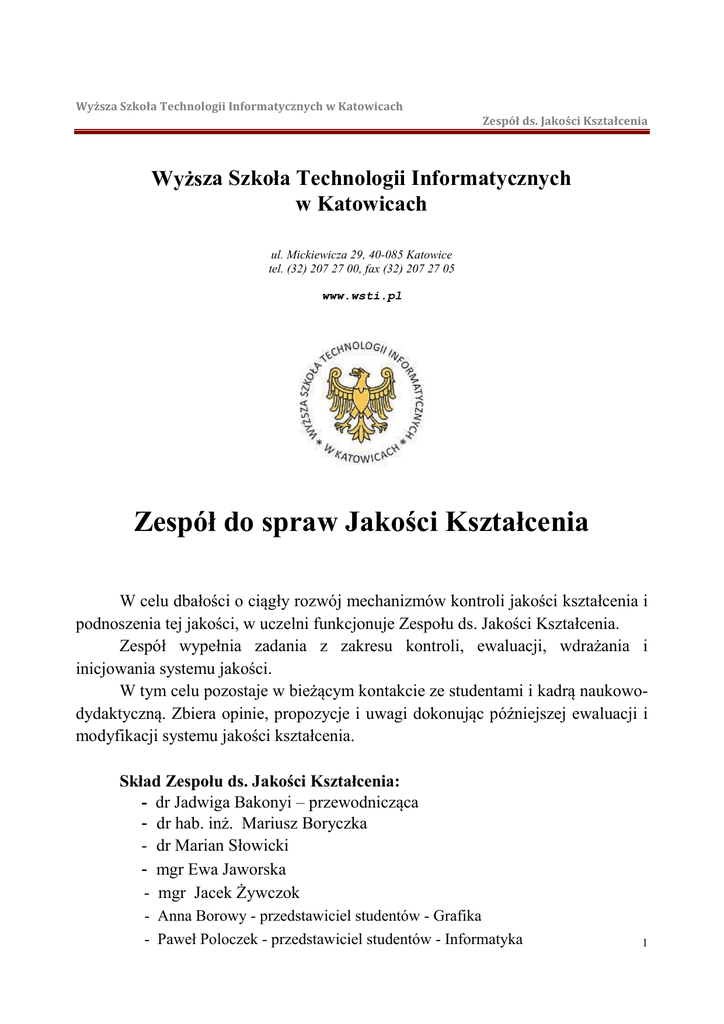 Wyższa Szkoła Technologii Informatycznych w Katowicach Zespół ds. Jakości Kształcenia Wyższa Szkoła Technologii Informatycznych w Katowicach ul. Mickiewicza 29, 40-085 Katowice tel. (32) 207 27 00, fax (32) 207 27 05 www.wsti.pl Zespół do spraw Jakości Kształcenia W celu dbałości o ciągły rozwój mechanizmów kontroli jakości kształcenia i podnoszenia tej jakości, w uczelni funkcjonuje Zespołu ds. Jakości Kształcenia. Zespół wypełnia zadania z zakresu kontroli, ewaluacji, wdrażania i inicjowania systemu jakości. W tym celu pozostaje w bieżącym kontakcie ze studentami i kadrą naukowodydaktyczną. Zbiera opinie, propozycje i uwagi dokonując późniejszej ewaluacji i modyfikacji systemu jakości kształcenia. Skład Zespołu ds. Jakości Kształcenia: - dr Jadwiga Bakonyi – przewodnicząca - dr hab. inż. Mariusz Boryczka - dr Marian Słowicki - mgr Ewa Jaworska - mgr Jacek Żywczok - Anna Borowy - przedstawiciel studentów - Grafika - Paweł Poloczek - przedstawiciel studentów - Informatyka 1 Wyższa Szkoła Technologii Informatycznych w Katowicach Zespół ds. Jakości Kształcenia Zadania Zespołu ds. Jakości Kształcenia Celem powołania ZJK jest dbałość o stałe podnoszenie jakości kształcenia. Ogólny zakres jego działania definiują poniższe punkty. 1. Współudział w opracowywaniu celów i strategii zapewniania jakości kształcenia. 2. Opiniowanie planów i programów studiów. 3. Opracowanie kryteriów oceny działalności naukowo - dydaktycznej nauczycieli akademickich i osób współuczestniczących w procesie dydaktycznym. 4. Gromadzenie, analiza, publikowanie i wykorzystanie danych związanych z funkcjonowaniem Uczelnianego Systemu Zapewniania Jakości Kształcenia. 5. Koordynacja poszczególnych etapów prac związanych z realizacją wytycznych określonych w Uczelnianym Systemie Zapewniania Jakości Kształcenia. 6. Opracowywanie i coroczne przedstawianie wskazówek i rekomendacji zapewniających stałe doskonalenie jakości kształcenia. 7. Nadzorowanie zgodności przebiegu zajęć z obowiązującym programem kształcenia. 8. Współpraca z pracownikami (komisjami) obsługującymi proces kształcenia. 9. ZJK dokonuje corocznej analizy i oceny efektów kształcenia, a Przewodniczący ZJK przedstawia rezultaty oceny na posiedzeniu Senatu. 10.Przewodniczący Zespołu zdaje sprawozdanie roczne z prac Zespołu na posiedzeniu Senatu. 2