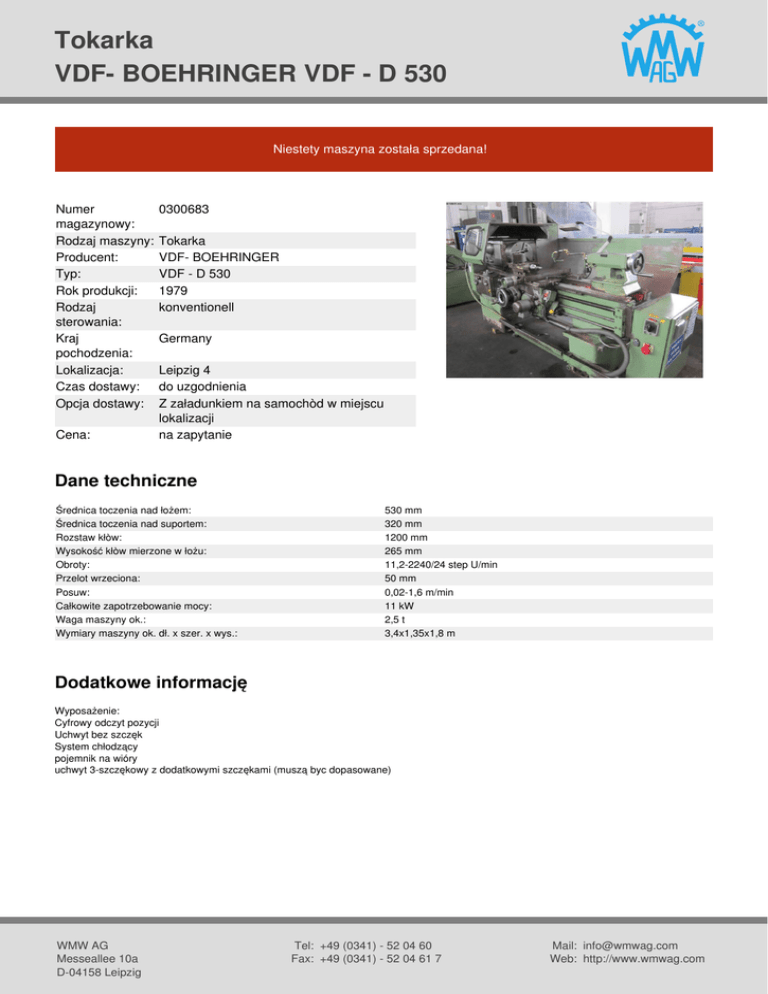 Tokarka VDF- BOEHRINGER VDF - D 530 Niestety maszyna została sprzedana! Numer magazynowy: Rodzaj maszyny: Producent: Typ: Rok produkcji: Rodzaj sterowania: Kraj pochodzenia: Lokalizacja: Czas dostawy: Opcja dostawy: Cena: 0300683 Tokarka VDF- BOEHRINGER VDF - D 530 1979 konventionell Germany Leipzig 4 do uzgodnienia Z załadunkiem na samochòd w miejscu lokalizacji na zapytanie Dane techniczne Średnica toczenia nad łożem: Średnica toczenia nad suportem: Rozstaw kłòw: Wysokość kłòw mierzone w łożu: Obroty: Przelot wrzeciona: Posuw: Całkowite zapotrzebowanie mocy: Waga maszyny ok.: Wymiary maszyny ok. dł. x szer. x wys.: 530 mm 320 mm 1200 mm 265 mm 11,2-2240/24 step U/min 50 mm 0,02-1,6 m/min 11 kW 2,5 t 3,4x1,35x1,8 m Dodatkowe informację Wyposażenie: Cyfrowy odczyt pozycji Uchwyt bez szczęk System chłodzący pojemnik na wióry uchwyt 3-szczękowy z dodatkowymi szczękami (muszą byc dopasowane) WMW AG Messeallee 10a D-04158 Leipzig Powered by TCPDF (www.tcpdf.org) Tel: +49 (0341) - 52 04 60 Fax: +49 (0341) - 52 04 61 7 Mail: [email protected] Web: http://www.wmwag.com