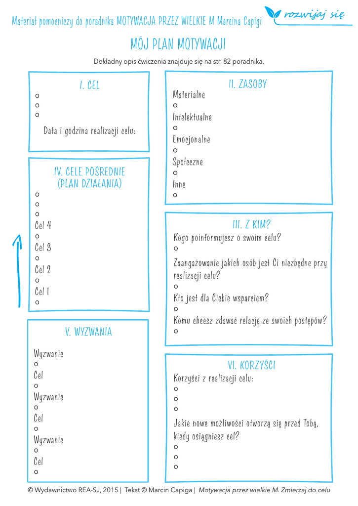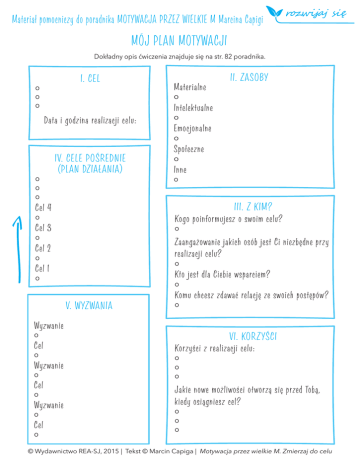 Materiał pomocniczy do poradnika MOTYWACJA PRZEZ WIELKIE M Marcina Capigi MÓJ PLAN MOTYWACJI Dokładny opis ćwiczenia znajduje się na str. 82 poradnika. I. CEL oo oo oo Materialne II. ZASOBY oo Intelektualne Data i godzina realizacji celu: oo Emocjonalne oo oo oo oo IV. CELE POŚREDNIE ( PLAN DZIAŁANIA ) Społeczne oo Inne oo III. Z KIM? Cel 4 oo Kogo poinformujesz o swoim celu? Cel 3 oo oo Zaangażowanie jakich osób jest Ci niezbędne przy realizacji celu? Cel 2 oo oo Cel 1 Kto jest dla Ciebie wsparciem? oo oo V. WYZWANIA Komu chcesz zdawać relację ze swoich postępów? oo Wyzwanie oo Cel oo Wyzwanie oo Cel oo Wyzwanie oo Cel oo VI. KORZ YŚCI Korzyści z realizacji celu: oo oo oo Jakie nowe możliwości otworzą się przed Tobą, kiedy osiągniesz cel? oo oo oo © Wydawnictwo REA-SJ, 2015 | Tekst © Marcin Capiga | Motywacja przez wielkie M. Zmierzaj do celu