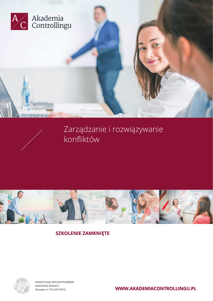 Zarządzanie i rozwiązywanie konfliktów SZKOLENIE ZAMKNIĘTE AKREDYTACJA WIELKOPOLSKIEGO KURATORA OŚWIATY (Decyzja nr 110.2.870.2015) WWW.AKADEMIACONTROLLINGU.PL Learning by Design Zarządzanie i rozwiązywanie konfliktów KONTAKT Marta Elimer [email protected] Tel. + 48 61 852 33 53 Fax. + 48 61 666 03 63 TRENERZY Opis szkolenia Dlaczego warto Po zakończeniu warsztatów uczestnicy poprawią oraz nabędą umiejętności: - przewidywania i rozpoznawania konfliktu w początkowym stadium - identyfikowania przyczyn konfliktów - konstruktywnego zarządzania konfliktem - sprawnego własnego funkcjonowania w sytuacji konfliktowej - efektywnej współpracy - obiektywnego uczestniczenia w konfliktach - prawidłowego formułowania informacji zwrotnych - odczytywania mowy ciała - aktywnego słuchania rozmówcy - zrozumiałego prezentowania swoich argumentów - kreowania postawy asertywnej - wykorzystywania sytuacji trudnych do znajdywania nowych rozwiązań - redukowania agresji - rozpoznawania pułapek oraz eliminowania najczęściej popełnianych błędów w rozwiązywaniu konfliktów Cele szkolenia Cele szkolenia: - Nabycie umiejętności identyfikowania źródeł konfliktów w organizacji - Poznanie mechanizmów i natury sporów - Wzrost umiejętności rozwiązywania nieporozumień w praktyce - Poznanie strategii zarządzania konfliktami - Zdobycie praktycznej wiedzy na temat kontrolowania i zakańczania sytuacji konfliktowych Akademia Controllingu Sp. z o.o. ul. Towarowa 35/403A 61-896 Poznań [email protected] www.akademiacontrollingu.pl Tel.: 61 852 33 53 NIP: 7811817052 REGON: 302844320 KRS: 0000526759; Sąd rejonowy w Poznaniu, VII Wydział Gospodarczy KRS, kapitał zakładowy 100 000 PLN 2 2/4 Learning by Design - Przedstawienie czynników i okoliczności, sprzyjających konfliktom Program Zarządzanie i rozwiązywanie konfliktów Program: 1. KONFLIKT - Rodzaje konfliktów - Rozpoznawanie przyczyny konfliktów - Konsekwencje pozytywne i negatywne sporów - Komunikowanie się w konflikcie:– dynamika– metody doprowadzania do zmiany– zniekształcenia komunikacji– rozwiązywanie konfliktówRozróżnienie pomiędzy zachowaniem a wartościami stron 2. METODY ZARZĄDZANIA KONFLIKTEM - Stymulowanie - Ograniczenie - Rozwiązywanie - Negocjacje - Mediacja 3. ZASTOSOWANIE ANALIZY TRANSAKCYJNEJ W ROZWIĄZYWANIU SYTUACJI KONFLIKTOWYCH - Rodzaje stanów “ja” - Sterowanie relacją poprzez tworzenie komunikatów typu dorosły – dorosły - Budowanie komplementarnych relacji między stronami w konflikcie - Rozpoznawanie i demaskowanie gier oraz manipulacji 4. IDENTYFIKACJA I PRZEŁAMYWANIE BARIER W KOMUNIKACJI - Diagnoza impasów w pracy zespołu nastawionego na realizację zadania - Strategie w pokonywaniu impasów i metody prowadzenia zespołu do celu - Wykorzystanie pozytywnej siły konfliktów - Bariery w komunikacji interpersonalnej (przekonania, nawyki, oczekiwania, dostosowanie do powszechnych norm) - Identyfikacja barier jako pierwszy krok na drodze ich pozytywnego wykorzystywania - Formułowanie nowych strategii komunikowania się 5. KOMUNIKACJA ASERTYWNA - Prowadzenie rozmowy dyscyplinującej (zbieranie informacji, opiniowanie, poszukiwanie optymalnych rozwiązań, wyrażanie konstruktywnej krytyki, formułowanie rozwiązań na przyszłość) - Prowadzenie rozmowy motywującej (zbieranie informacji, kryteria formułowania ocen, wyrażanie konstruktywnych pochwał i krytyki, budowanie planów na przyszłość) 6. BŁĘDY W ZARZĄDZANIU KONFLIKTEM - Eskalacja zaangażowania - Mityczność ograniczonego tortu - Zakotwiczenie - Przyjmowanie perspektywy - Dostępność informacji - Przekleństwo zwycięzcy - Nadmierna pewność siebie Sylwetka trenera Akademia Controllingu Sp. z o.o. ul. Towarowa 35/403A 61-896 Poznań [email protected] www.akademiacontrollingu.pl Tel.: 61 852 33 53 NIP: 7811817052 REGON: 302844320 KRS: 0000526759; Sąd rejonowy w Poznaniu, VII Wydział Gospodarczy KRS, kapitał zakładowy 100 000 PLN 3 3/4 Learning by Design Karolina Zielińska – Salamończyk Specjalistka z zakresu sprzedaży, negocjacji, zarządzania, przywództwa, komunikacji i zarządzania czasem, prezentacji oraz obsługi klienta.Absolwentka Zarządzania Zasobami Ludzkimi w Wyższej Szkole Przedsiębiorczości i Zarządzania w Warszawie im. Leona Koźmińskiego oraz podyplomowych studiów o specjalizacji Psychologia Pracownika. Ze szkoleniami związana od 1999 roku. Pracowała m.in. jako trener i koordynator ds. szkoleń w Norwich Union, później na stanowisku kierowniczym w jednej ze spółek Telekomunikacji Polskiej. Była również dyrektorem zarządzającym w jednej z większych firm szkoleniowych na Śląsku. Prowadzi szkolenia z zakresu sprzedaży, negocjacji, zarządzania, przywództwa, komunikacji, prezentacji oraz obsługi klienta. Jest wykładowcą na studiach podyplomowych „Akademia Trenera” w Wyższej Szkole Bankowości w Chorzowie, zajmuje się również programami motywacyjnymi w małych przedsiębiorstwach. W ciągu swojej kariery zawodowej współpracowała m.in. z: Coca Cola, BRE Leasing, Netia, Provident, Rabugino, RTV Euro AGD, GE Money Bank, Polpager, Wirtualna Polska, General Motors, LPP, PPD Marketing Service, PTE Norwich Union, Sampo, Generali, Browary Perła, PolCard, PZU, Witko, Kadry Polskie, Top Farms, MacroSoft, Werkpol, Puls Biznesu, Remy Automotive, TOI TOI i innymi. Akademia Controllingu Sp. z o.o. ul. Towarowa 35/403A 61-896 Poznań [email protected] www.akademiacontrollingu.pl Tel.: 61 852 33 53 NIP: 7811817052 REGON: 302844320 KRS: 0000526759; Sąd rejonowy w Poznaniu, VII Wydział Gospodarczy KRS, kapitał zakładowy 100 000 PLN 3 4/4