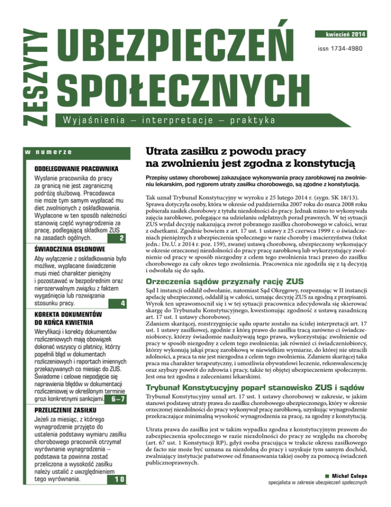 ZESZYTY UBEZPIECZEŃ SPOŁECZNYCH kwiecień 2014 issn 1734-4980 Wyjaśnienia – interpretacje – praktyka w numerze ODDELEGOWANIE PRACOWNIKA Wysłanie pracownika do pracy za granicą nie jest zagraniczną podróżą służbową. Pracodawca nie może tym samym wypłacać mu diet zwolnionych z oskładkowania. Wypłacone w ten sposób należności stanowią część wynagrodzenia za pracę, podlegającą składkom ZUS na zasadach ogólnych. 2 ŚWIADCZENIA OSŁONOWE Aby wyłączenie z oskładkowania było możliwe, wypłacane świadczenie musi mieć charakter pieniężny i pozostawać w bezpośrednim oraz nierozerwalnym związku z faktem wygaśnięcia lub rozwiązania stosunku pracy. 4 KOREKTA DOKUMENTÓW DO KOŃCA KWIETNIA Weryfikacji i korekty dokumentów rozliczeniowych mają obowiązek dokonać wszyscy ci płatnicy, którzy popełnili błąd w dokumentach rozliczeniowych i raportach imiennych przekazywanych co miesiąc do ZUS. Świadome i celowe niepodjęcie się naprawienia błędów w dokumentacji rozliczeniowej w określonym terminie grozi konkretnymi sankcjami. 6–7 PRZELICZENIE ZASIŁKU Jeżeli za miesiąc, z którego wynagrodzenie przyjęto do ustalenia podstawy wymiaru zasiłku chorobowego pracownik otrzymał wyrównanie wynagrodzenia – podstawa ta powinna zostać przeliczona a wysokość zasiłku należy ustalić z uwzględnieniem tego wyrównania. 10 Utrata zasiłku z powodu pracy na zwolnieniu jest zgodna z konstytucją Przepisy ustawy chorobowej zakazujące wykonywania pracy zarobkowej na zwolnieniu lekarskim, pod rygorem utraty zasiłku chorobowego, są zgodne z konstytucją. Tak uznał Trybunał Konstytucyjny w wyroku z 25 lutego 2014 r. (sygn. SK 18/13). Sprawa dotyczyła osoby, która w okresie od października 2007 roku do marca 2008 roku pobierała zasiłek chorobowy z tytułu niezdolności do pracy. Jednak mimo to wykonywała zajęcia zarobkowe, polegające na udzielaniu odpłatnych porad prawnych. W tej sytuacji ZUS wydał decyzję nakazującą zwrot pobranego zasiłku chorobowego w całości, wraz z odsetkami. Zgodnie bowiem z art. 17 ust. 1 ustawy z 25 czerwca 1999 r. o świadczeniach pieniężnych z ubezpieczenia społecznego w razie choroby i macierzyństwa (tekst jedn.: Dz.U. z 2014 r. poz. 159), zwanej ustawą chorobową, ubezpieczony wykonujący w okresie orzeczonej niezdolności do pracy pracę zarobkową lub wykorzystujący zwolnienie od pracy w sposób niezgodny z celem tego zwolnienia traci prawo do zasiłku chorobowego za cały okres tego zwolnienia. Pracownica nie zgodziła się z tą decyzją i odwołała się do sądu. Orzeczenia sądów przyznały rację ZUS Sąd I instancji oddalił odwołanie, natomiast Sąd Okręgowy, rozpoznając w II instancji apelację ubezpieczonej, oddalił ją w całości, uznając decyzję ZUS za zgodną z przepisami. Wyrok ten uprawomocnił się i w tej sytuacji pracownica zdecydowała się skierować skargę do Trybunału Konstytucyjnego, kwestionując zgodność z ustawą zasadniczą art. 17 ust. 1 ustawy chorobowej. Zdaniem skarżącej, rozstrzygnięcie sądu oparte zostało na ścisłej interpretacji art. 17 ust. 1 ustawy zasiłkowej, zgodnie z którą prawo do zasiłku tracą zarówno ci świadczeniobiorcy, którzy świadomie nadużywają tego prawa, wykorzystując zwolnienie od pracy w sposób niezgodny z celem tego zwolnienia; jak również ci świadczeniobiorcy, którzy wykonują jakąś pracę zarobkową w niewielkim wymiarze, do której nie utracili zdolności, a praca ta nie jest niezgodna z celem tego zwolnienia. Zdaniem skarżącej taka praca ma charakter terapeutyczny, i umożliwia obywatelowi leczenie, rekonwalescencję oraz szybszy powrót do zdrowia i pracy, także tej objętej ubezpieczeniem społecznym. Jest ona też zgodna z zaleceniami lekarskimi. Trybunał Konstytucyjny poparł stanowisko ZUS i sądów Trybunał Konstytucyjny uznał art. 17 ust. 1 ustawy chorobowej w zakresie, w jakim stanowi podstawę utraty prawa do zasiłku chorobowego ubezpieczonego, który w okresie orzeczonej niezdolności do pracy wykonywał pracę zarobkową, uzyskując wynagrodzenie przekraczające minimalną wysokość wynagrodzenia za pracę, za zgodny z konstytucją. Utrata prawa do zasiłku jest w takim wypadku zgodna z konstytucyjnym prawem do zabezpieczenia społecznego w razie niezdolności do pracy ze względu na chorobę (art. 67 ust. 1 Konstytucji RP), gdyż osoba pracująca w trakcie okresu zasiłkowego de facto nie może być uznana za niezdolną do pracy i uzyskuje tym samym dochód, zwalniający instytucje państwowe od finansowania takiej osoby za pomocą świadczeń publicznoprawnych. Michał Culepa specjalista w zakresie ubezpieczeń społecznych Aktualności Płatnik lub ZUS ustalają stopę procentową składki wypadkowej OD REDAKCJI Przedsiębiorcom podlegającym wpisowi do rejestru REGON, zgłaszającym do ubezpieczenia wypadkowego w 2013 roku co najmniej 10 ubezpieczonych, którzy złożyli ZUS IWA za lata 2011, 2012, 2013, stopę procentową określa ZUS. Pozostali muszą ustalić ją sami. SZANOWNI CZYTELNICY, w kwietniu płatników czekają dwa ważne obowiązki. Pierwszym z nich jest ustalenie składki wypadkowej na kolejny rok składkowy od 1 kwietnia 2014 r. do 31 marca 2015 r., drugim zaś sprawdzenie i ewentualne skorygowanie dokumentów rozliczeniowych. Warto zatem zapoznać się z Tematem numeru i numerem specjalnym, w których tematyka ciążących na pracodawcach/płatnikach zobowiązaniach jest omówiona w szczegółowy, a co najważniejsze kompleksowy sposób. Życząc przyjemnej i pożytecznej lektury, pragnę przy okazji złożyć serdeczne życzenia zdrowych, radosnych, rodzinnych świąt wielkanocnych. Krystyna Trojanowska Dodatkowo dla Czytelników: • S erwis e-mailowy Przegląd ZUS i Płace – z nowościami w ubezpieczeniach społecznych • B ezpłatne wydanie online z archiwum dostępne na www.e.zeszytyus.pl • D ostęp do serwisu www.wskazniki.pl z aktualnymi wskaźnikami i s