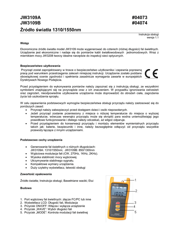 JW3109A JW3109B #04073 #04074 Źródło światła 1310/1550nm Instrukcja obsługi wersja 1.1 Wstęp Ekonomiczne źródło ródło światła model JW3109 moŜe wygenerować do czterech (róŜnej długości) fal świetlnych. Urządzenie jest ekonomiczne i nadaje się do pomiarów kabli światłowodowych jednomodowych. Wraz z miernikiem mocy JW3208 tworzy idealne narzędzie do inspekcji sieci optycznych. Bezpieczeństwo uŜytkowania Przyrząd został zaprojektowany w trosce o bezpieczeństwo uŜytkownika i zapewnia poprawną pracę pod warunkiem przestrzegania zaleceń niniejszej instrukcji. Urządzenie zostało poddane obowiązkowej ocenie zgodności i spełnienia zasadnicze wymagania zawarte w europejskich Dyrektywach Nowego Podejścia. Nie moŜna wy świetlić obrazu. Na k omputerze moŜe brak ować pamięci do otwarcia obrazu lub obraz moŜe by ć uszk odzony . Uruchom ponownie k omputer, a następnie otwórz plik ponownie. Jeśli czerwony znak x nadal będzie wy świetlany , k onieczne moŜe by ć usunięcie obrazu, a następnie ponowne wstawienie go. Przed przystąpieniem do wykonywania pomiaró pomiarów w naleŜy zapoznać się z instrukcją obsługi, ze wszystkimi symbolami znajdującymi się na przyrządzie oraz z ich znaczeniem. W przypadku ignorowania ostrzeŜeń oraz zagroŜeń, nieodpowiednie uŜytkowanie urządzenia moŜe doprowadzić do obraŜeń ciała, zagroŜenia Ŝycia lub uszkodzenia sprzętu. W celu zapewnienia podstawowych wymogów bezpieczeństwa obsługi przyrządu naleŜy zastosować się do poniŜszych zasad: • Przyrząd naleŜy zabezpieczyć przed dostępem dzieci i osób niepowołanych. • JeŜeli przyrząd zostanie przeniesiony z miejsca o niŜszej temperaturze do miejsca o wyŜszej temperaturze, wówczas wewnątrz przyrządu moŜe się skroplić para wodna uniemoŜliwiając jego prawidłowe funkcjonowanie i dlatego naleŜy odczekać, aŜ wilgoć odparuje. • Przed przystąpieniem do kkonserwacji onserwacji przyrządu i montaŜu elementów wymienialnych przyrządu takich jak: baterie, bezpieczniki i inne, naleŜy bezwzględnie odłączyć od przyrządu wszystkie przewody łączące z innymi urządzeniami. Podstawowe cechy urządzenia • • • • • • Generowanie fal świetlny świetlnych o róŜnych długościach: JW3109A: 1310/1550nm 1310/1550nm; JW3109B: 850/1300nm Wyjściowa modulacja fali (CW, 270Hz, 1KHz, 2KHz) 2KHz). Wysoka stabilność mocy wyjściowej. Utrzymywanie stabilnego sygnału. Kompaktowe wymiary urządzenia. DuŜy czytelny wyświetlacz, łatwość obsługi Zawartość opakowania Źródło światła; Instrukcja obsługi;; Bawełniane waciki; Etui Budowa 1. 2. 3. 4. 5. Port wyjściowy fal świetlnych: złącze FC/PC lub inne Wyświetlacz LCD:: Długość fali, Modulacja Przycisk ON/OFF: Włącza i wyłącza urządzenie Przycisk „WAVE”: Wybór długości fali Przycisk „MODE”: Kontrola modulacji fali świetlnej Pomiary Aby włączyć urządzenie naciśnij i przytrzymaj (około 1 sek.) przycisk długość fali – 1310nm) Połączenie: złącze FC/PC Aby wybrać długość fali naciśnij przycisk „WAVE” Aby przejść do modulacji fali świetlnej naciśnij przycisk „MODE” ON/OFF (ustawiona domyślna UWAGI: 1. Wszystkie optyczne połączenia powinny być wolne od zanieczyszczeń. 2. W przypadku dłuŜszej bezczynności urządzenia zaleca się uŜycia osłonki na port wyjściowy. 3. Czyszcząc port wyjściowy uŜyj dołączonych bawełnianych wacików nasączonych alkoholem. 4. Nie kieruj źródła światła w kierunku oczu, moŜe to spowodować uszkodzenie wzroku! Specyfikacja: Model JW3109A JW3109B Długość fali (nm) 1310/1550 850/1300 Moc wyjściowa (dBm) -7dBm dla LD, -20dBm dla LCD Szerokość widmowa (nm) ≤10 Stabilność wyjściowa ±0.05dB/15min; ±0.1dB/8godz. Częstotliwość modulacji CW, 270Hz, 1KHz, 2KHz Złącze optyczne FC/PC Zasilanie Baterie 3 x AA 1.5V Czas pracy na bateriach (h) ~45 o Temperatura działania ( C) -10 ÷ +60 o Temperatura przechowywania ( C) -25 ÷ +70 Waga (g) 180 Wymiary (mm) 152x74x26 Zaleca się uŜywania źródła światła JW3109A/B wraz z miernikiem mocy optycznej JW3208. Wymiana baterii Wyczerpanie się baterii wymaga ich niezwłocznej wymiany. W celu wymiany baterii naleŜy wyłączyć zasilanie urządzenia, otworzyć pokrywę baterii, wyjąć zuŜyte baterie i zastąpić ją nowymi typu AA 1,5V (zwracając szczególną uwagę na polaryzację). Usunięte baterie lub akumulatory składować w wyznaczanym miejscu zbiórki. Składowanie zuŜytego sprzętu elektrycznego Przedstawiony symbol oznacza, Ŝe produkt nie moŜe być traktowany jako odpad domowy i wyrzucony do śmieci. Zapewniając jego utylizację chronisz środowisko naturalne. Informację dotyczącą zasad recyklingu tego produktu otrzymasz u sprzedawcy lub u przedstawiciela lokalnych władz. Pomimo dołoŜenia wszelkich starań nie gwarantujemy, Ŝe publikowane w niniejszej instrukcji informacje są wolne od błędów. W celu weryfikacji danych i uzyskania szczegółowych informacji dotyczących niniejszego urządzenia prosimy o odwiedzenie strony www.atel.com.pl. Atel Electronics www.atel.com.pl ds/08.03.2013