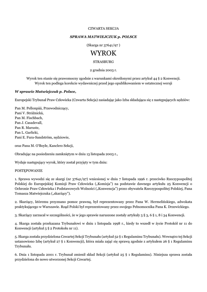CZWARTA SEKCJA SPRAWA MATWIEJCZUK p. POLSCE (Skarga nr 37641/97 ) WYROK STRASBURG 2 grudnia 2003 r. Wyrok ten stanie się prawomocny zgodnie z warunkami określonymi przez artykuł 44 § 2 Konwencji. Wyrok ten podlega korekcie wydawniczej przed jego opublikowaniem w ostatecznej wersji W sprawie Matwiejczuk p. Polsce, Europejski Trybunał Praw Człowieka (Czwarta Sekcja) zasiadając jako Izba składająca się z następujących sędziów: Pan M. Pellonpää, Przewodniczący, Pani V. Strážnická, Pan M. Fischbach, Pan J. Casadevall, Pan R. Maruste, Pan L. Garlicki, Pani E. Fura-Sandström, sędziowie, oraz Pana M. O'Boyle, Kanclerz Sekcji, Obradując na posiedzeniu zamkniętym w dniu 13 listopada 2003 r., Wydaje następujący wyrok, który został przyjęty w tym dniu: POSTĘPOWANIE 1. Sprawa wywodzi się ze skargi (nr 37641/97) wniesionej w dniu 7 listopada 1996 r. przeciwko Rzeczypospolitej Polskiej do Europejskiej Komisji Praw Człowieka („Komisja”) na podstawie dawnego artykułu 25 Konwencji o Ochronie Praw Człowieka i Podstawowych Wolności („Konwencja”) przez obywatela Rzeczypospolitej Polskiej, Pana Tomasza Matwiejczuka („skarżący”). 2. Skarżący, któremu przyznano pomoc prawną, był reprezentowany przez Pana W. Hermelińskiego, adwokata praktykującego w Warszawie. Rząd Polski był reprezentowany przez swojego Pełnomocnika Pana K. Drzewickiego. 3. Skarżący zarzucał w szczególności, że w jego sprawie naruszone zostały artykuły 5 § 3, 6 § 1, 8 i 34 Konwencji. 4. Skarga została przekazana Trybunałowi w dniu 1 listopada 1998 r., kiedy to wszedł w życie Protokół nr 11 do Konwencji (artykuł 5 § 2 Protokołu nr 11). 5. Skarga została przydzielona Czwartej Sekcji Trybunału (artykuł 52 § 1 Regulaminu Trybunału). Wewnątrz tej Sekcji ustanowiono Izbę (artykuł 27 § 1 Konwencji), która miała zająć się sprawą zgodnie z artykułem 26 § 1 Regulaminu Trybunału. 6. Dnia 1 listopada 2001 r. Trybunał zmienił skład Sekcji (artykuł 25 § 1 Regulaminu). Niniejsza sprawa została przydzielona do nowo utworzonej Sekcji Czwartej. 7. Skarżący i Rząd przedłożyli swoje stanowiska co do meritum skargi (artykuł 59 § 1). 8. Decyzją z dnia 4 czerwca 2002 r. Trybunał uznał skargę za częściowo dopuszczalną. FAKTY I. OKOLICZNOŚCI SPRAWY 9. Skarżący urodził się w 1966 r. Obecnie tymczasowo przebywa w zakładzie karnym w Radomiu. A. Tymczasowe aresztowanie skarżącego i proces 1. Zatrzymanie i tymczasowe aresztowanie 10. W lipcu 1996 r. skarżący został zwolniony z więzienia. Dnia 11 września 1996 r. został zatrzymany przez policję. Policja podejrzewała, że dnia 10 września 1996 r. skarżący dokonał rozboju i zgwałcenia. W tym samym czasie, policja poszukiwała go w oparciu o list gończy wydany przez Sąd Rejonowy w Pruszkowie w postępowaniu karnym toczącym się przeciwko skarżącemu przed tym sądem. 11. Dnia 13 września 1996 r. Sąd Rejonowy w Warszawie podjął decyzję o tymczasowym aresztowaniu skarżącego pod zarzutem rozboju z użyciem niebezpiecznego narzędzia oraz zgwałcenia. Sąd wziął pod uwagę fakt, że nie miał on stałego miejsca pobytu oraz, że jego wspólnicy nie zostali zatrzymani. 12. Dnia 8 listopada 1996 r. Sąd Wojewódzki w Warszawie oddalił zażalenie skarżącego na postanowienie sądu rejonowego o tymczasowym aresztowaniu. Sąd wojewódzki uznał, że aresztowanie skarżącego było uzasadnione istnieniem poważnych dowodów jego winy, powagą ciążących na nim zarzutów, ryzykiem zmowy, faktem, że nie miał stałego miejsca pobytu oraz tym, że był bezrobotny. Dodatkowo, sąd zauważył, że policja nie ujęła wspólników skarżącego oraz istniało ryzyko, iż jeżeli zostanie on zwolniony, będzie się ukrywał. W podsumowaniu sąd stwierdził, że w przypadku skarżącego nie zachodzą przyczyny uchylenia przewidziane w artykule 218 Kodeksu karnego. 13. Dnia 10 grudnia 1996 r. Sąd Wojewódzki w Warszawie przedłużył tymczasowe aresztowanie skarżącego do dnia 11 marca 1997 r. 14. Dnia 19 grudnia Sąd Wojewódzki w Warszawie oddalił wniosek skarżącego o uchylenie tymczasowego aresztowania. Oddalając wniosek sąd wskazał na powagę zarzutów przedstawionych skarżącemu oraz na duże prawdopodobieństwo popełnienia przez skarżącego zarzucanych mu czynów. 15. W okresie od 20 stycznia do 27 lutego 1997 r. prokuratura podjęła decyzję o konieczności przeprowadzenia dowodu z opinii pięciu biegłych oraz zażądała od szpitala psychiatrycznego, w którym leczony był skarżący jego dokumentacji medycznej. 16. Dnia 4 marca 1997 r. Sąd Wojewódzki w Warszawie wyznaczył adwokata do obrony skarżącego. 17. Dnia 5 marca 1997 r. do prokuratury zostały dostarczone opinie dwóch biegłych. Dnia 7 marca 1997 r. prokurator rejonowy przesłuchał ofiarę zgwałcenia. 18. Dnia 10 marca 1997 r. Sąd Apelacyjny w Warszawie uwzględnił wniosek złożony przez prokuratora i przedłużył tymczasowe aresztowanie skarżącego do dnia 11 maja 1997 r. Sąd oparł się na wadze zarzucanych skarżącemu czynów i podstawach aresztu przewidzianych w artykule 217 §§ 1 i 2 Kodeksu postępowania karnego. Ponadto wskazał, że jeden z oskarżonych nadal się ukrywał oraz że natychmiast po popełnieniu zarzucanego czynu “doszło do próby kontaktu z ofiarą [napaści]”. Sąd zgodził się także ze stanowiskiem prokuratora, że śledztwo nie zostało jeszcze zakończone, ponieważ przeprowadzone miały jeszcze być pewne dowody z zakresu medycyny sądowej, skarżący oraz inny współoskarżony przebywali nadal pod obserwacją psychiatryczną, a policja starała się ująć trzeciego oskarżonego. Skarżący odwołał się od tej decyzji do Sądu Najwyższego. 19. Pomiędzy 8 a 18 kwietnia 1997 r. prokurator otrzymał dwie opinie biegłych i zadecydował, że konieczne będzie przeprowadzenie testów DNA. 20. Dnia 24 kwietnia 1997 r. Sad Najwyższy oddalił zażalenie skarżącego n