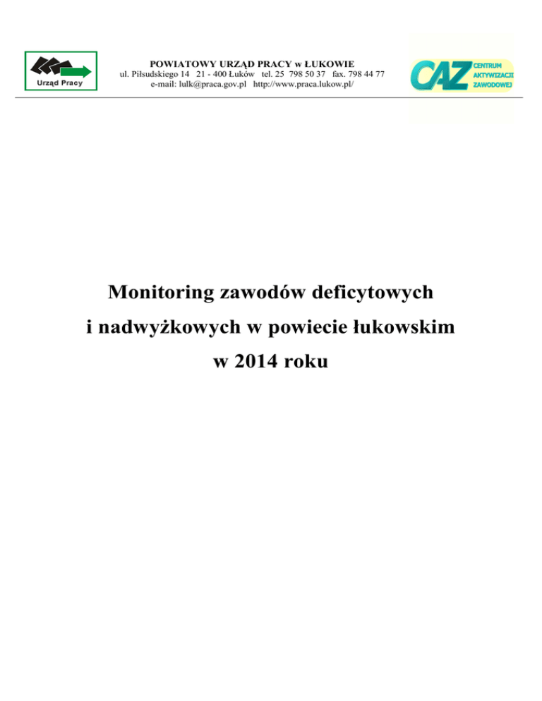 POWIATOWY URZĄD PRACY w ŁUKOWIE ul. Piłsudskiego 14 21 - 400 Łuków tel. 25 798 50 37 fax. 798 44 77 e-mail: [email protected] http://www.praca.lukow.pl/ Monitoring zawodów deficytowych i nadwyżkowych w powiecie łukowskim w 2014 roku Spis treści .......................................................................................................... 2 WSTĘP ............................................................................................................. 3 Rozdział 1. Poziom bezrobocia w powiecie łukowskim .................................. 5 Rozdział 2. Analiza bezrobocia w powiecie wg zawodów (grup zawodów).. 9 2.1. Napływ bezrobotnych wg zawodów (grup zawodów) .........................................10 2.2. Zawody generujące długotrwałe bezrobocie........................................................12 Rozdział 3. Analiza ofert pracy zarejestrowanych w powiecie wg zawodów (grup zawodów) .............................................................................................. 14 Rozdział 4. Analiza zawodów deficytowych i nadwyżkowych .................. 17 4.1. Zawody deficytowe.............................................................................................17 4.2. Zawody nadwyżkowe..........................................................................................20 4.3. Zawody zrównoważone.......................................................................................22 Rozdział 4. Osoby Bezrobotne i oferty pracy wg Polskiej Klasyfikacji Działalności..................................................................................................... 25 WNIOSKI ....................................................................................................... 27 2 WSTĘP Prezentowany monitoring zawodów deficytowych i nadwyżkowych w powiecie łukowskim w 2014 roku, jest kolejnym cyklicznym opracowaniem, który stanowi kompleksową analizę zjawiska bezrobocia notowanego w Powiatowym Urzędzie Pracy w Łukowie wśród mieszkańców powiatu łukowskiego w 2014 roku oraz według danych i stanu z dnia 31.12.2014 r. Monitoring zawodowych deficytowych i nadwyżkowych jest procesem systematycznego obserwowania zjawisk zachodzących na rynku pracy dotyczących kształtowania popytu na pracę i podaży zasobów pracy w przekroju terytorialno – zawodowym oraz formowania na tej podstawie ocen, wniosków i krótkotrwałych prognoz niezbędnych dla określenia potrzeb szkoleniowych bezrobotnych i kształcenia zawodowego. Zawody deficytowe i nadwyżkowe wyznaczane są w oparciu o następujące mierniki: 1. średnią miesięczną nadwyżkę (deficyt) podaży siły roboczej, 2. wskaźnik intensywności nadwyżki (deficytu) zawodów, 3. wskaźnik długotrwałego bezrobocia, 4. wskaźnik szansy uzyskania oferty, 5. strukturę bezrobotnych i ofert pracy według zawodów i PKD. Niniejsze opracowanie zostało sporządzone w oparciu o tablice wynikowe zaimplementowane do Aplikacji Monitoring Zawodów. Aplikacja (MZ) pozwala na wykorzystanie w formie edycji zestawień zawierających wyliczone wskaźniki umożliwiające określenie zawodów deficytowych i nadwyżkowych, jak również pozwala na przeprowadzenie analizy i interpretacji uzyskanych wyników. Monitoring zawodów deficytowych i nadwyżkowych przeprowadzono w oparciu o klasyfikację zawodów i specjalności, która służy ujednoliceniu nazewnictwa zawodów i specjalności występujących na rynku pracy. Struktura klasyfikacji jest wynikiem grupowania poszczególnych zawodów i specjalności w grupy elementarne, a te z kolei w bardziej zasegregowane grupy średnie, duże i wielkie, na podstawie podobieństwa kwalifikacji zawodowych wymaganych do realizacji zadań danego zawodu (specjalności) z uwzględnieniem obydwu aspektów kwalifikacji, tj. ich poziomu i specjalizacji. W końcowym efekcie struktura klasyfikacji obejmuje: 10 grup wielkich, 43 grupy duże (wewnętrzny podział grup wielkich – kod dwucyfrowy), 132 grupy średnie (wewnętrzny podział grup dużych – kod trzycyfrowy), 444 grypy elementarne (wewnętrzny podział grup średnich – kod czterocyfrowy), grupy elementarne obejmują 2360 zawodów i specjalności (kod sześciocyfrowy). Dokonana analiza została przygotowana według zaleceń metodycznych Ministerstwa Pracy i Polityki Społecznej oraz zgodnie z art. 9 ust. 1 pkt. 9 Ustawy o promocji zatrudnienia i instytucjach rynku pracy z dnia 20 kwietnia 2004 r. Prezentowane w opracowaniu zestawienia informacje i dane przedstawiają zmiany jakie zachodzą na lokalnym rynku pracy. Podobnie jak w poprzednim roku w określonych zawodach, dużych i elementarnych grupach zawodowych oraz w wybranych branżach jest i prawdopodobnie będzie dużo trudniej o pracę, dlatego tak istotną rolę pełni monitoring zawodów deficytowych i nadwyżkowych. Stała analiza pracodawców na pracowników o określonych kwalifikacjach pozwala poprzez lepsze dopasowanie kompetencji lub reorientację zawodową osób poszukujących pracy, spełnić oczekiwania kadrowe pracodawców. Ranking ma istotne znaczenie również w wyznaczaniu kierunków szkolenia bezrobotnych, usprawnienia poradnictwa zawodowego oraz ułatwieniu realizacji programów aktywizujących osoby bezrobotne w celu promowania ich zatrudnienia. Monitoring zawodów deficytowych i nadwyżkowych jest skierowany także do osób bezrobotnych, poszukujących pracy, uczących się jak również wszelkich instytucji edukacyjnych i szkoleniowych. Opracowanie to może służyć przedstawicielom instytucji rynku pracy, przedstawicielom instytucji edukacyjnych na zapoznanie się ze skalą niedostosowania struktury zawodów do potrzeb rynku pracy. Podstawowym źródłem danych, które zostały wykorzystane w niniejszym raporcie diagnostycznym są: − załącznik 2 do sprawozdania MPiPS - 01 – bezrobotni według rodzaju działalności ostatniego miejsca pracy, poszukujący pracy oraz wolne miejsca pracy i aktywizacji zawodow