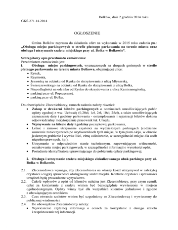 Bolków, dnia 2 grudnia 2014 roku GKŚ.271.14.2014 OGŁOSZENIE Gmina Bolków zaprasza do składania ofert na wykonanie w 2015 roku zadania pn.: „Obsługa miejsc parkingowych w strefie płatnego parkowania na terenie miasta oraz obsługa i utrzymanie szaletu miejskiego przy ul. Bolka w Bolkowie”. Szczegółowy opis przedmiotu zamówienia: Przedmiotem zamówienia jest: 1. Obsługa miejsc parkingowych, wyznaczonych na drogach gminnych w strefie płatnego parkowania na terenie miasta Bolkowa, obejmującej ulice: • Rynek, • Reymonta, • Jaworską na odcinku od Rynku do skrzyżowania z ulicą Młynarską, • Świerczewskiego na odcinku od Rynku do skrzyżowania z ulicą Bolka, • Niepodległości na odcinku od Rynku do skrzyżowania z ulicą Kamiennogórską, • parkingi przy ul. Poprzecznej, • parking przy ul. Bolka, Do obowiązków Zleceniobiorcy, ramach zadania należy również: • Zakup w drukarni biletów parkingowych o nominałach umożliwiających pobór opłaty zgodnej z ww. Uchwałą (0,20zł, 1zł, 2zł, 10zł, 25zł), a także umożliwiających zaznaczenie daty i godziny parkowania - ostemplowania i rejestracji biletów dokona odpowiedzialny merytorycznie pracownik tut. Urzędu, • Wpisywanie na bilecie daty i godziny początkowej parkowania, • Letnie i zimowe utrzymanie czystości na wydzielonych parkingach (codzienne usuwanie zanieczyszczeń po użytkownikach tych miejsc, w tym plam oleju, w okresie jesiennym grabienie i wywóz liści, zimą odśnieżanie, w szczególności miejsc dla osób niepełnosprawnych, itp.), • Utrzymanie w odpowiednim stanie technicznym, zapewniającym widoczność, oznakowania miejsc parkingowych, w szczególności informacji o wysokości opłat, • Posiadanie identyfikatora uprawniającego do pobierania opłaty parkingowej. 2. Obsługa i utrzymanie szaletu miejskiego zlokalizowanego obok parkingu przy ul. Bolka w Bolkowie. 2.1. Zleceniodawca wymaga, aby zleceniobiorca na własny koszt utrzymywał w należytej czystości i ciągłej sprawności obsługiwany szalet miejski. Kontrole czystości i sprawności urządzeń będą prowadzone wyrywkowo. 2.2. Całość wpływów z opłat od klientów należna jest Zleceniobiorcy, przy czym cennik opłat za korzystanie z szaletu winien być bezwzględnie wywieszony w miejscu ogólnodostępnym. Opłaty winny być dla wszystkich klientów jednakowe i zgodne z obowiązującym cennikiem. 2.3. Czas otwarcia szaletów winien być uzgodniony ze Zleceniodawcą i wywieszony do publicznej wiadomości. 2.4. Do obowiązków Zleceniobiorcy należy: • Wywieszenie czytelnej informacji o cenach za korzystanie z danego szaletu i respektowanie tej informacji. • • • • • • Wyposażenie szaletu w artykuły toaletowe i środki czystości (papier, mydło w płynie, ręczniki papierowe, środki zapachowe, itp.). Utrzymanie czystości i estetyki w szaletach oraz w ich otoczeniu, zgodnie z zaleceniami Inspektora Sanitarnego, w tym zapewnienie ciągłej dostawy bieżącej wody oraz energii elektrycznej, niezbędnych do zachowania odpowiednich standardów higienicznych w czasie użytkowania szaletu. Dokonywanie opłat eksploatacyjnych z tytułu funkcjonowania szaletu (energia elektryczna, woda + ścieki). Wykonywanie drobnych napraw i remontów bieżących na własny koszt (naprawa baterii, spłuczek, szyldów, zamków, oświetlenia oraz częściowe malowanie). Zabezpieczenie przed zamarznięciem i zniszczeniem w okresie zimowym instalacji wodnej oraz kanalizacyjnej w obrębie szaletu. Pisemne zgłaszanie Zleceniodawcy wszelkich usterek wymagających wymiany wyeksploatowanych urządzeń lub przeprowadzenia kosztownych remontów na koszt Zleceniodawcy. Dodatkowe wymagania Zleceniodawcy: - cenę oferty należy przedstawić w postaci procentowej miesięcznych wpływów ze sprzedaży biletów parkingowych brutto, którą Zleceniobiorca odprowadzi wpłacając do Kasy lub na konto Zleceniodawcy. Pozostała kwota, to zysk Zleceniobiorcy. - rozliczenie z Wykonawcą odbędzie się na podstawie comiesięcznych faktur, - płatność przelewem do 14 dni od dnia wystawienia faktury. Dodatkowych informacji związanych z przygotowaniem oferty oraz jej zakresem, udziela Kierownik Referatu GKŚ Urzędu Miejskiego w Bolkowie - Radosław Łukasiński tel. 75 7413213 wew. 31 w godzinach pracy Urzędu Oferty należy składać w zamkniętej kopercie w siedzibie Zleceniodawcy pokój nr 9 lub przesłać na adres: Urząd Miejski w Bolkowie, ul. Rynek 1, 59-420 Bolków, z dopiskiem „Obsługa miejsc parkingowych w strefie płatnego parkowania na terenie miasta oraz obsługa i utrzymanie szaletu miejskiego przy ul. Bolka w Bolkowie”, w terminie do godz. 10:00 dnia 11 grudnia 2014. Otwarcie komisyjne ofert odbędzie się o godz. 10.05 dnia 11.12.2014 roku w pok. nr 7. Z poważaniem Burmistrz Bolkowa mgr Jarosław Wroński