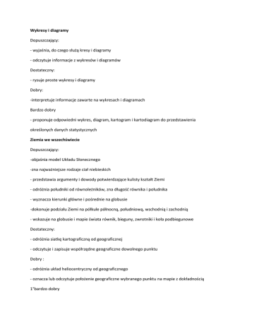 Wykresy i diagramy Dopuszczający: - wyjaśnia, do czego służą kresy i diagramy - odczytuje informacje z wykresów i diagramów Dostateczny: - rysuje proste wykresy i diagramy Dobry: -interpretuje informacje zawarte na wykresach i diagramach Bardzo dobry - proponuje odpowiedni wykres, diagram, kartogram i kartodiagram do przedstawienia określonych danych statystycznych Ziemia we wszechświecie Dopuszczający: -objaśnia model Układu Słonecznego -zna najważniejsze rodzaje ciał niebieskich - przedstawia argumenty i dowody potwierdzające kulisty kształt Ziemi - odróżnia południki od równoleżników, zna długośd równika i południka - wyznacza kierunki główne i pośrednie na globusie -dokonuje podziału Ziemi na półkule północną, południową, wschodnią i zachodnią - wskazuje na globusie i mapie świata równik, bieguny, zwrotniki i koła podbiegunowe Dostateczny: - odróżnia siatkę kartograficzną od geograficznej - odczytuje i zapisuje współrzędne geograficzne dowolnego punktu Dobry : - odróżnia układ heliocentryczny od geograficznego - oznacza lub odczytuje położenie geograficzne wybranego punktu na mapie z dokładnością 1°bardzo dobry - wykazuje zniekształcenia siatki kartograficznej - wyznacza południk miejscowy przy użyciu gnomonu - objaśnia naukowe i praktyczne znaczenie odkrycia Mikołaja Kopernika -wyjaśnia czym jest długośd i szerokośd geograficzna Ruchy Ziemi i ich skutki Dopuszczający: - podaje kierunek i czas obrotu Ziemi wokół osi - wyjaśnia następstwo dnia i nocy jako skutek ruchu obrotowego - podaje czas jednego obiegu Ziemi wokół Słooca - podaje daty rozpoczęcia astronomicznych pór roku na półkuli północnej i południowej - wie, że moment górowania Słooca pokrywa się z momentem południa na południku Dostateczny: - odczytuje czas strefowy na mapie stref czasowych Ziemi - podaje kąt i kierunek nachylenia osi ziemskiej do płaszczyzny orbity - wyjaśnia różnicę w długości trwania roku kalendarzowego raz na cztery lata - wyjaśnia zależnośd między wysokością Słooca a temperaturą Ziemi - podaje nazwy stref oświetleniowych i wskazuje ich granice - podaje długośd trwania dnia i nocy na równiku w ciągu roku Dobry - wskazuje na globusie moment wschodu, południa i zachodu w czasie ruchu obrotowego - wyjaśnia zależnośd między czasem miejscowym a długością geograficzną - wyznacza różnicę długości geograficznej na podstawie różnicy czasów miejscowych - wyjaśnia koniecznośd ustalenia czasu urzędowego na obszarach niektórych paostw - odróżnia czasy: miejscowy, strefowy i urzędowy- określa przesuwanie się miejsc wschodu i zachodu Słooca w ciągu roku - rysuje oświetlenie Ziemi w pierwszych dniach astronomicznych pór roku - wyjaśnia zjawisko dni i nocy polarnych Bardzo dobry: - oblicza czas miejscowy na podstawie różnicy odległości geograficznej - ustala datę przy przekroczeniu linii zmiany daty - wyjaśnia zmiany długości dnia i wysokości Słooca nad horyzontem w ciągu roku - wyjaśnia skutki ruchu obiegowego Ziemi -odróżnia strefy oświetlenia ziemi na podstawie długości trwania dnia i nocy oraz wysokości i kierunku górowania Słooca Atmosfera Dopuszczający: -zna nazwy geosfer na Ziemi i wie co obejmują - definiuje terminy pogoda i klimat - wymienia składniki pogody i klimatu - wskazuje na mapie klimatycznej zasięg stref klimatycznych - odczytuje diagramy klimatyczne -mierzy i opisuje podstawowe składniki pogody i klimatu Dostateczny: - wyjaśnia, co to jest wiatr i jak powstaje - wymienia czynniki kształtujące klimat - podaje przykłady oddziaływania czynników klimatotwórczych na klimat -oblicz średnią temp. powietrza i amplitudę temp. Dobry : -podaje przykłady zależności między geosferami- opisuje cyrkulację pasatową i monsunową na Ziemi - porównuje wiatry monsunowe z bryzą - wykazuje na przykładach zależnośd gospodarczej działalności człowieka od klimatu Bardzo dobry - wyjaśnia i opisuje cyrkulację powietrza na Ziemi - wykazuje związki między ciśnieniem atmosferycznym, temperaturą powietrza i opadami - opisuje roczny przebieg temperatury powietrza i sum opadów w poszczególnych strefach klimatycznych - czyta i analizuje mapy klimatyczne Hydrosfera Dopuszczająca: - opisuje obieg wody w przyrodzie - zna nazwy oceanów i wskazuje je na mapie i globusie - zna typy mórz i wskazuje na mapie ich przykłady - zna i podpisuje na rysunku formy ukształtowania powierzchni dna oceanicznego - wskazuje na mapie przykłady prądów morskich - podaje przykłady zanieczyszczeo wód powierzchniowych powstałe w wyniku działalności człowieka -wyjaśnia pojęcia: warstwa wodonośna, źródło, wody zaskórne, gruntowe i głębinowe, jeziora, rzeki -zna rodzaje jezior i potrafi wskazad na mapie ich przykłady Dostateczna: - podaje przykłady niszczącej i budującej działalności fal morskich - wyjaśnia, na czym polegają zjawiska krasowe - wskazuje na mapie typowe obszary występowania studni artezyjskich, gejzerów i zjawisk krasowych- określa warunki powstawania lodowców górskich i lądolodów Dobra - wie, jakie ruchy wykonuje woda morska i wymienia przyczyny ich powstania - nazywa i wskazuje na mapie różne typy wybrzeży - podaje przykłady wykorzystania wód podziemnych - wyjaśnia pojęcia rzeka główna, system rzeczny, dorzecze, dział wodny, zlewisko, obszar bezodpływowy i wskazuje na mapie przykłady Bardzo dobra: - opisuje działalnośd rzeki w biegu górnym, środkowym i dolnym - objaśnia schemat powstawania przypływów i odpływów - wymienia sposoby ochrony wód przed zanieczyszczeniami - opisuje warunki występowania wód artezyjskich i gejzerów Litosfera i pedosfera Dopuszczający: - przedstawia budowę Ziemi - rozpoznaje wybrane okazy skał magmowych i osadowych (granit, bazalt, wapieo, sól kamienna, piasek, żwir, glinę, piaskowiec) - odróżnia skamieniałości od skał - podaje przykłady współczesnych pro